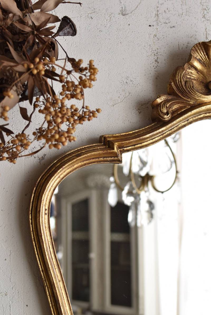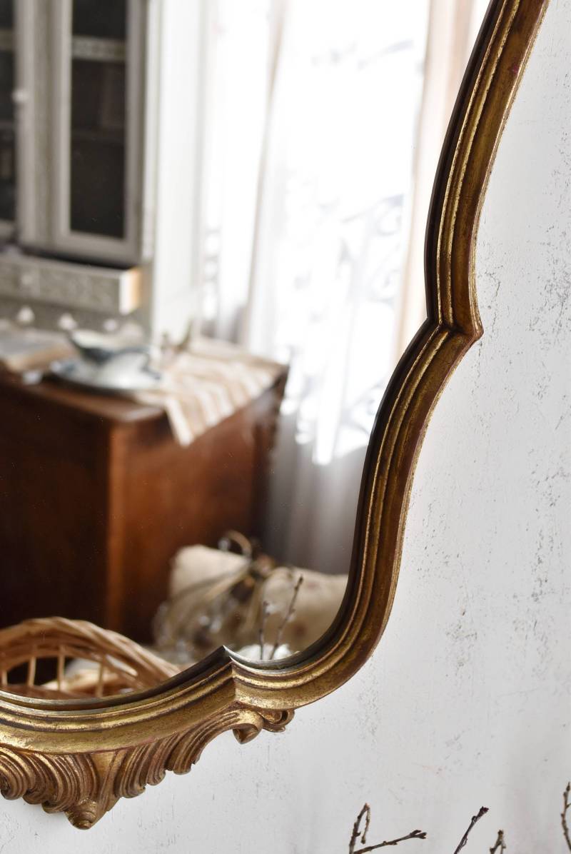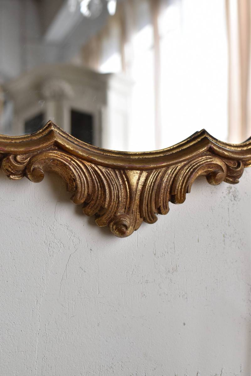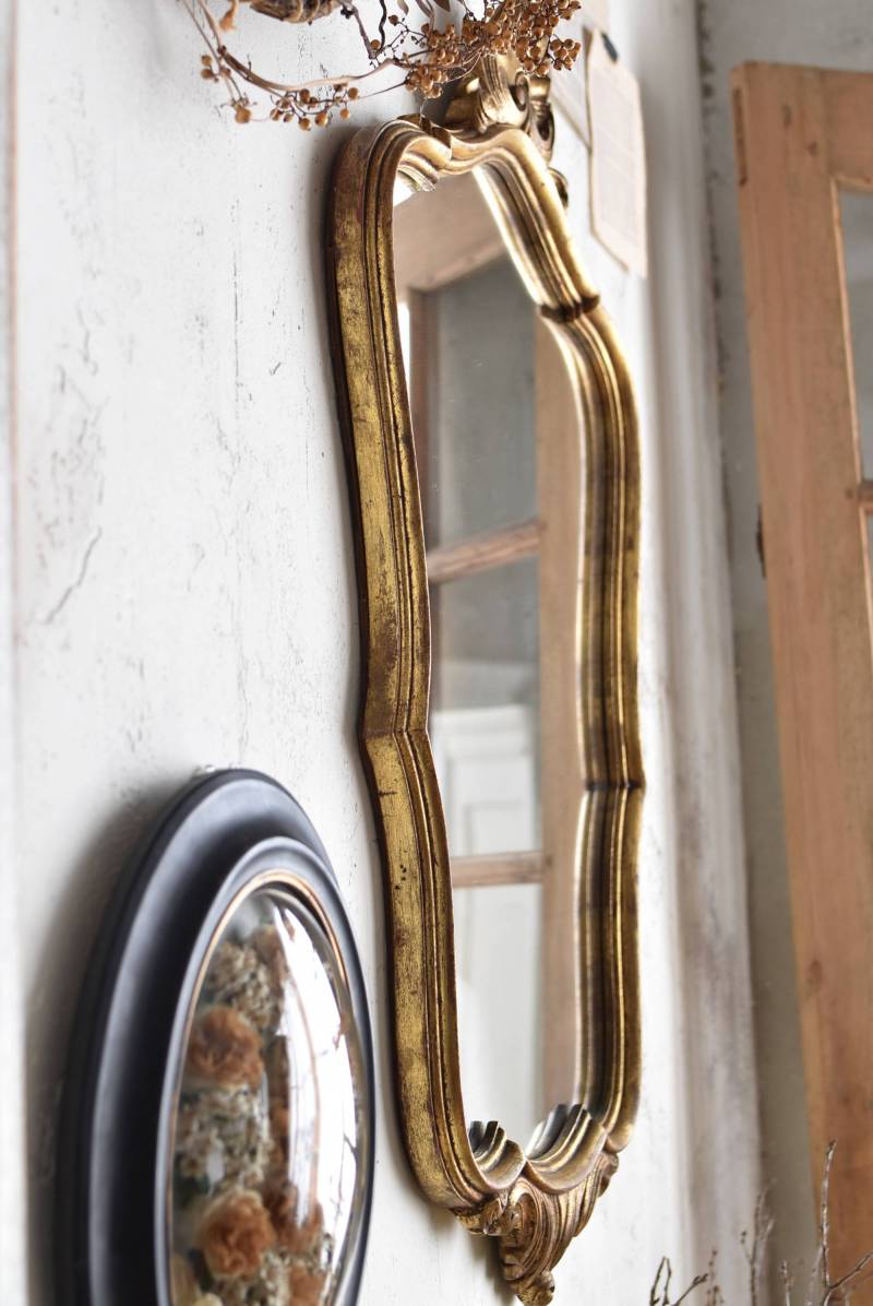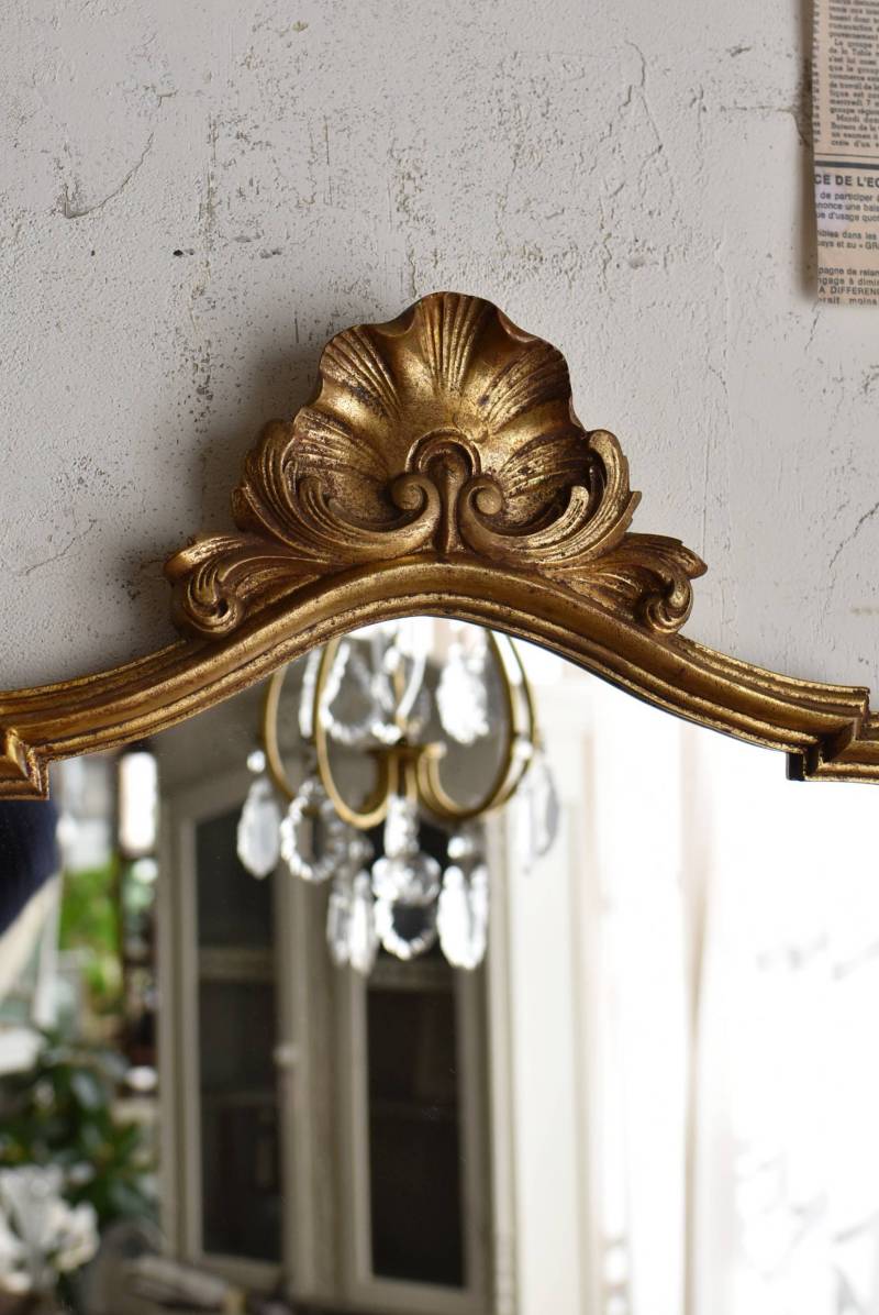 壁面にパッと明るい印象をもたらしてくれるフレンチミラー。 比較的大きめのサイズとなり、程よく幅のある縁取りの立体的かつエッジの効いた形状で囲まれ、洗練された美しさを感じられます。上部に施された優しげなシェル装飾がバランス良く、深みのあるゴールドカラーが品格のある姿です。 鏡面は新しいものに交換しています。奥行きが浅めのデザインで、しなやかなシルエットによって豊かな個性をもたらし、実用しながらもインテリアとして優雅な雰囲気を演出してくれます。 W 約50cm D 約4cm H 約79.5cm 鏡面積 W約44.5cm×D約60cm 重量 約3.7kg こちらの商品の配送について