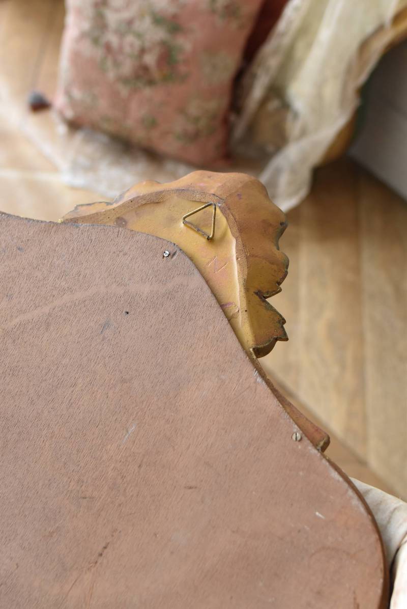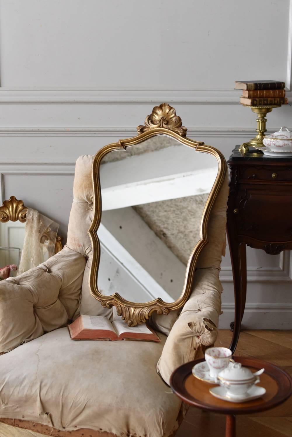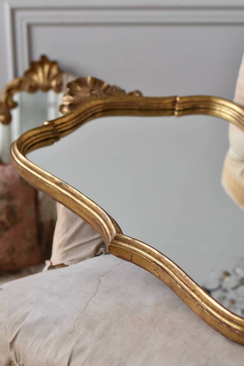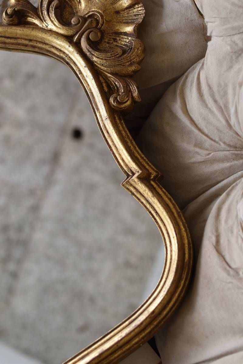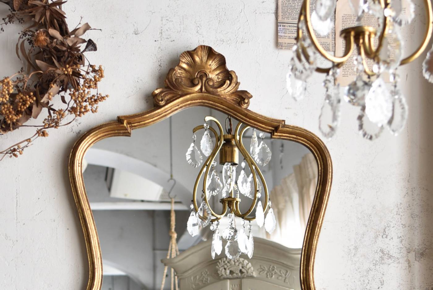 壁面にパッと明るい印象をもたらしてくれるフレンチミラー。 比較的大きめのサイズとなり、程よく幅のある縁取りの立体的かつエッジの効いた形状で囲まれ、洗練された美しさを感じられます。上部に施された優しげなシェル装飾がバランス良く、深みのあるゴールドカラーが品格のある姿です。 鏡面は新しいものに交換しています。奥行きが浅めのデザインで、しなやかなシルエットによって豊かな個性をもたらし、実用しながらもインテリアとして優雅な雰囲気を演出してくれます。 W 約50cm D 約4cm H 約79.5cm 鏡面積 W約44.5cm×D約60cm 重量 約3.7kg こちらの商品の配送について