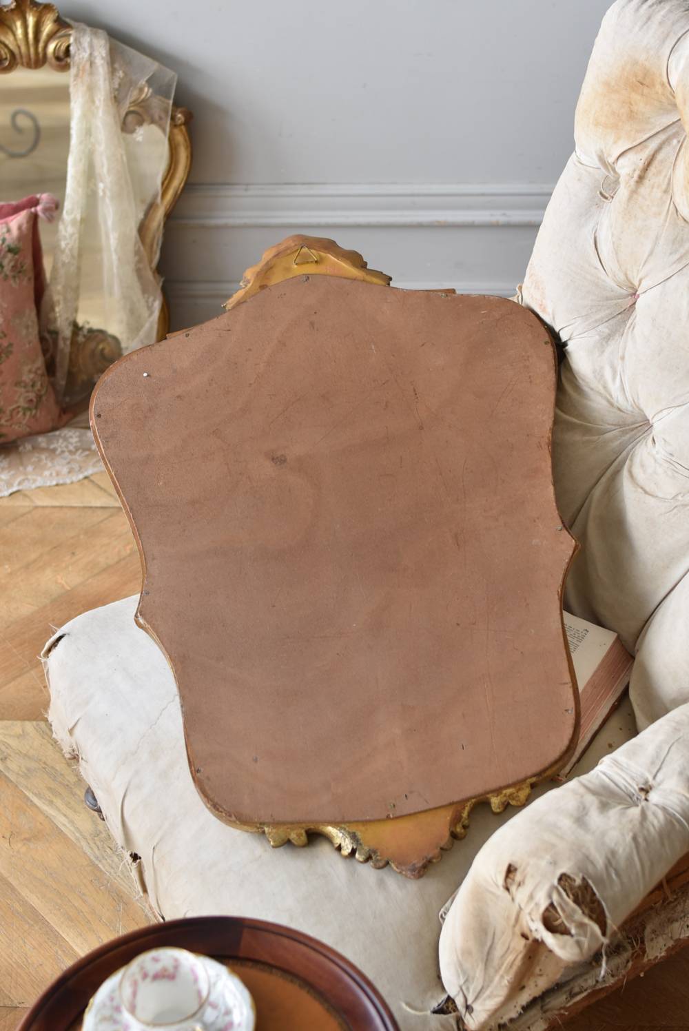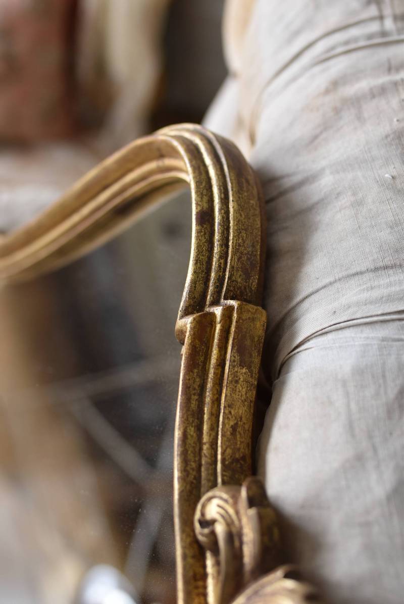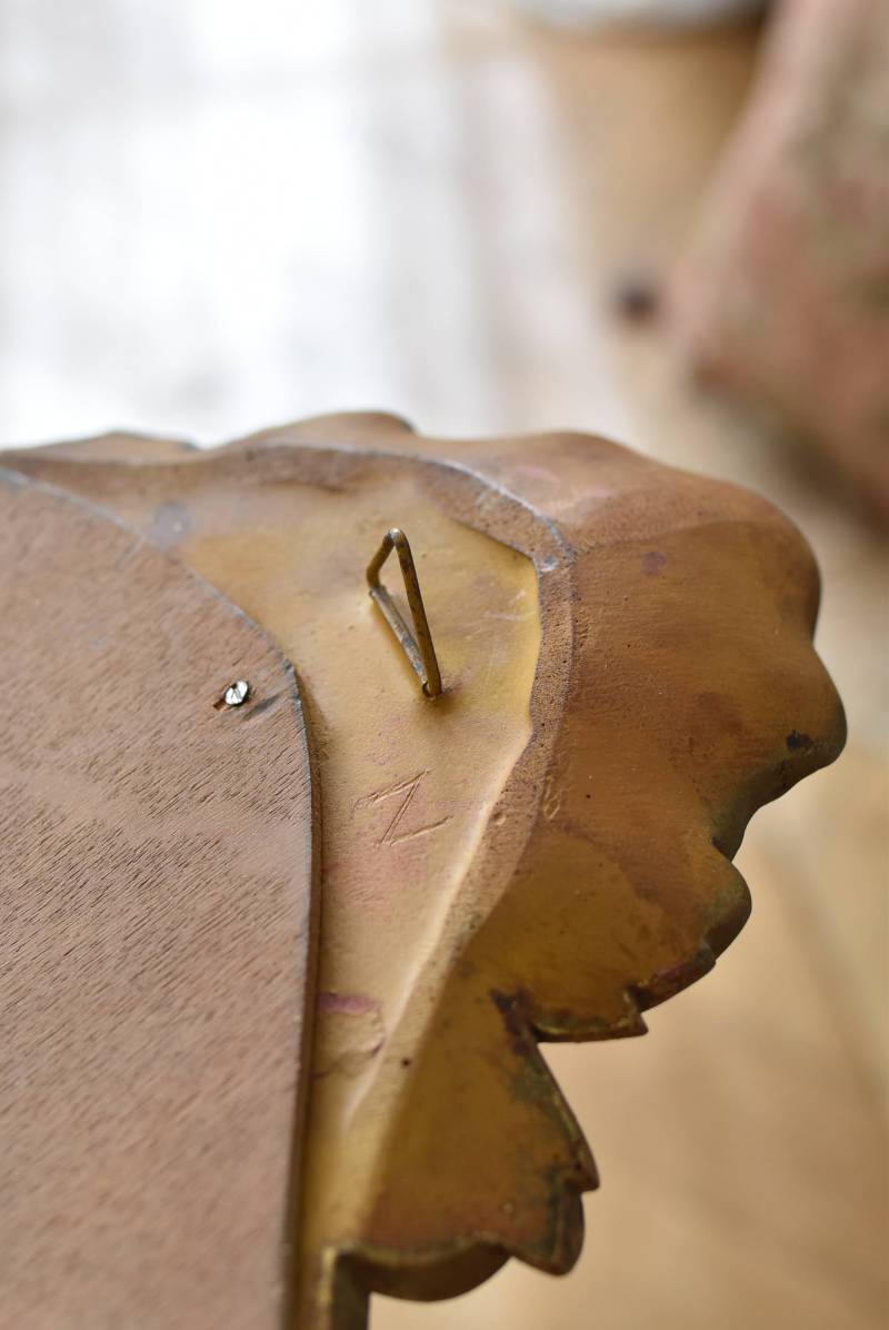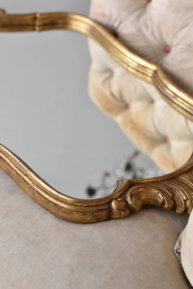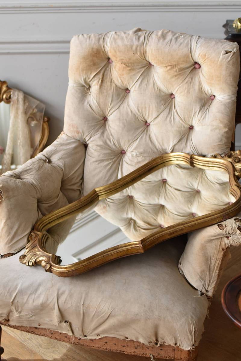 壁面にパッと明るい印象をもたらしてくれるフレンチミラー。 比較的大きめのサイズとなり、程よく幅のある縁取りの立体的かつエッジの効いた形状で囲まれ、洗練された美しさを感じられます。上部に施された優しげなシェル装飾がバランス良く、深みのあるゴールドカラーが品格のある姿です。 鏡面は新しいものに交換しています。奥行きが浅めのデザインで、しなやかなシルエットによって豊かな個性をもたらし、実用しながらもインテリアとして優雅な雰囲気を演出してくれます。 W 約50cm D 約4cm H 約79.5cm 鏡面積 W約44.5cm×D約60cm 重量 約3.7kg こちらの商品の配送について