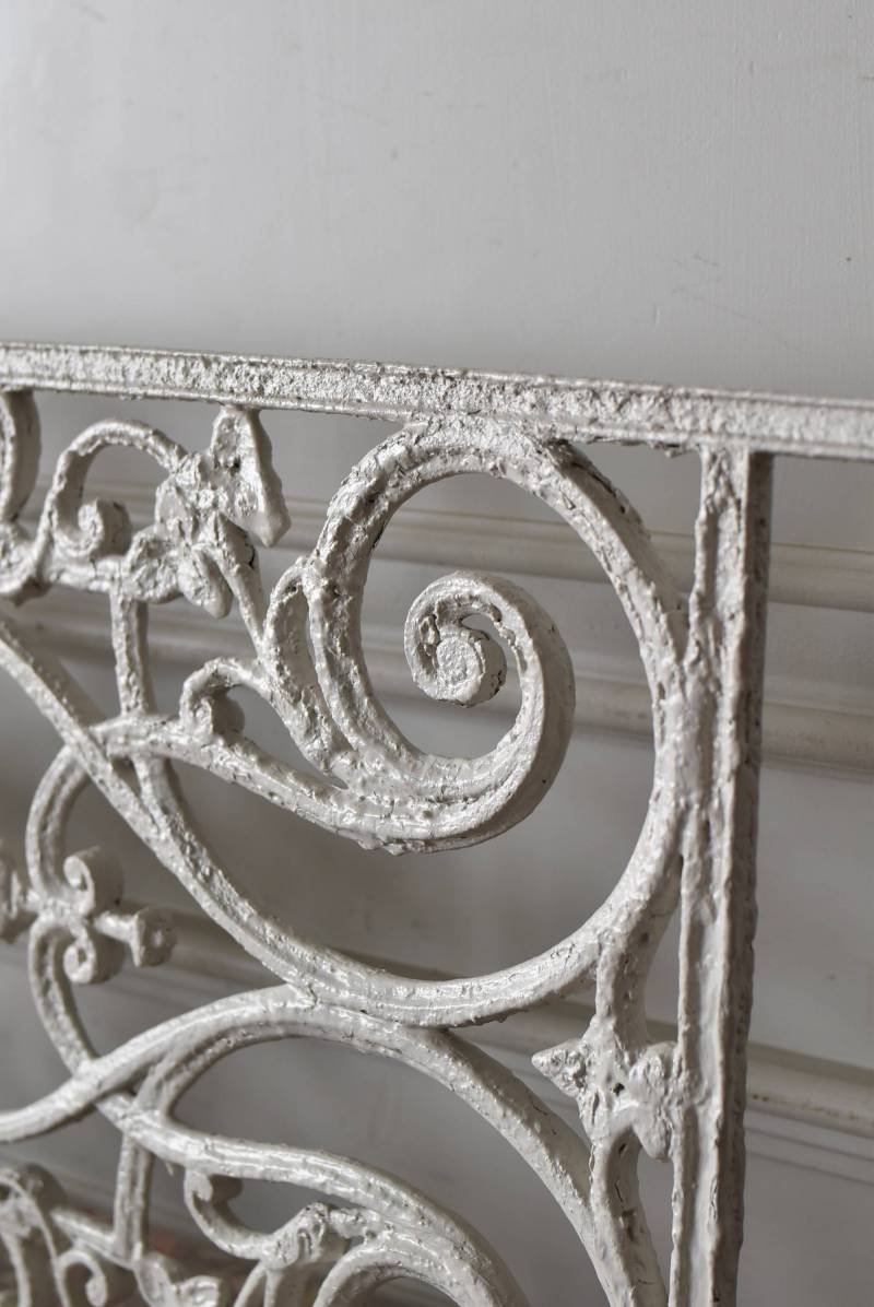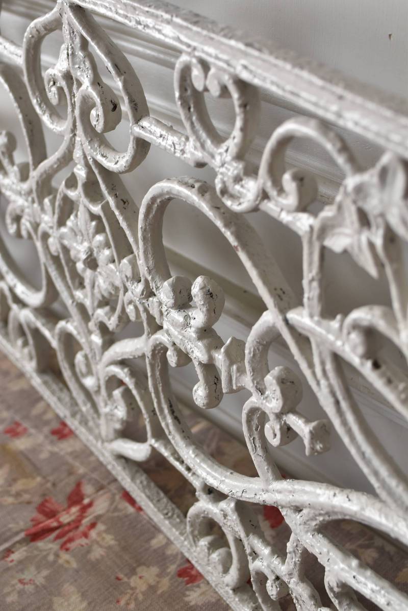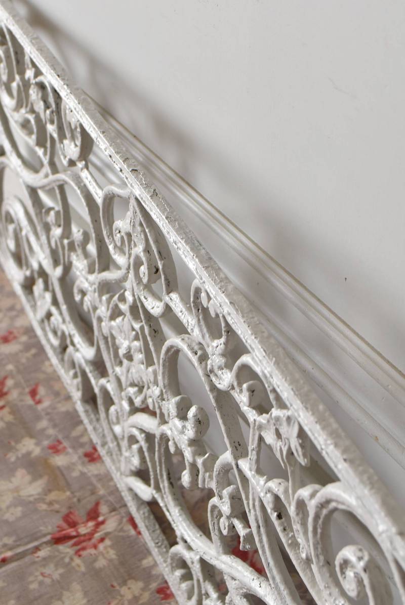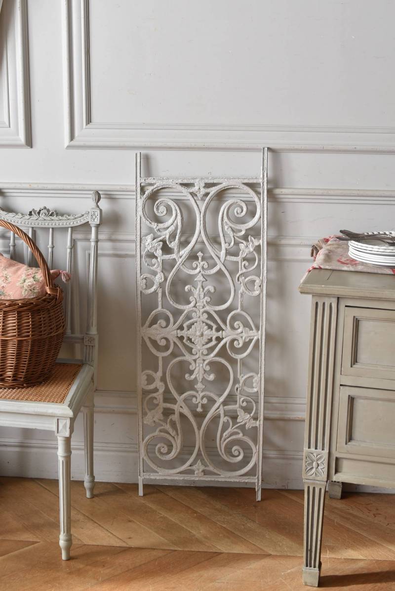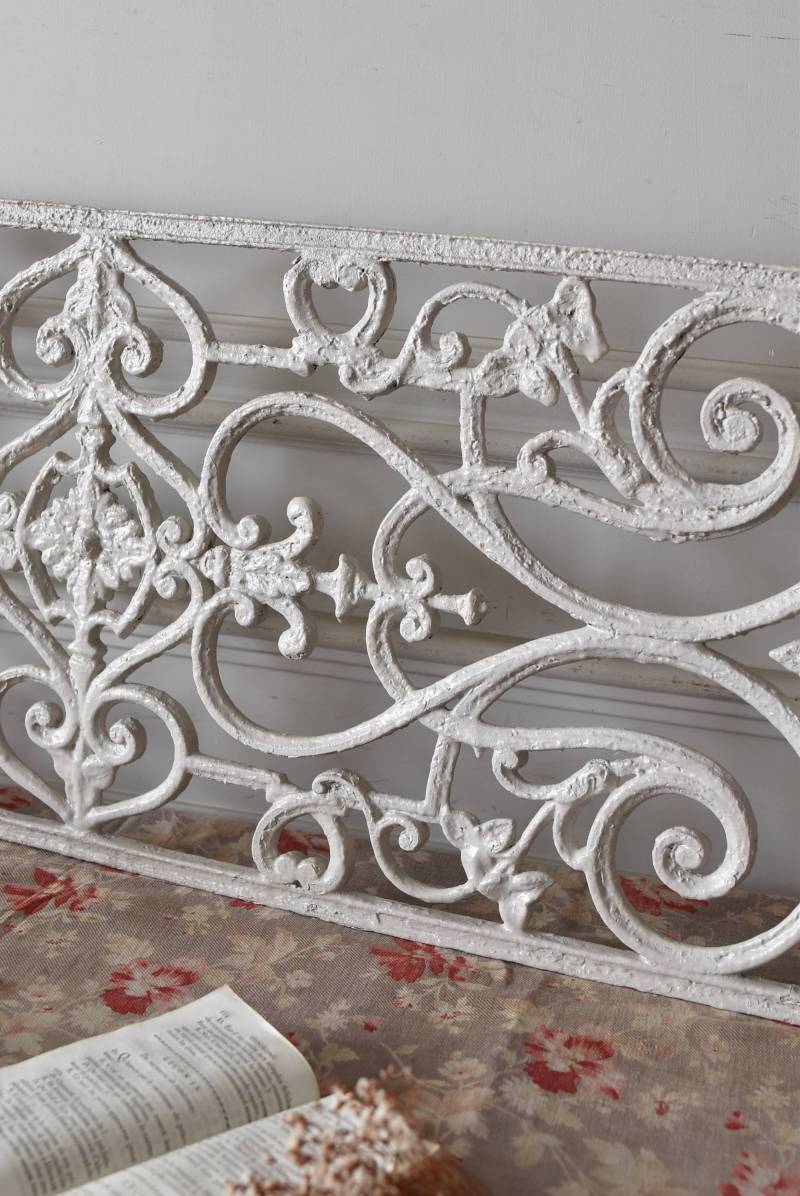 フランスのアイアンパネル。 有機的かつしなやかなラインで構成されたシンメトリーなデザインで、さりげないハートのモチーフが連なっているような可憐な雰囲気が漂います。流動的な姿は豪華ながらも程よい抜け感をもたらしてくれ、壁面に立て掛けているだけでも自然モチーフならではの優しげな印象を受けます。 何度も塗装を重ねながらも受け継がれてきた趣のある表情が楽しめる、縦横どちらでも使用できるデザインです。それぞれでの販売となりますが、同じデザインのアイアンパネル.7があります。 W 約106.5cm (装飾部のみW 約91cm) D 約1.5cm H 約38cm 重量 約12kg