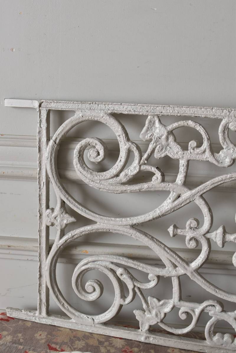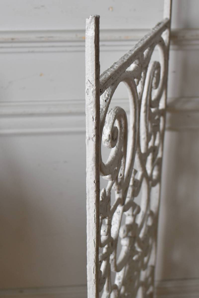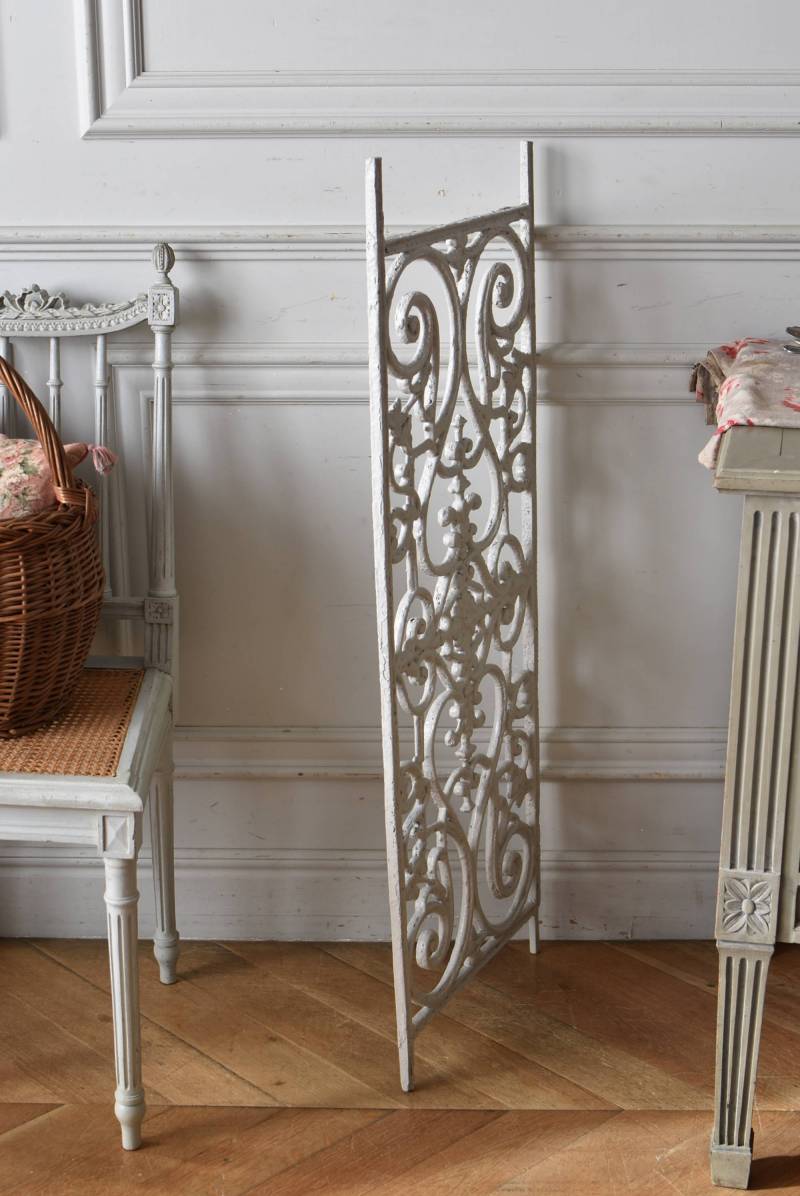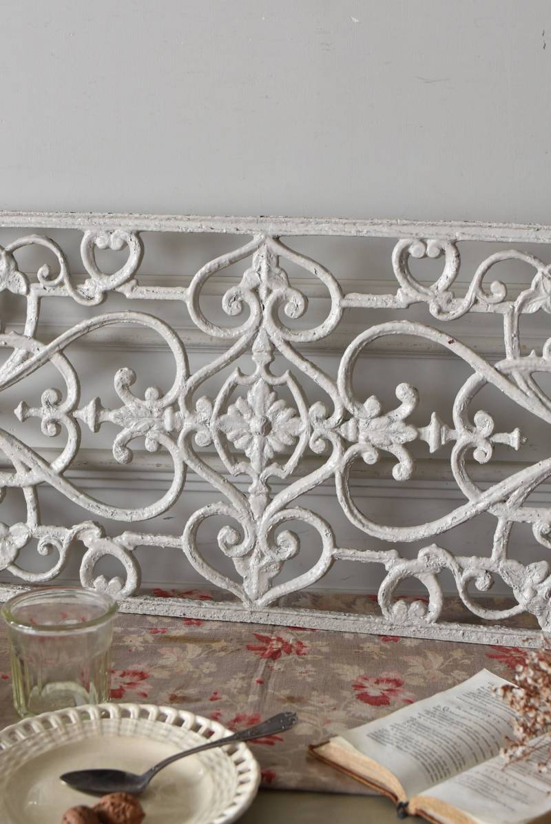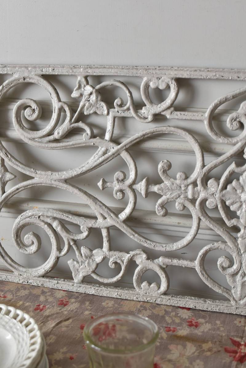 フランスのアイアンパネル。 有機的かつしなやかなラインで構成されたシンメトリーなデザインで、さりげないハートのモチーフが連なっているような可憐な雰囲気が漂います。流動的な姿は豪華ながらも程よい抜け感をもたらしてくれ、壁面に立て掛けているだけでも自然モチーフならではの優しげな印象を受けます。 何度も塗装を重ねながらも受け継がれてきた趣のある表情が楽しめる、縦横どちらでも使用できるデザインです。それぞれでの販売となりますが、同じデザインのアイアンパネル.7があります。 W 約106.5cm (装飾部のみW 約91cm) D 約1.5cm H 約38cm 重量 約12kg