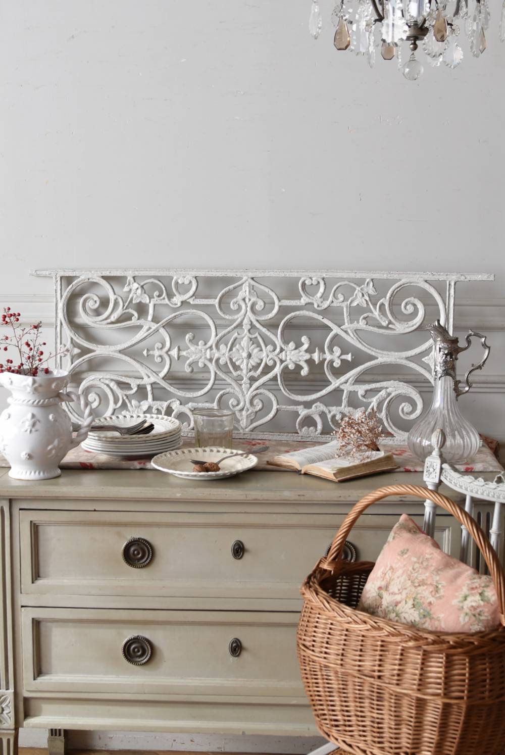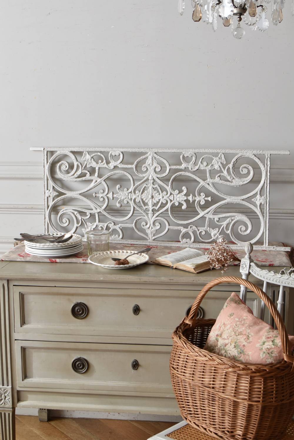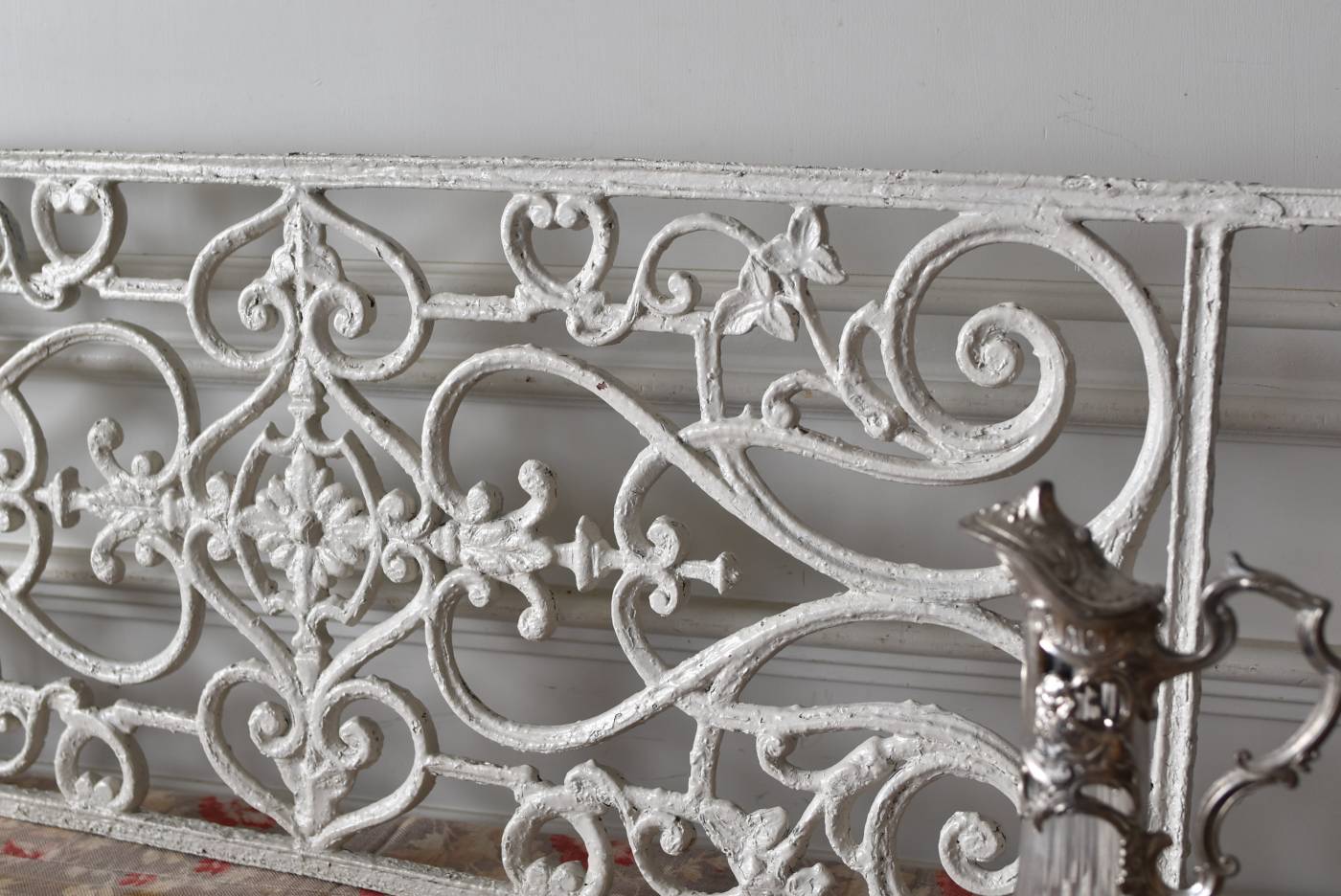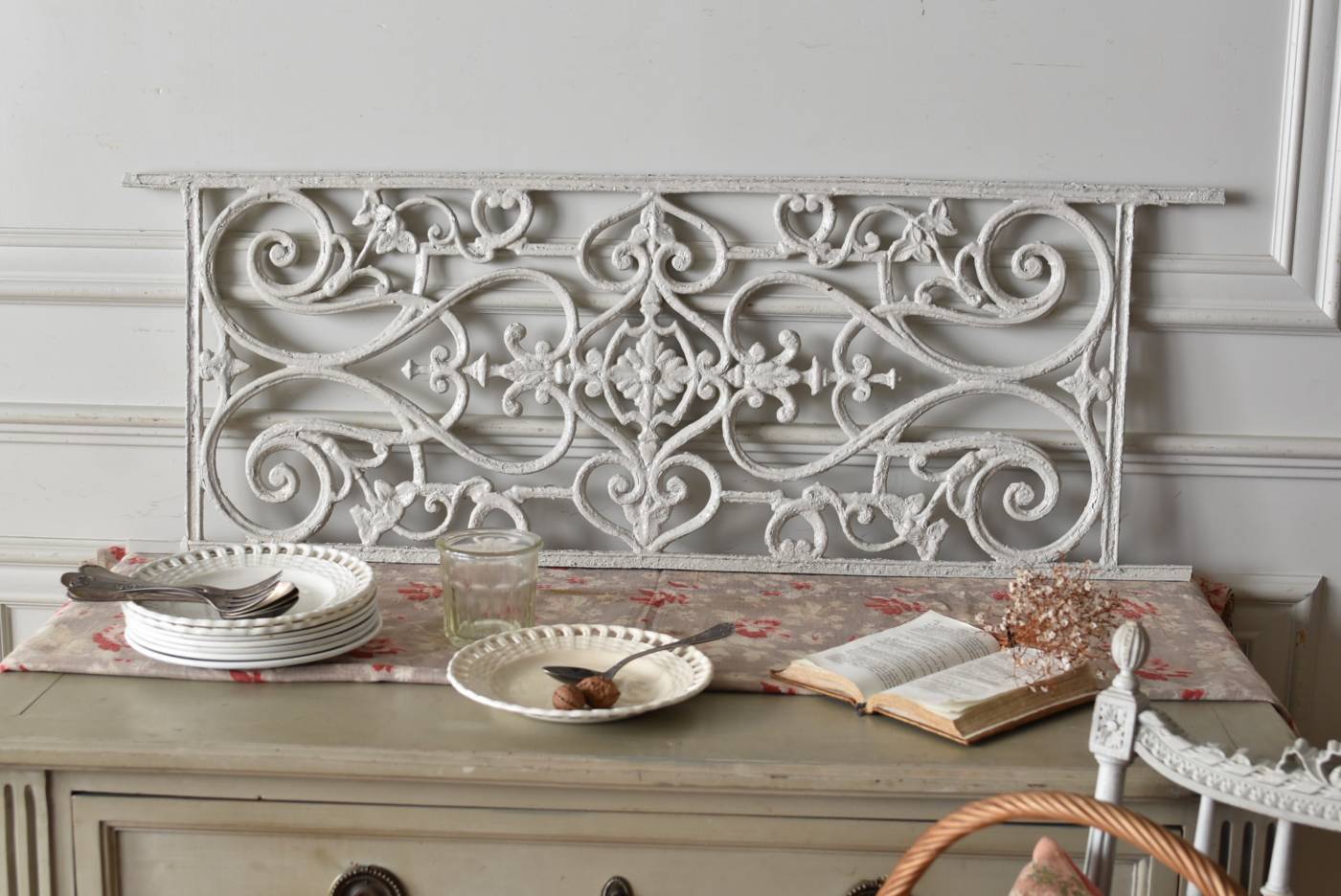 フランスのアイアンパネル。 有機的かつしなやかなラインで構成されたシンメトリーなデザインで、さりげないハートのモチーフが連なっているような可憐な雰囲気が漂います。流動的な姿は豪華ながらも程よい抜け感をもたらしてくれ、壁面に立て掛けているだけでも自然モチーフならではの優しげな印象を受けます。 何度も塗装を重ねながらも受け継がれてきた趣のある表情が楽しめる、縦横どちらでも使用できるデザインです。それぞれでの販売となりますが、同じデザインのアイアンパネル.7があります。 W 約106.5cm (装飾部のみW 約91cm) D 約1.5cm H 約38cm 重量 約12kg