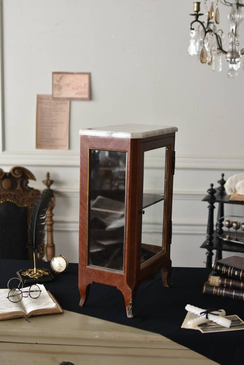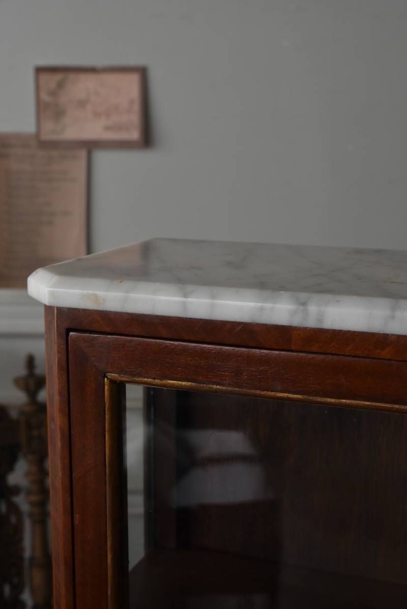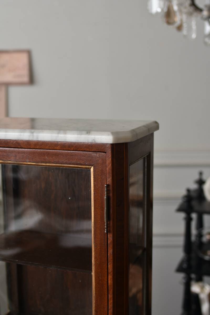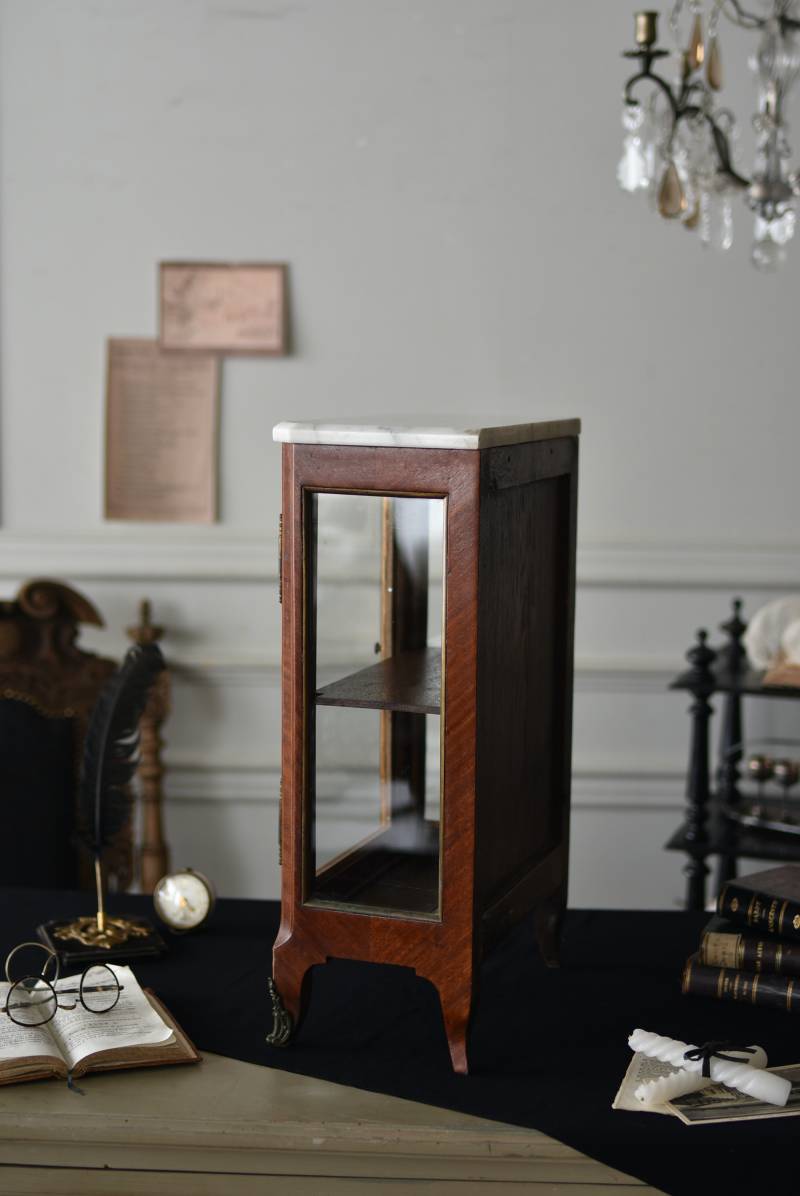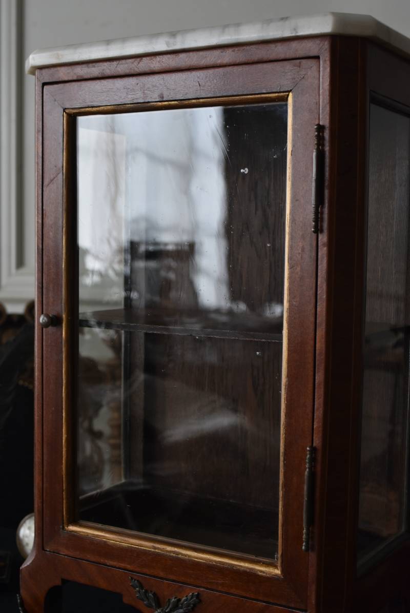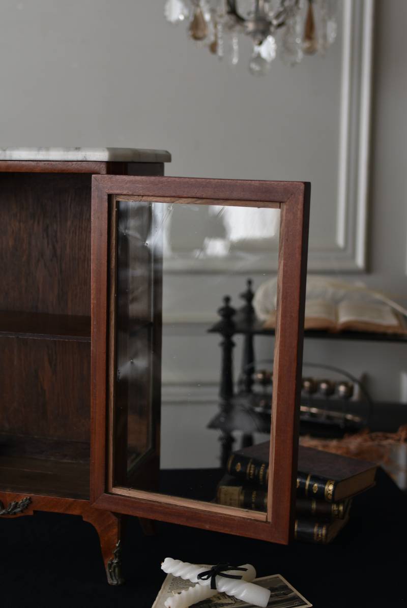 フランスの3面ガラススモールキャビネット。 艶やかな質感の木製ボディはレッドブラウンカラーで、天板にあしらわれたホワイト基調のマーブルストーン(大理石)とのコントラストが美しい佇まい。ゆらゆらとしたガラスで3面が囲われ、たっぷり光を取り込んで中に飾ったものをより魅力的に演出してくれるコレクションケースにぴったりなデザインとなっています。扉内の棚板は取り外しが可能な作りに。 優雅なカブリオールレッグにガラス縁のゴールドライン、繊細な金属装飾がアクセントとなったエレガントな姿で、クラシカルな卓上ディスプレイを楽しめるアイテムです。 W 約31cm D 約18.5cm H 約51.5cm 棚板間隔(上から) 約19cm/約18.5cm 棚板面積 W約27cm×D約13.3cm