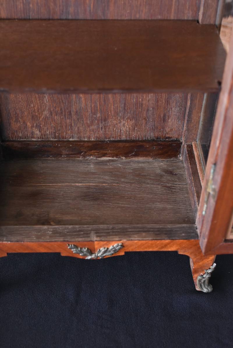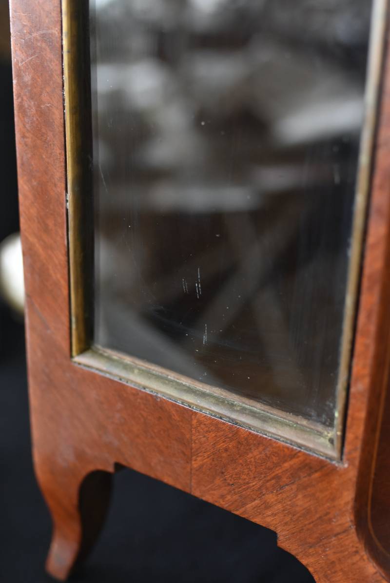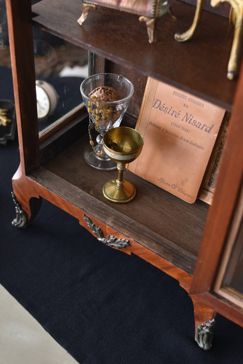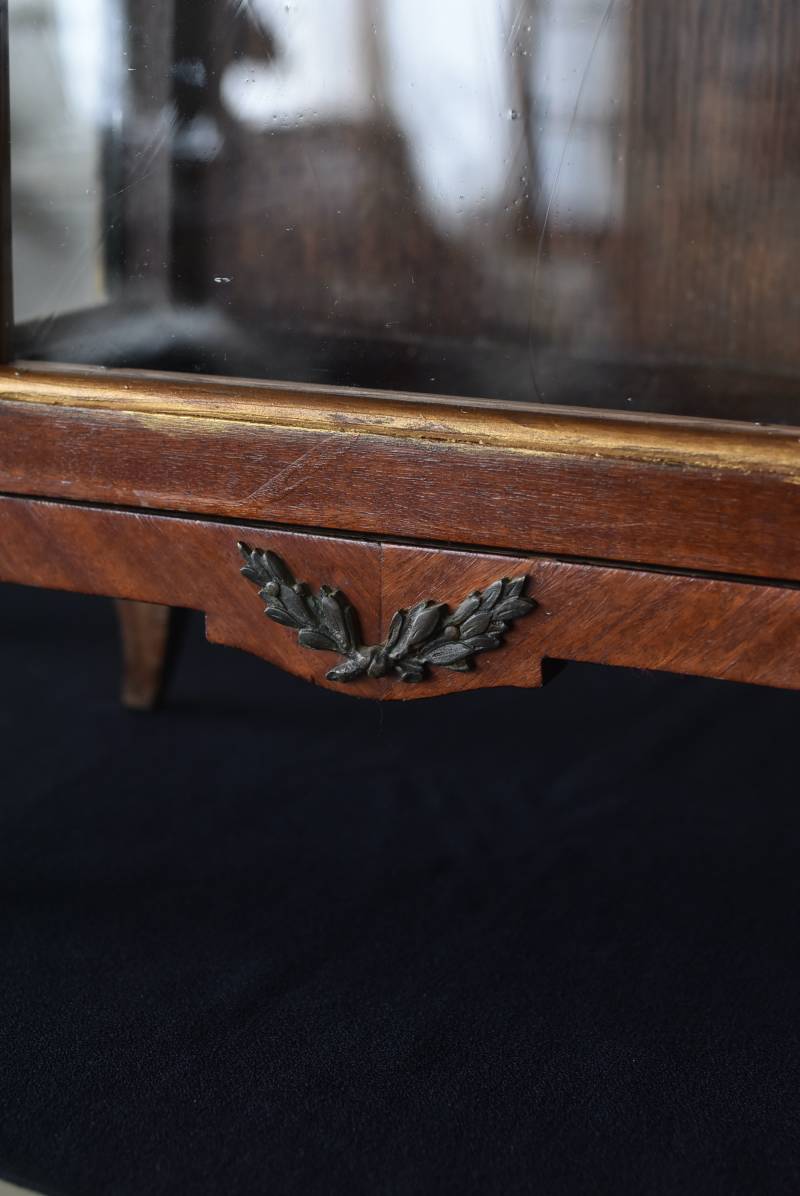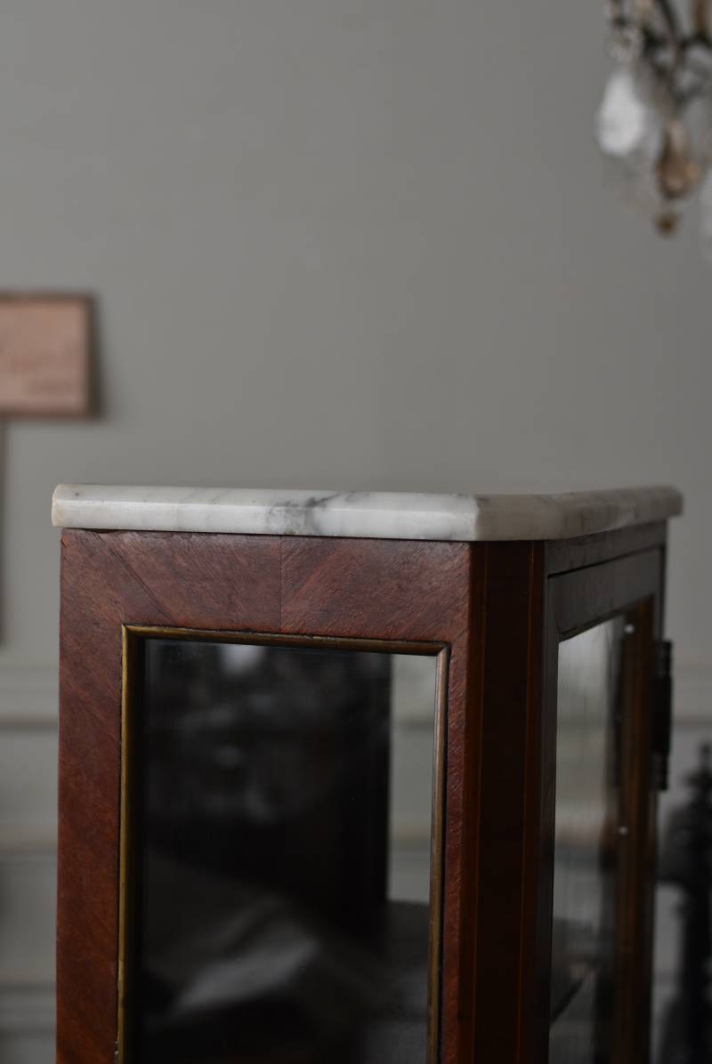 フランスの3面ガラススモールキャビネット。 艶やかな質感の木製ボディはレッドブラウンカラーで、天板にあしらわれたホワイト基調のマーブルストーン(大理石)とのコントラストが美しい佇まい。ゆらゆらとしたガラスで3面が囲われ、たっぷり光を取り込んで中に飾ったものをより魅力的に演出してくれるコレクションケースにぴったりなデザインとなっています。扉内の棚板は取り外しが可能な作りに。 優雅なカブリオールレッグにガラス縁のゴールドライン、繊細な金属装飾がアクセントとなったエレガントな姿で、クラシカルな卓上ディスプレイを楽しめるアイテムです。 W 約31cm D 約18.5cm H 約51.5cm 棚板間隔(上から) 約19cm/約18.5cm 棚板面積 W約27cm×D約13.3cm