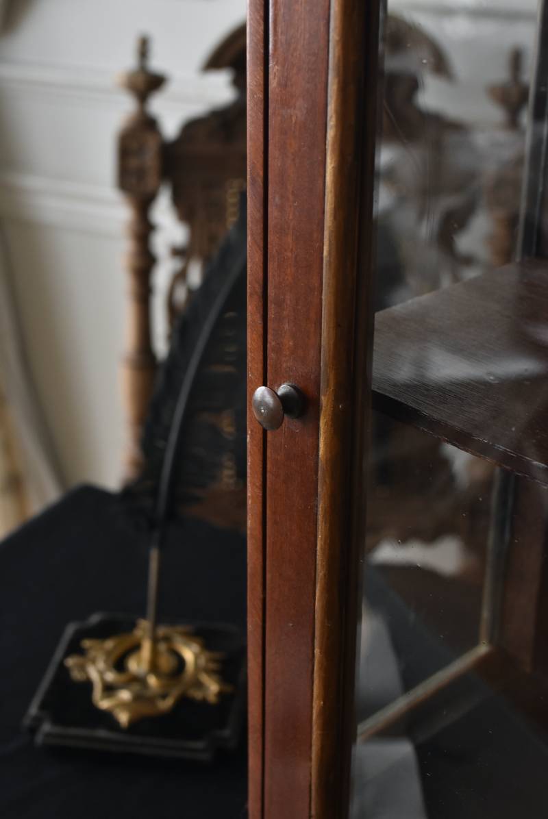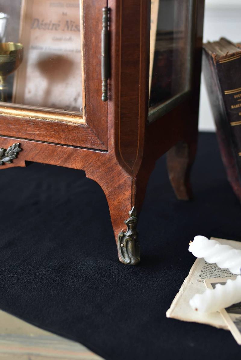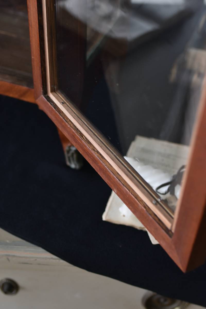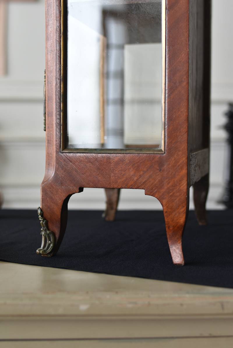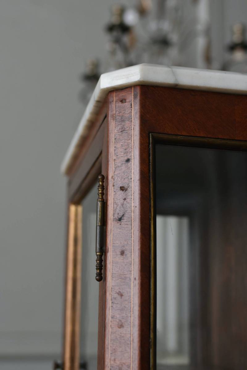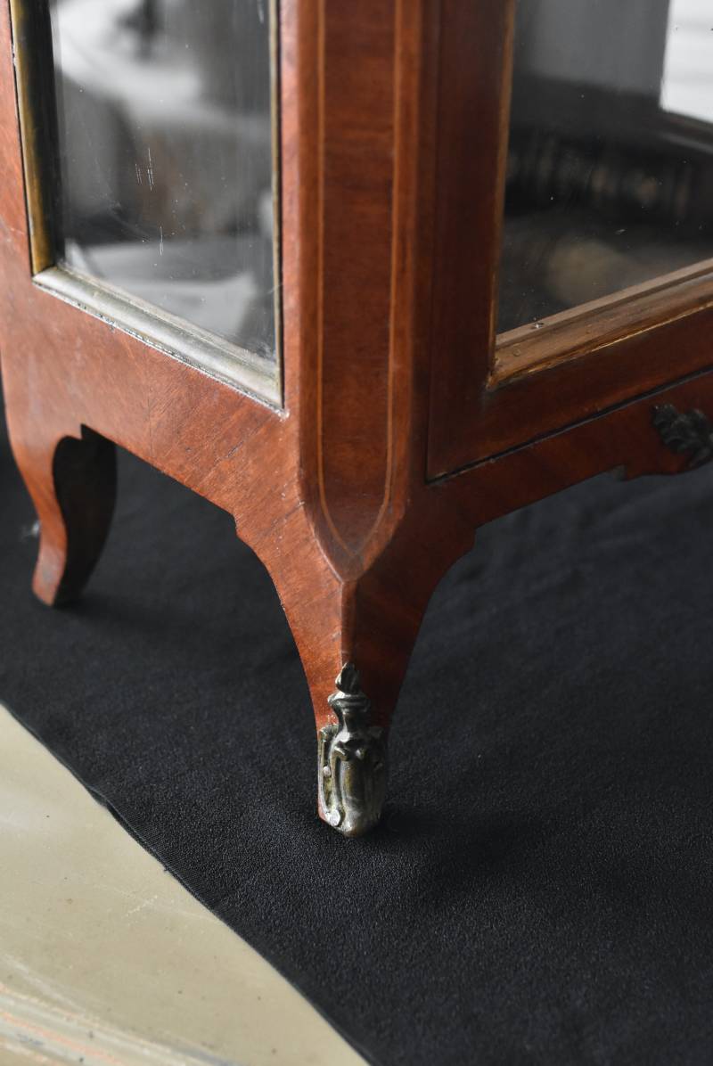 フランスの3面ガラススモールキャビネット。 艶やかな質感の木製ボディはレッドブラウンカラーで、天板にあしらわれたホワイト基調のマーブルストーン(大理石)とのコントラストが美しい佇まい。ゆらゆらとしたガラスで3面が囲われ、たっぷり光を取り込んで中に飾ったものをより魅力的に演出してくれるコレクションケースにぴったりなデザインとなっています。扉内の棚板は取り外しが可能な作りに。 優雅なカブリオールレッグにガラス縁のゴールドライン、繊細な金属装飾がアクセントとなったエレガントな姿で、クラシカルな卓上ディスプレイを楽しめるアイテムです。 W 約31cm D 約18.5cm H 約51.5cm 棚板間隔(上から) 約19cm/約18.5cm 棚板面積 W約27cm×D約13.3cm