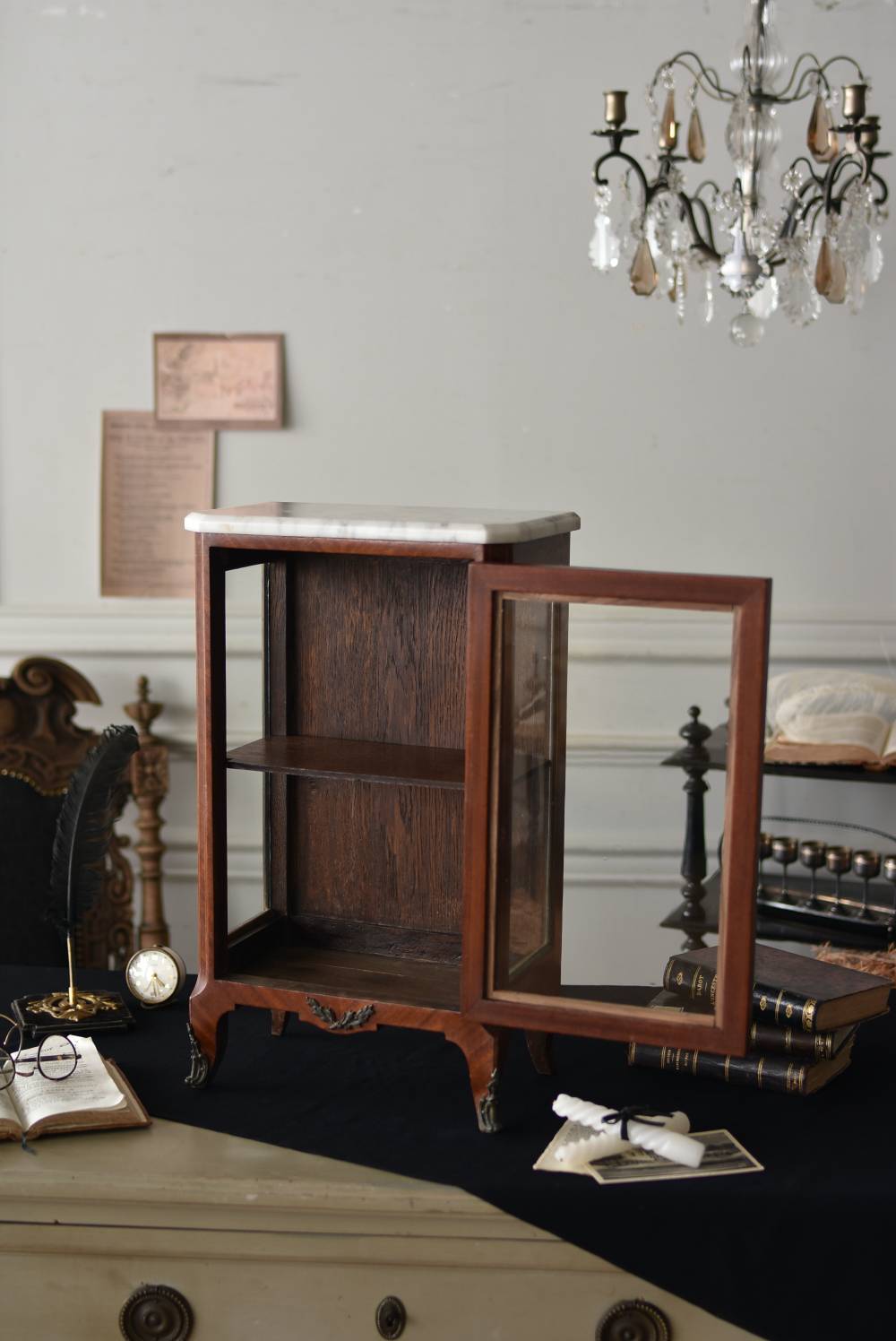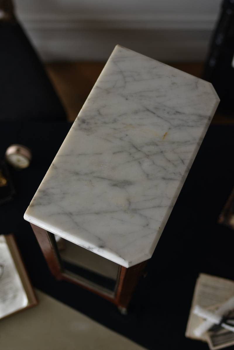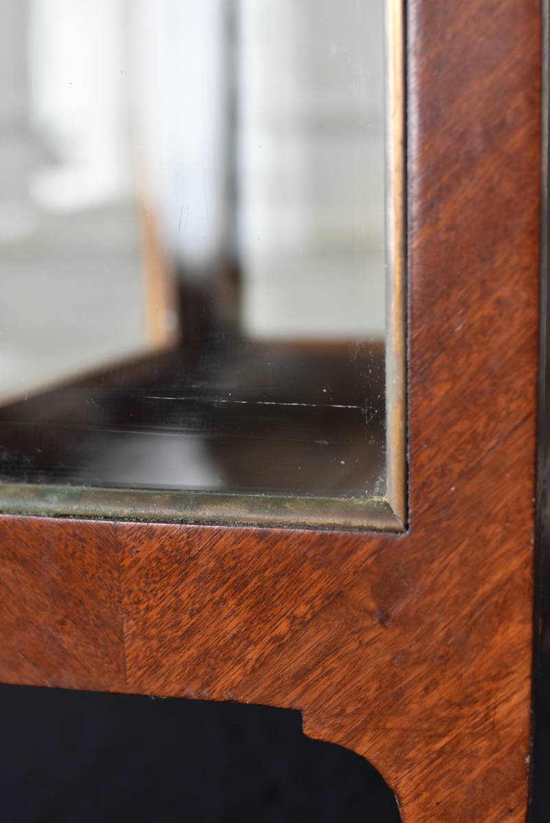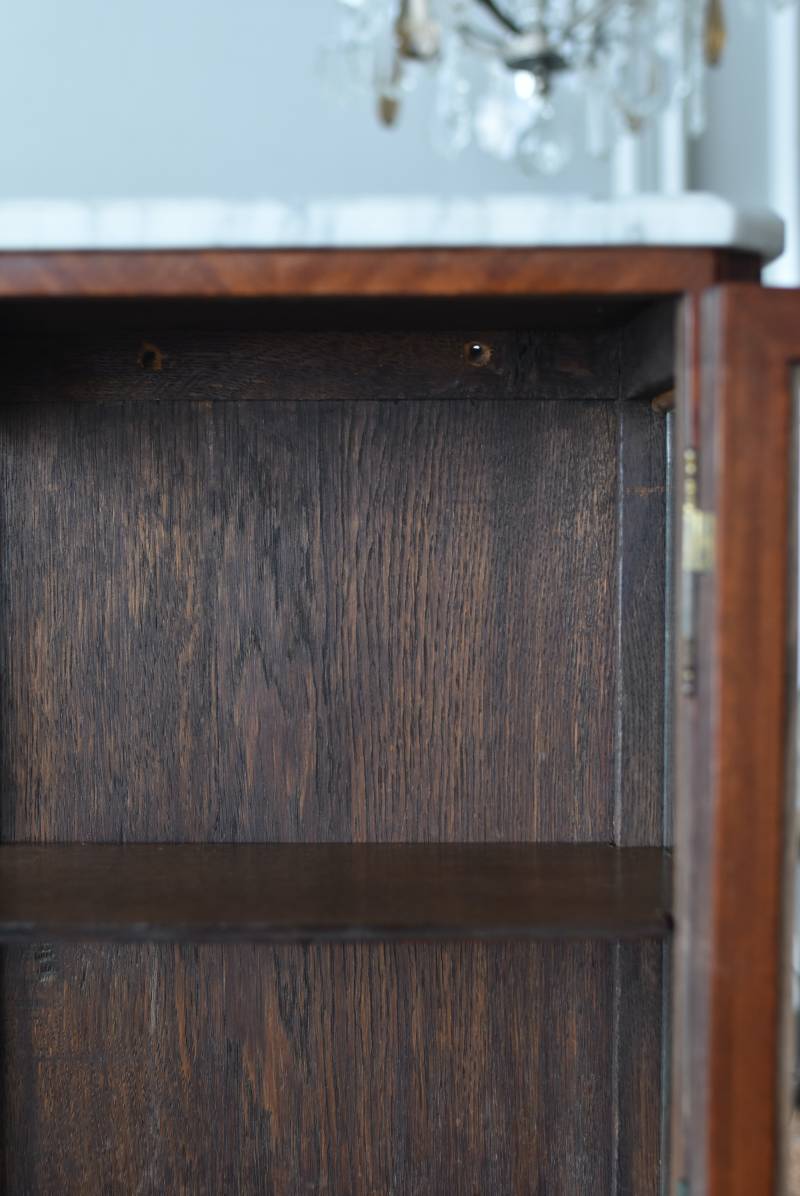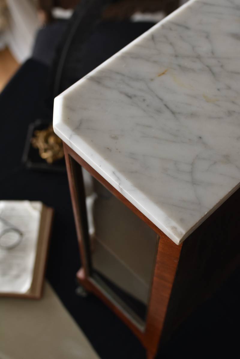 フランスの3面ガラススモールキャビネット。 艶やかな質感の木製ボディはレッドブラウンカラーで、天板にあしらわれたホワイト基調のマーブルストーン(大理石)とのコントラストが美しい佇まい。ゆらゆらとしたガラスで3面が囲われ、たっぷり光を取り込んで中に飾ったものをより魅力的に演出してくれるコレクションケースにぴったりなデザインとなっています。扉内の棚板は取り外しが可能な作りに。 優雅なカブリオールレッグにガラス縁のゴールドライン、繊細な金属装飾がアクセントとなったエレガントな姿で、クラシカルな卓上ディスプレイを楽しめるアイテムです。 W 約31cm D 約18.5cm H 約51.5cm 棚板間隔(上から) 約19cm/約18.5cm 棚板面積 W約27cm×D約13.3cm