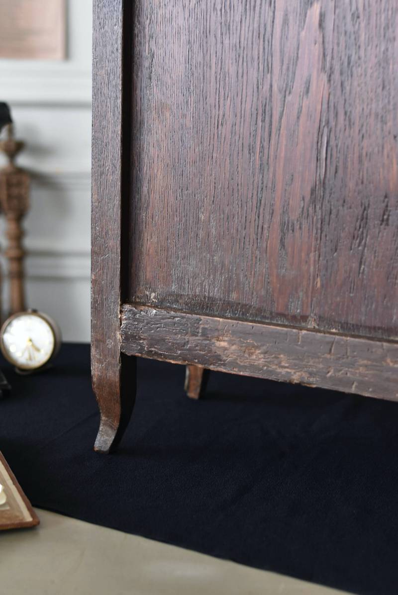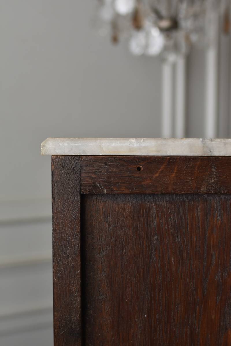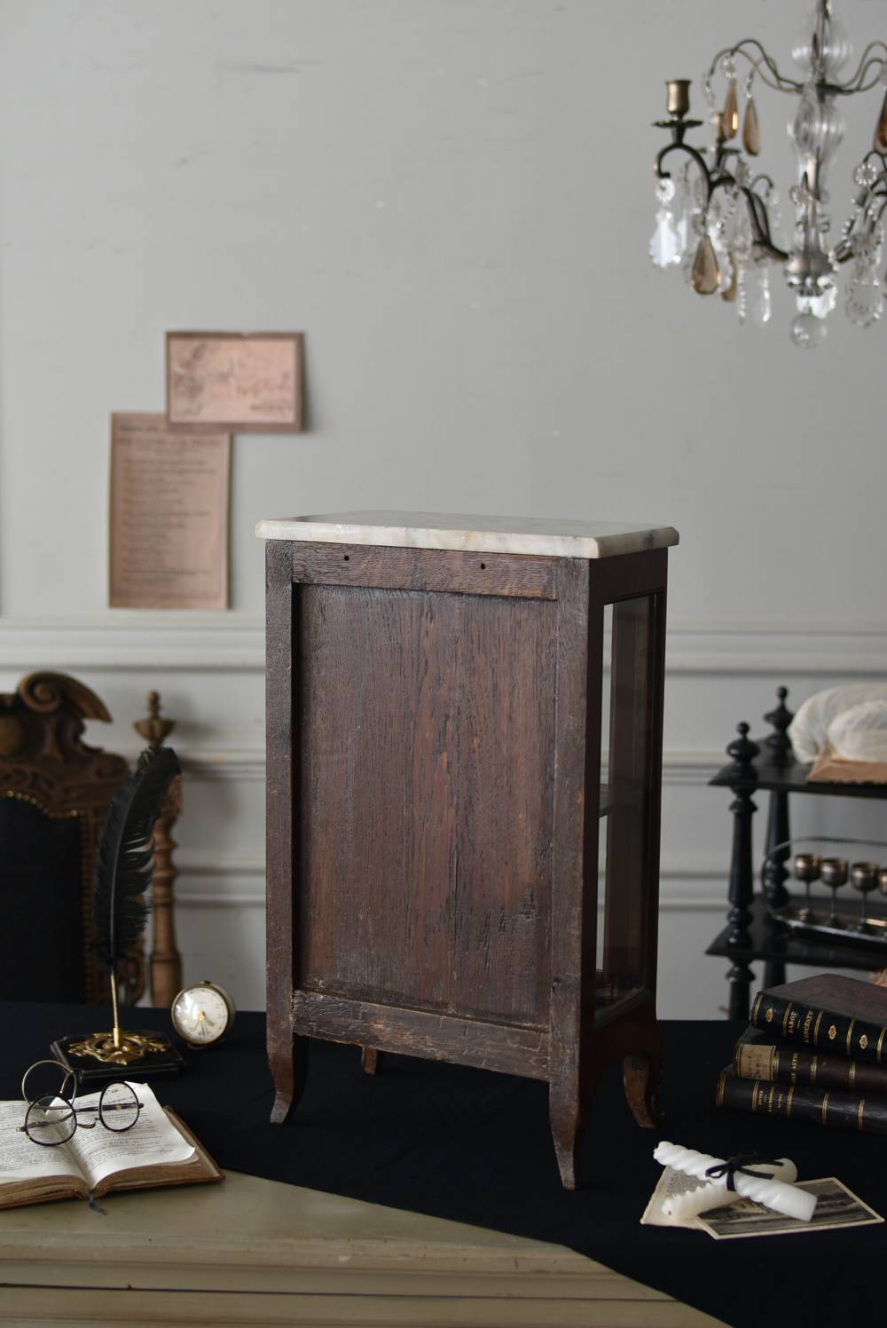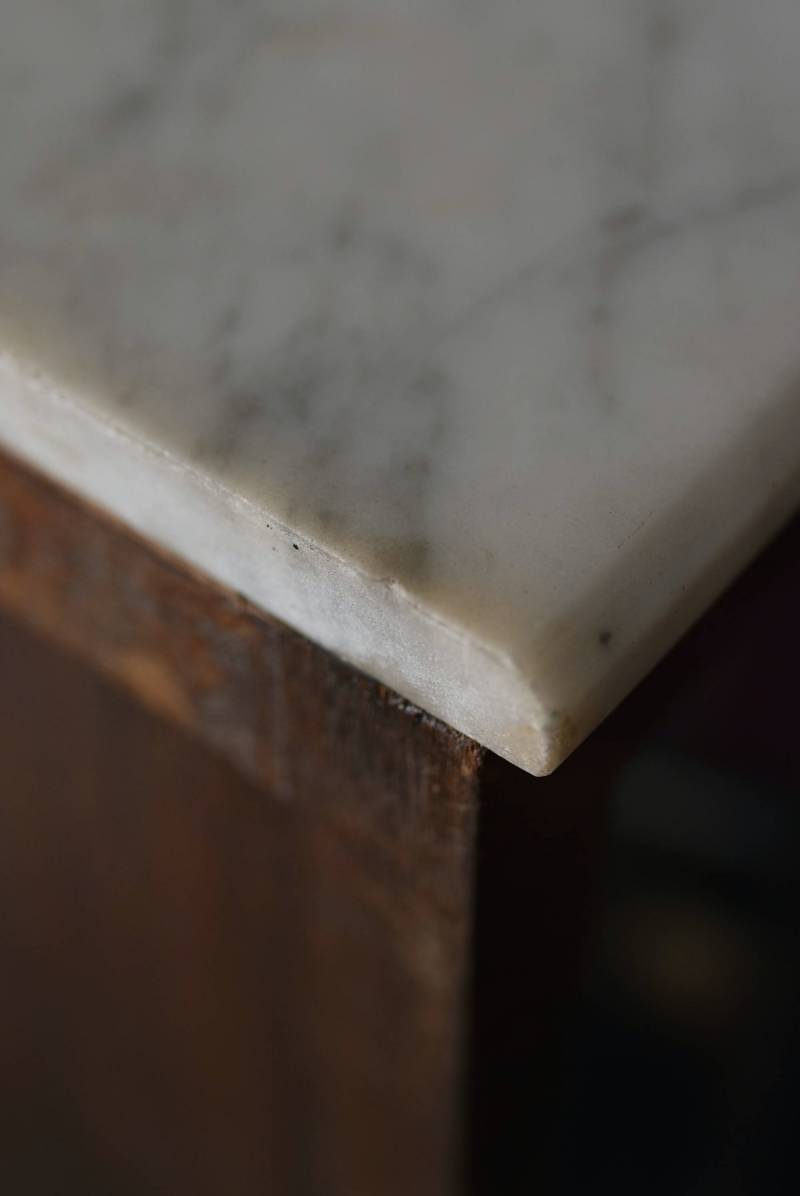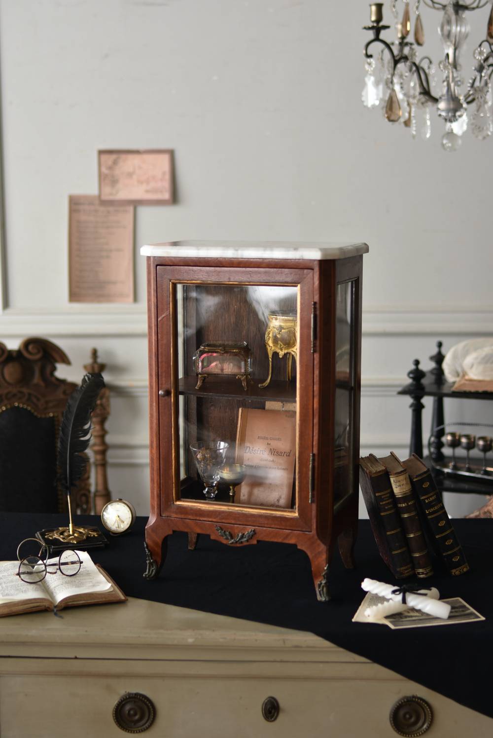 フランスの3面ガラススモールキャビネット。 艶やかな質感の木製ボディはレッドブラウンカラーで、天板にあしらわれたホワイト基調のマーブルストーン(大理石)とのコントラストが美しい佇まい。ゆらゆらとしたガラスで3面が囲われ、たっぷり光を取り込んで中に飾ったものをより魅力的に演出してくれるコレクションケースにぴったりなデザインとなっています。扉内の棚板は取り外しが可能な作りに。 優雅なカブリオールレッグにガラス縁のゴールドライン、繊細な金属装飾がアクセントとなったエレガントな姿で、クラシカルな卓上ディスプレイを楽しめるアイテムです。 W 約31cm D 約18.5cm H 約51.5cm 棚板間隔(上から) 約19cm/約18.5cm 棚板面積 W約27cm×D約13.3cm