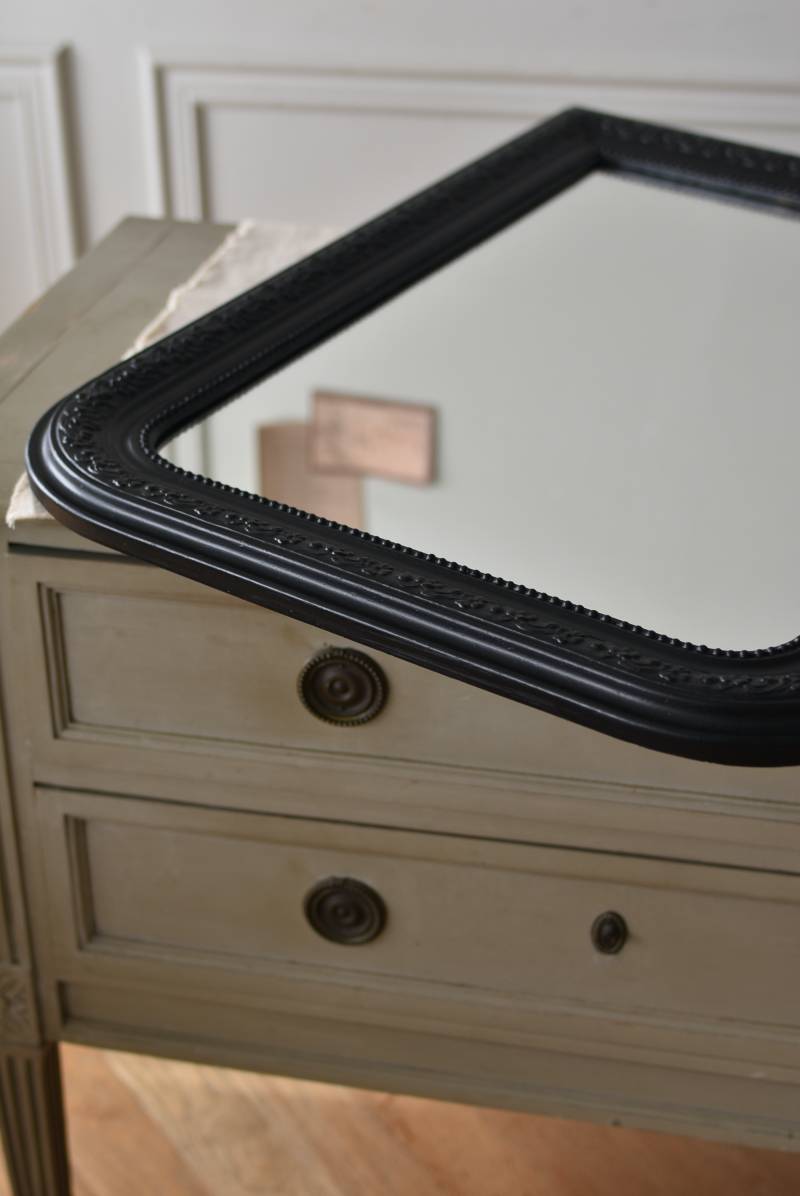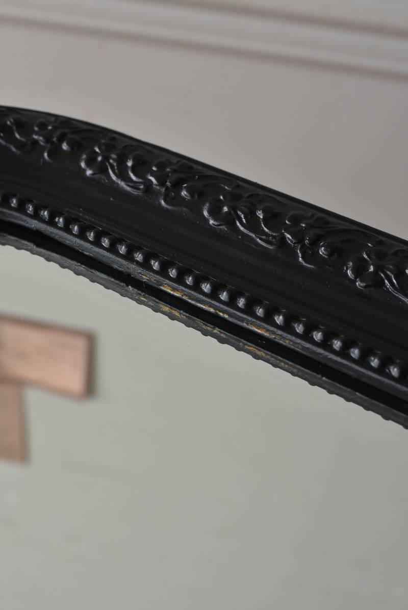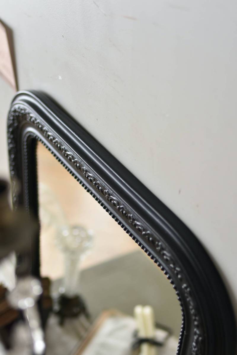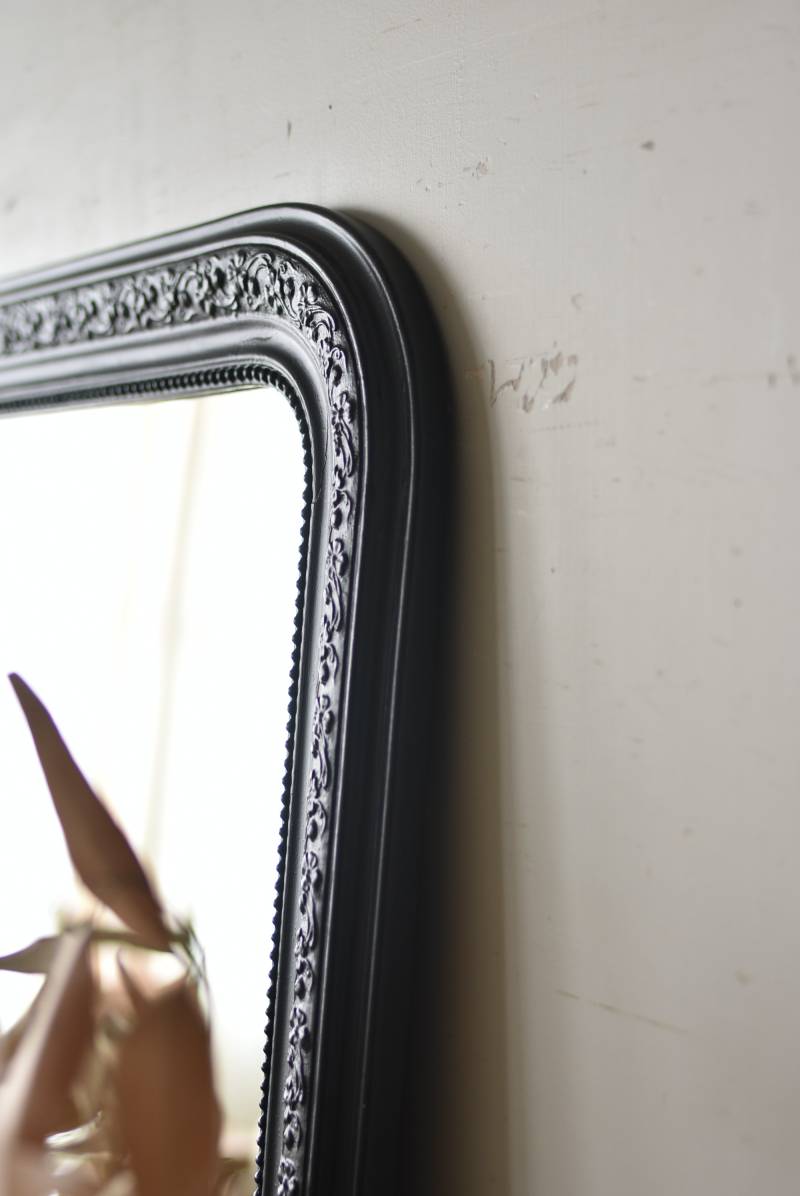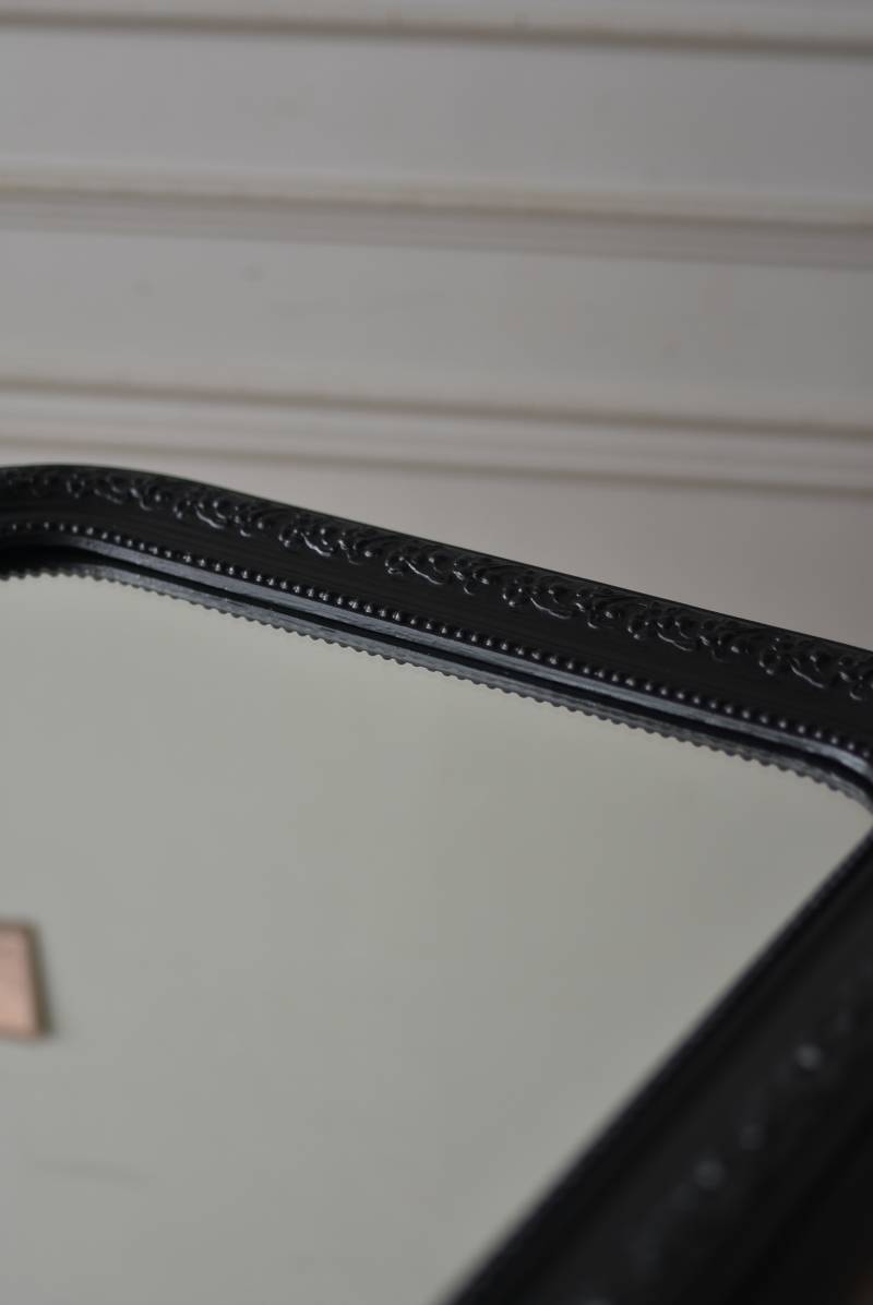 クラシカルな空間にも映えるフレンチミラー。 上部の角が優美な曲線を描くアーチ型のシルエットと、奥行きのあるフレームが特徴的。上品な艶感のあるブラックペイントが空間をキリリと引き締め、アクセントを空間に添えてくれる洗練されたデザインとなっています。フレーム表面には植物をモチーフにした繊細なレリーフと内側に連なるパールの珠状装飾が施され、光の当たり方で表情を変える立体的なディテールが魅力の一つに。 はめ込まれたミラーは新しいものに取り替えているので実用としてもしっかりと活躍し、フレンチシックなウォールデコレーションを楽しめるアイテムです。 W 約59.5cm D 約3cm(+金具1.5cm) H 約80cm 内寸 W約43.5cm×H約64.5cm 重量 約7.5kg こちらの商品の配送について