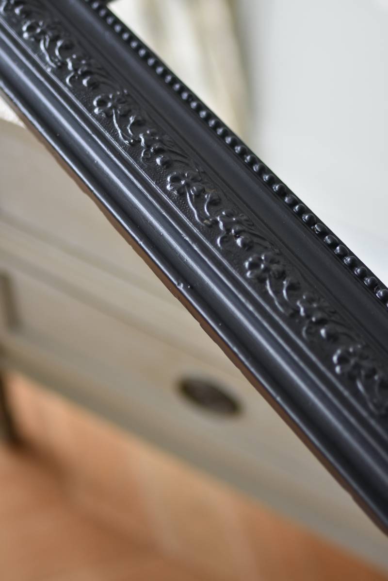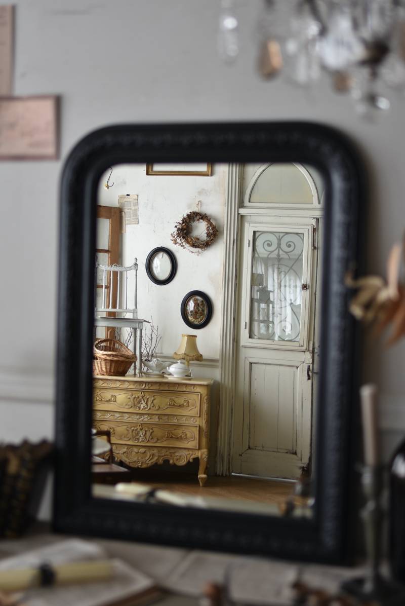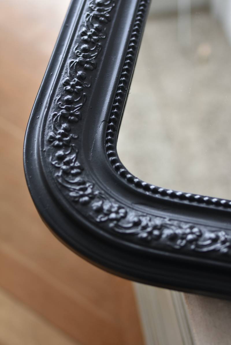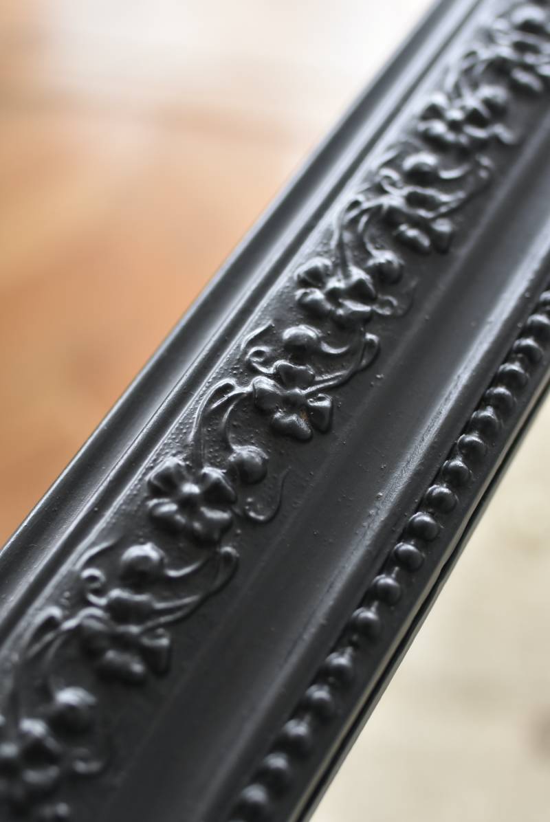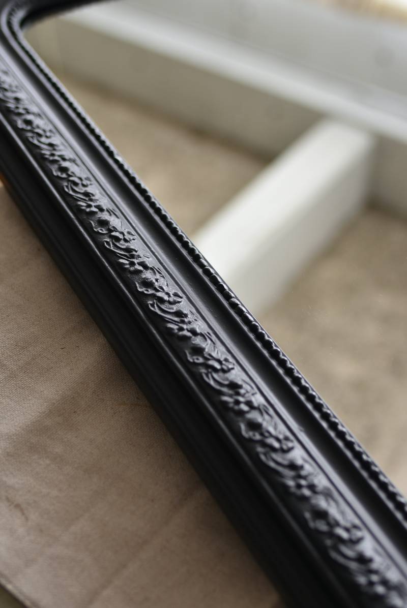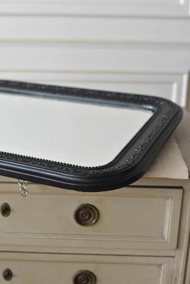 クラシカルな空間にも映えるフレンチミラー。 上部の角が優美な曲線を描くアーチ型のシルエットと、奥行きのあるフレームが特徴的。上品な艶感のあるブラックペイントが空間をキリリと引き締め、アクセントを空間に添えてくれる洗練されたデザインとなっています。フレーム表面には植物をモチーフにした繊細なレリーフと内側に連なるパールの珠状装飾が施され、光の当たり方で表情を変える立体的なディテールが魅力の一つに。 はめ込まれたミラーは新しいものに取り替えているので実用としてもしっかりと活躍し、フレンチシックなウォールデコレーションを楽しめるアイテムです。 W 約59.5cm D 約3cm(+金具1.5cm) H 約80cm 内寸 W約43.5cm×H約64.5cm 重量 約7.5kg こちらの商品の配送について