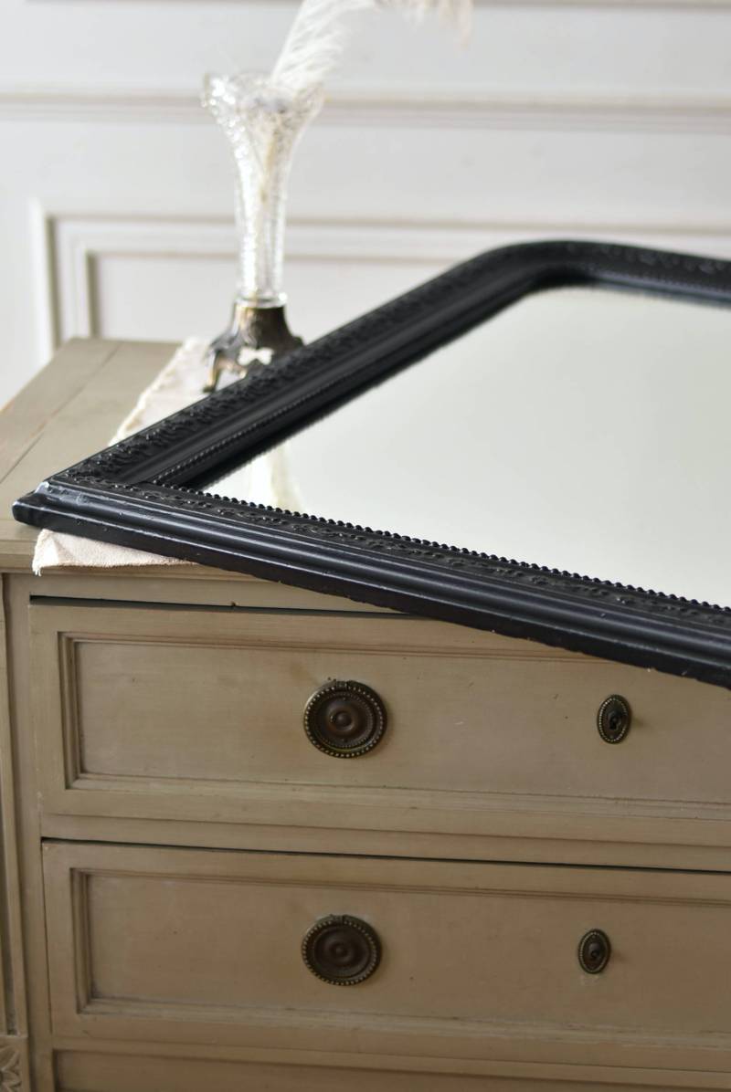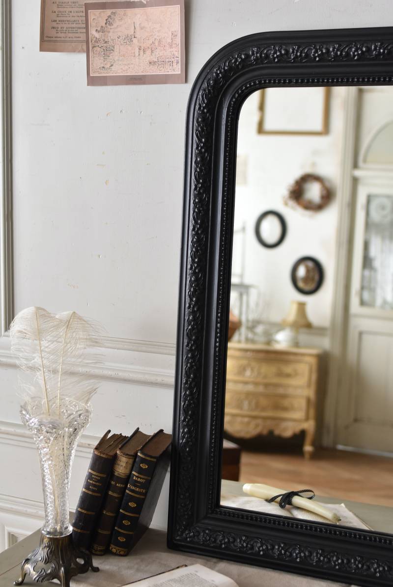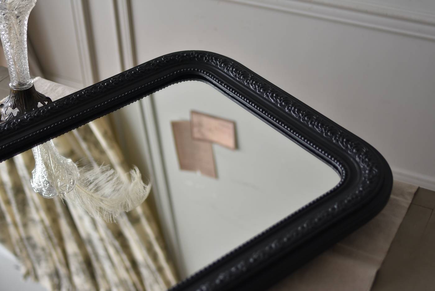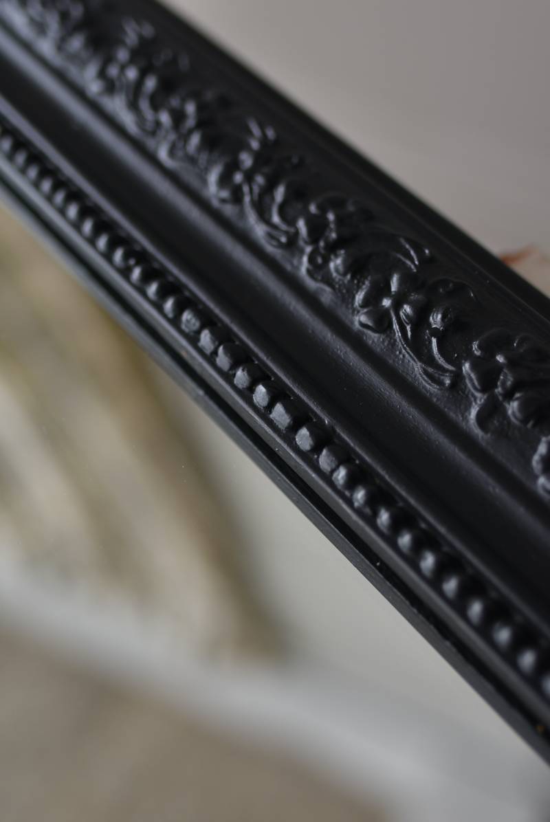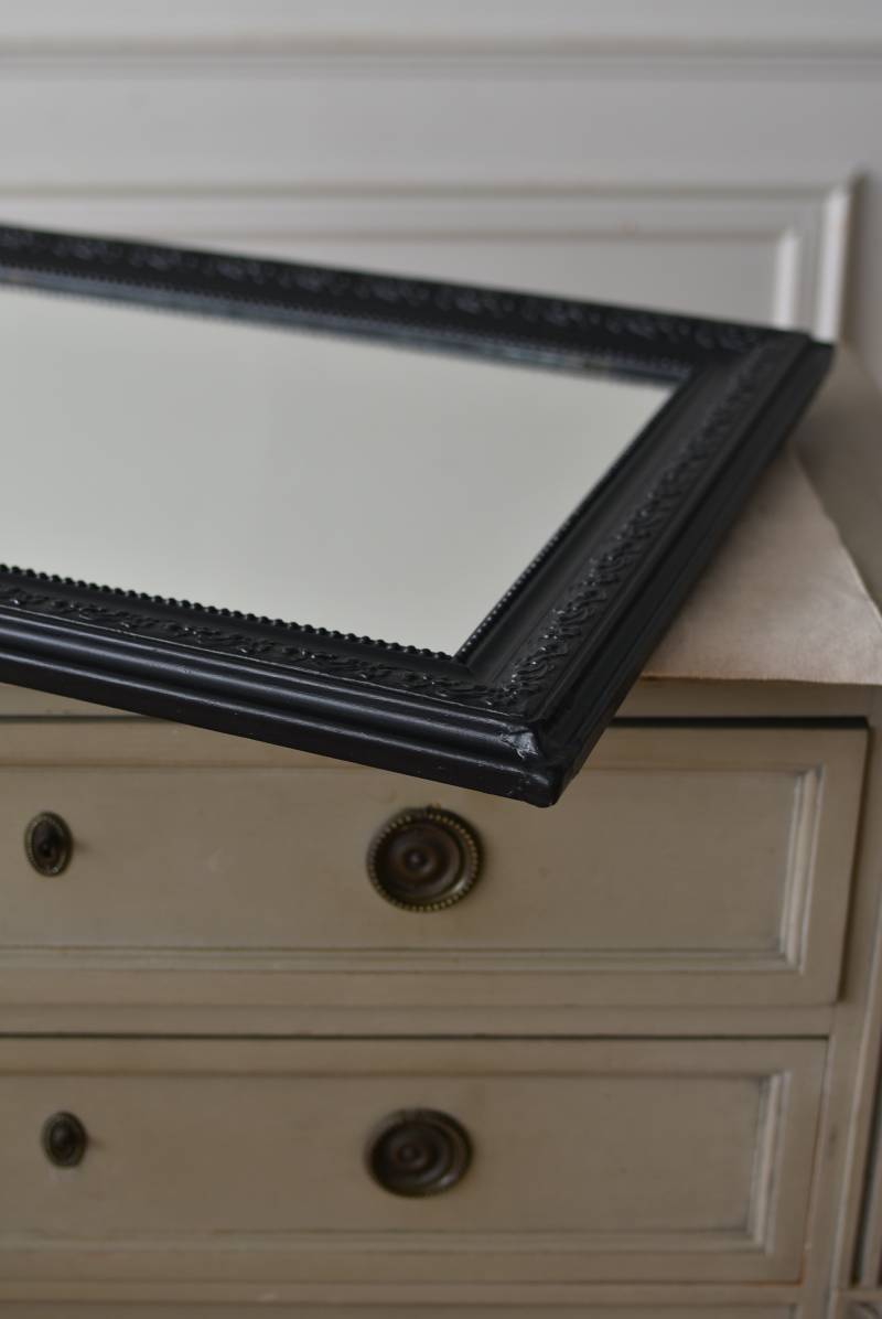 クラシカルな空間にも映えるフレンチミラー。 上部の角が優美な曲線を描くアーチ型のシルエットと、奥行きのあるフレームが特徴的。上品な艶感のあるブラックペイントが空間をキリリと引き締め、アクセントを空間に添えてくれる洗練されたデザインとなっています。フレーム表面には植物をモチーフにした繊細なレリーフと内側に連なるパールの珠状装飾が施され、光の当たり方で表情を変える立体的なディテールが魅力の一つに。 はめ込まれたミラーは新しいものに取り替えているので実用としてもしっかりと活躍し、フレンチシックなウォールデコレーションを楽しめるアイテムです。 W 約59.5cm D 約3cm(+金具1.5cm) H 約80cm 内寸 W約43.5cm×H約64.5cm 重量 約7.5kg こちらの商品の配送について