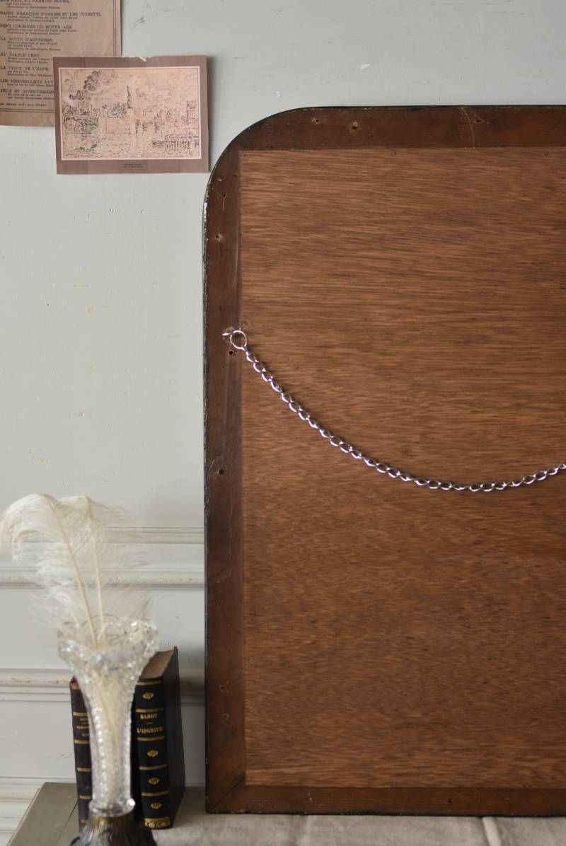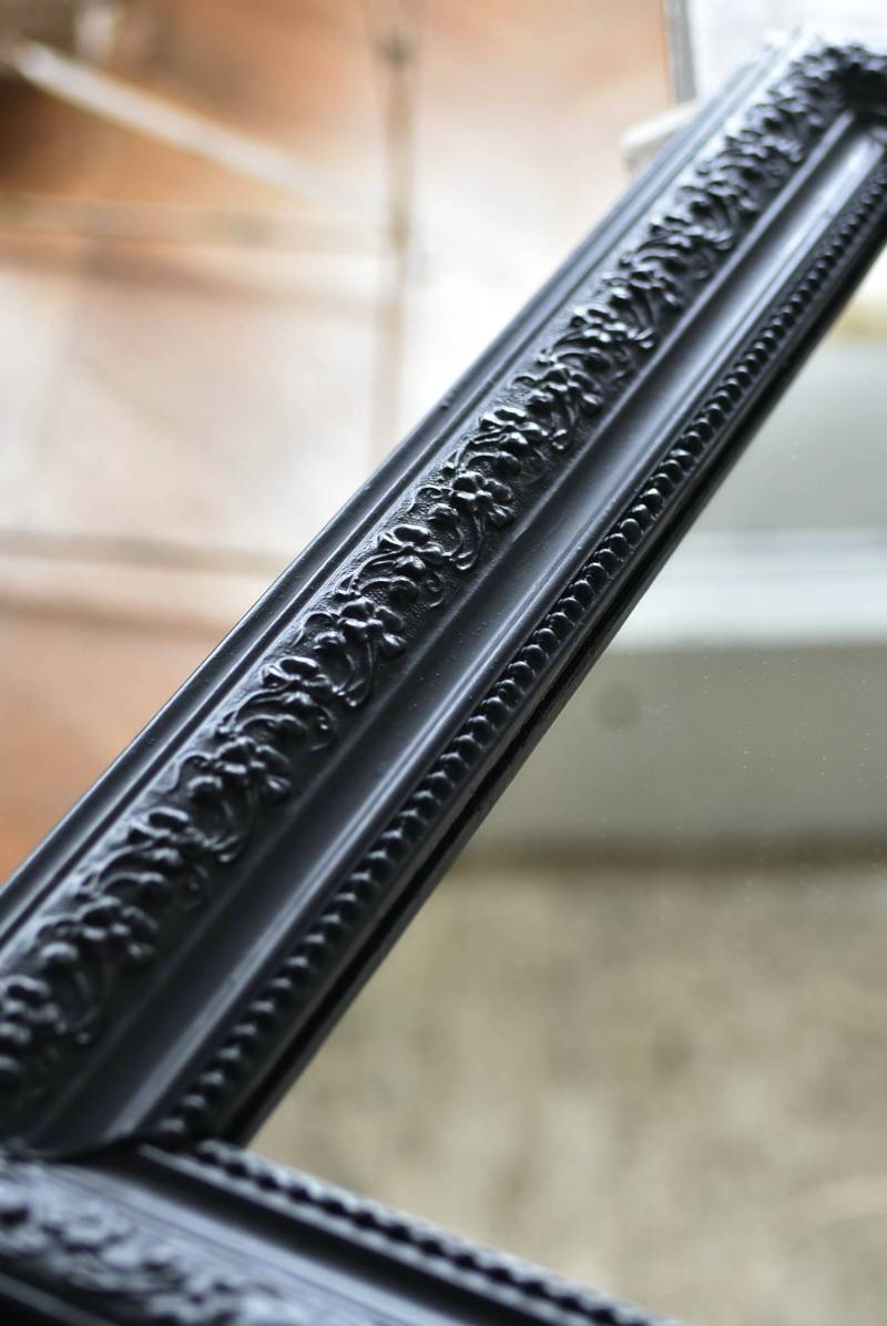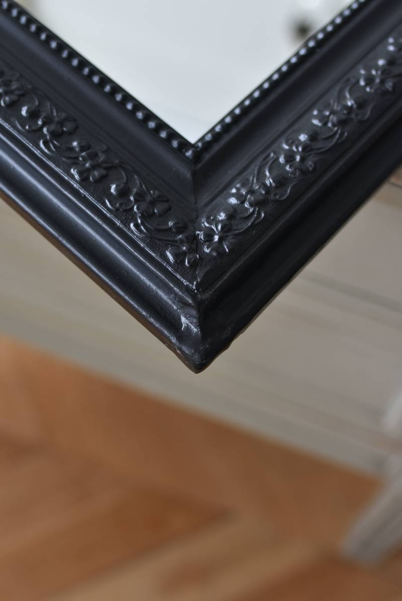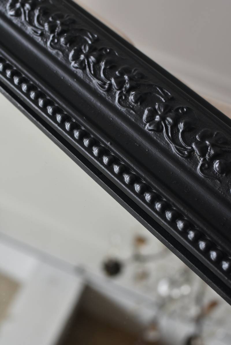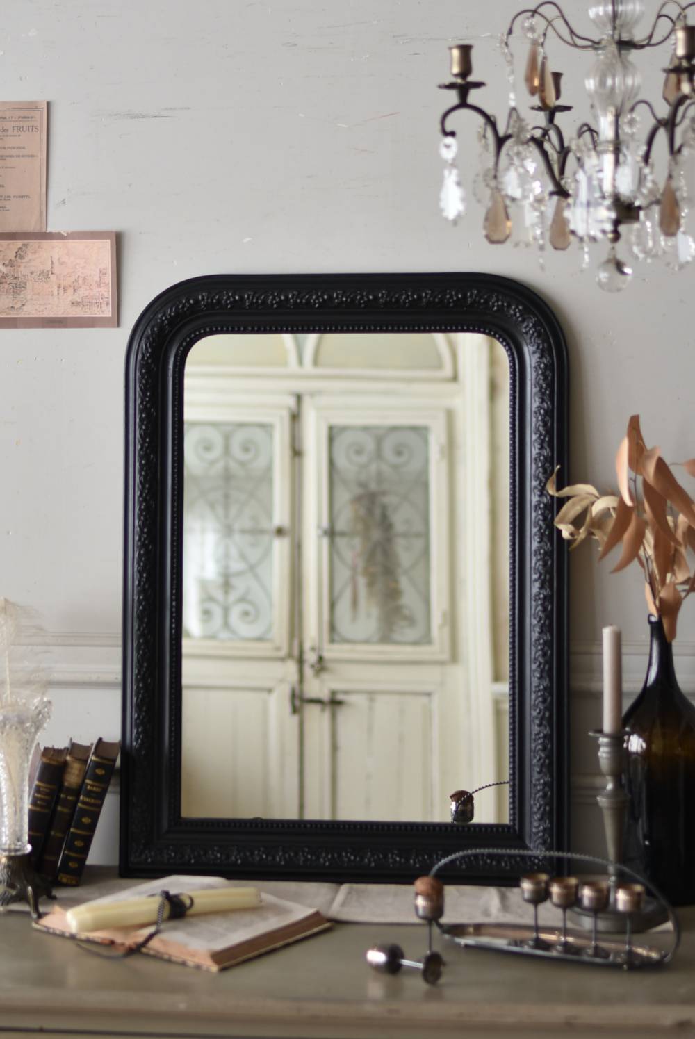クラシカルな空間にも映えるフレンチミラー。 上部の角が優美な曲線を描くアーチ型のシルエットと、奥行きのあるフレームが特徴的。上品な艶感のあるブラックペイントが空間をキリリと引き締め、アクセントを空間に添えてくれる洗練されたデザインとなっています。フレーム表面には植物をモチーフにした繊細なレリーフと内側に連なるパールの珠状装飾が施され、光の当たり方で表情を変える立体的なディテールが魅力の一つに。 はめ込まれたミラーは新しいものに取り替えているので実用としてもしっかりと活躍し、フレンチシックなウォールデコレーションを楽しめるアイテムです。 W 約59.5cm D 約3cm(+金具1.5cm) H 約80cm 内寸 W約43.5cm×H約64.5cm 重量 約7.5kg こちらの商品の配送について