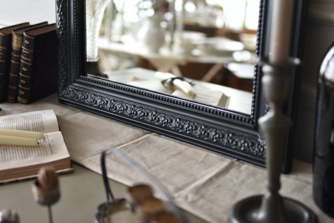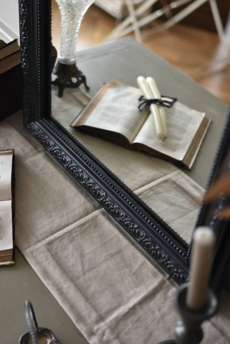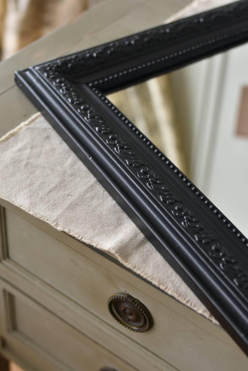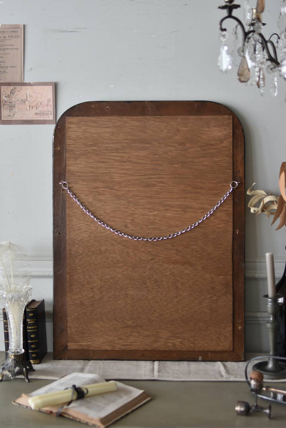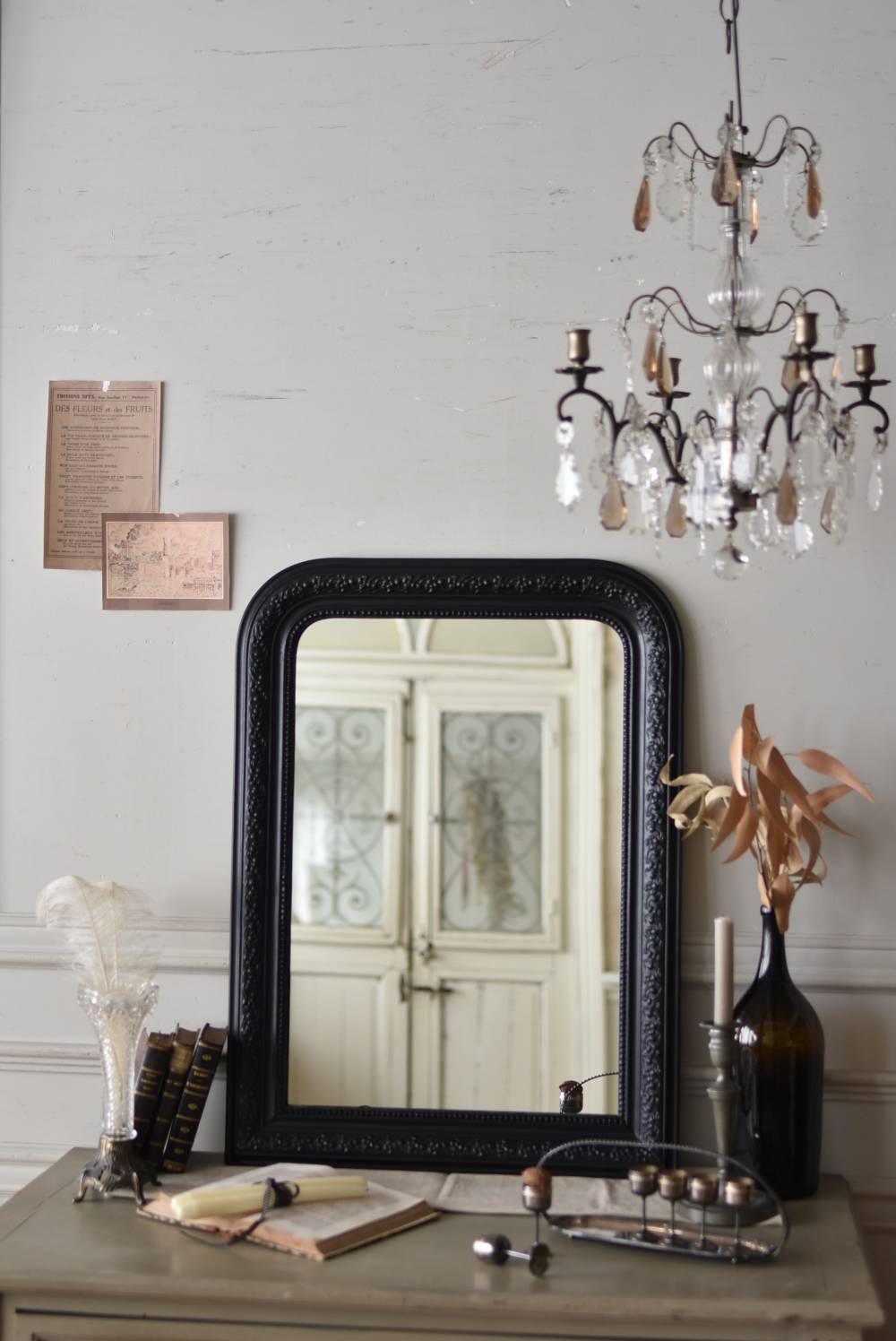 クラシカルな空間にも映えるフレンチミラー。 上部の角が優美な曲線を描くアーチ型のシルエットと、奥行きのあるフレームが特徴的。上品な艶感のあるブラックペイントが空間をキリリと引き締め、アクセントを空間に添えてくれる洗練されたデザインとなっています。フレーム表面には植物をモチーフにした繊細なレリーフと内側に連なるパールの珠状装飾が施され、光の当たり方で表情を変える立体的なディテールが魅力の一つに。 はめ込まれたミラーは新しいものに取り替えているので実用としてもしっかりと活躍し、フレンチシックなウォールデコレーションを楽しめるアイテムです。 W 約59.5cm D 約3cm(+金具1.5cm) H 約80cm 内寸 W約43.5cm×H約64.5cm 重量 約7.5kg こちらの商品の配送について