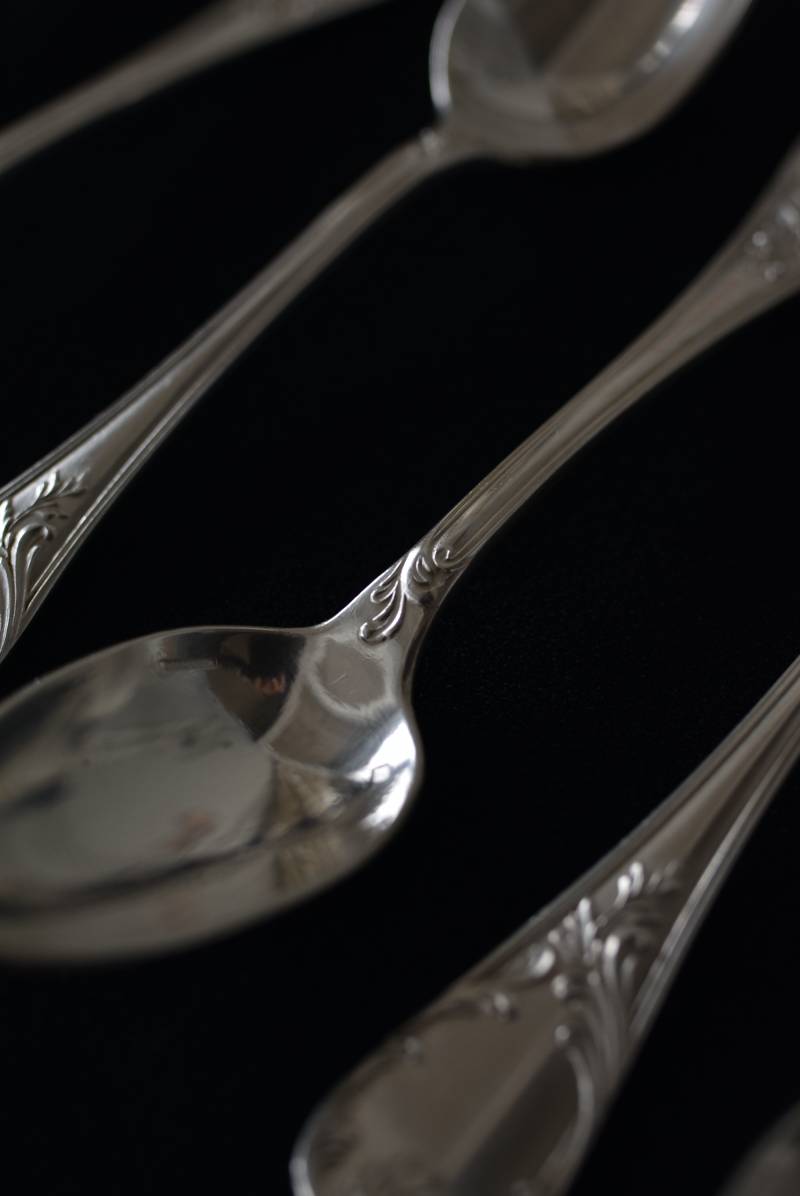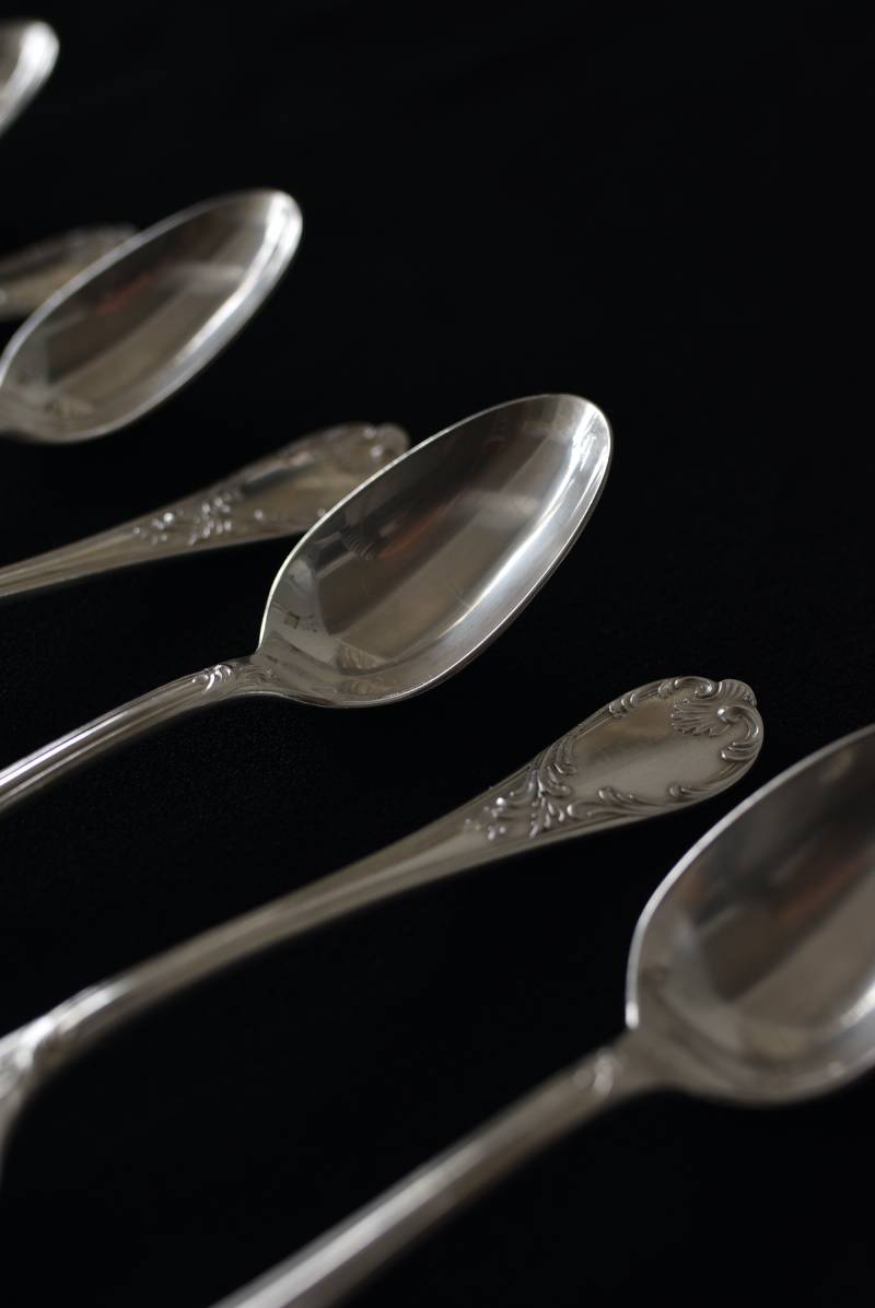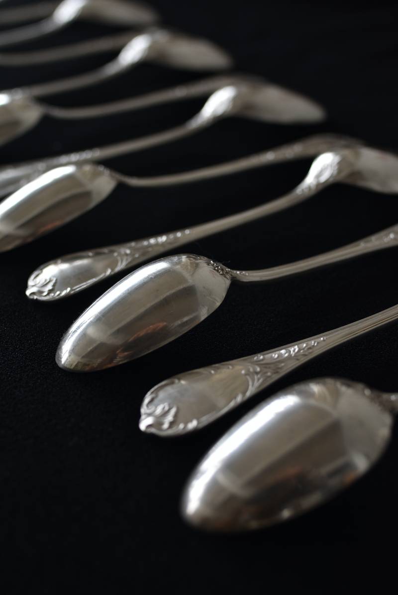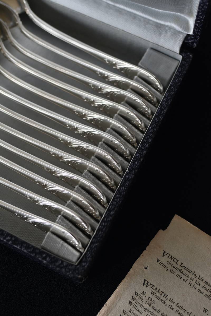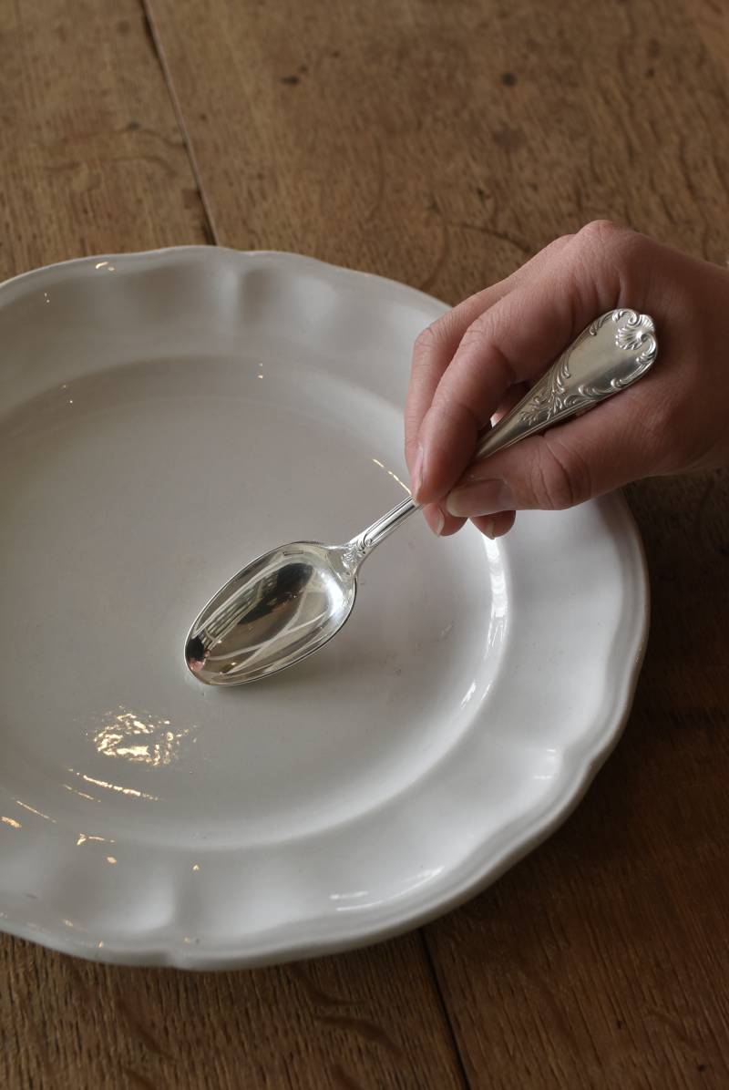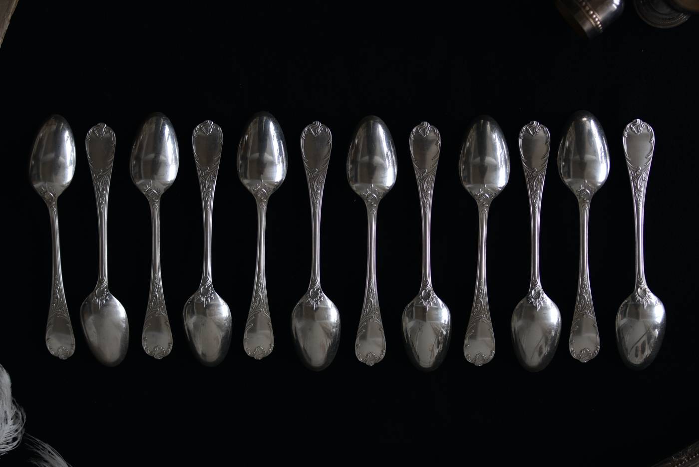 フランス・Christofle(クリストフル)のティースプーン。 こちらは全長14.5cmほどの小さめのスプーン12本のセットになっています。1897年に誕生した"LOUIS XV MARLY"シリーズのもので、アカンサスやシェルなどの自然モチーフからインスピレーションを得たロココ調のデザインが特徴的なクリストフルを代表するコレクションです。美しい輝きを放つシルバープレート製で、すくい根付近に『Christofle』の刻印とCCマークが刻まれています。フランス・オルテズ(Orthez)にある宝石店の名前が印字されたボックスに12本がすっきりと収まっています。 滑らかな曲線を描くシルエットとアシンメトリーな装飾が優雅な姿で、特別な日のテーブルコーディネートにもおすすめの魅力的なアイテムです。 スプーン 全長 約14.5cm 幅 約3cm ボックス W 約16cm D 約14cm H 約4cm