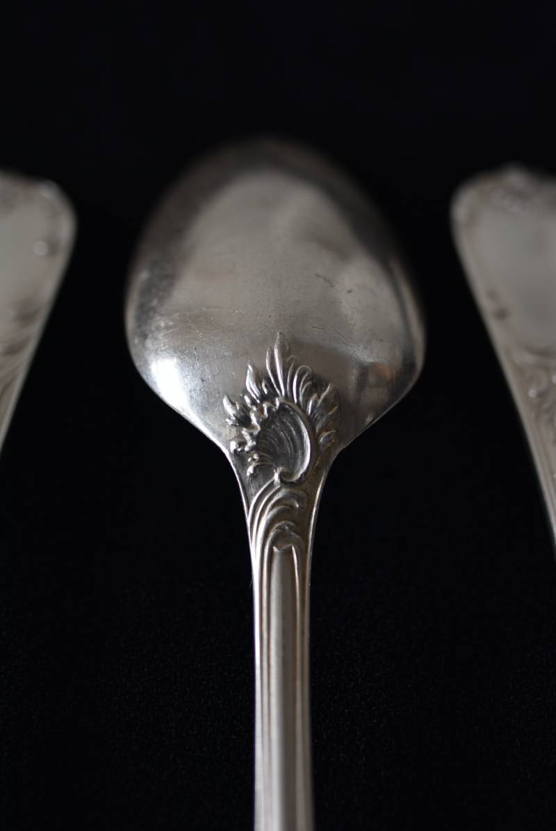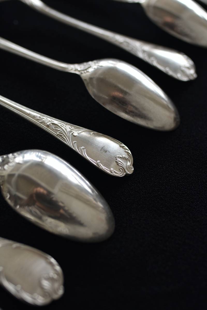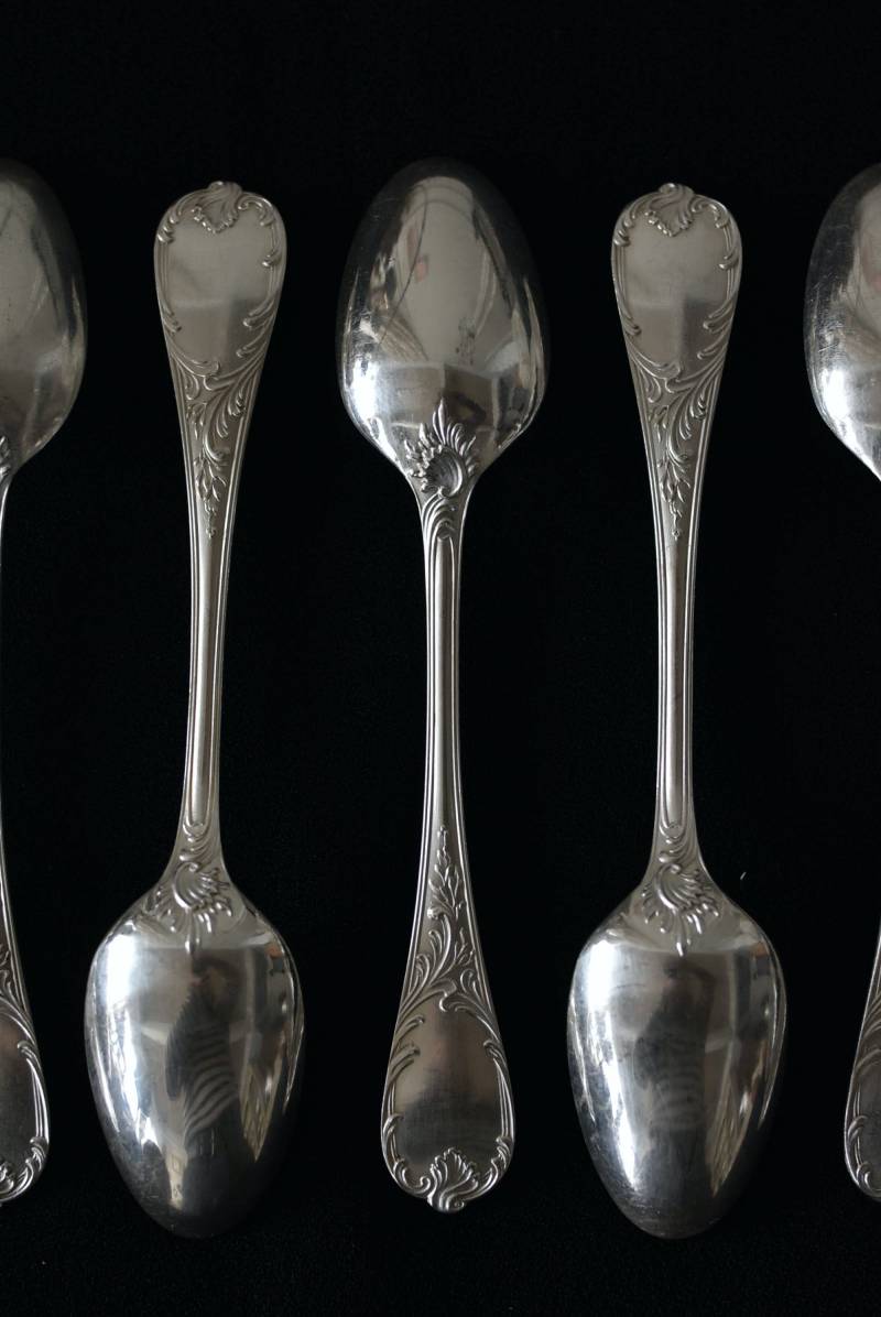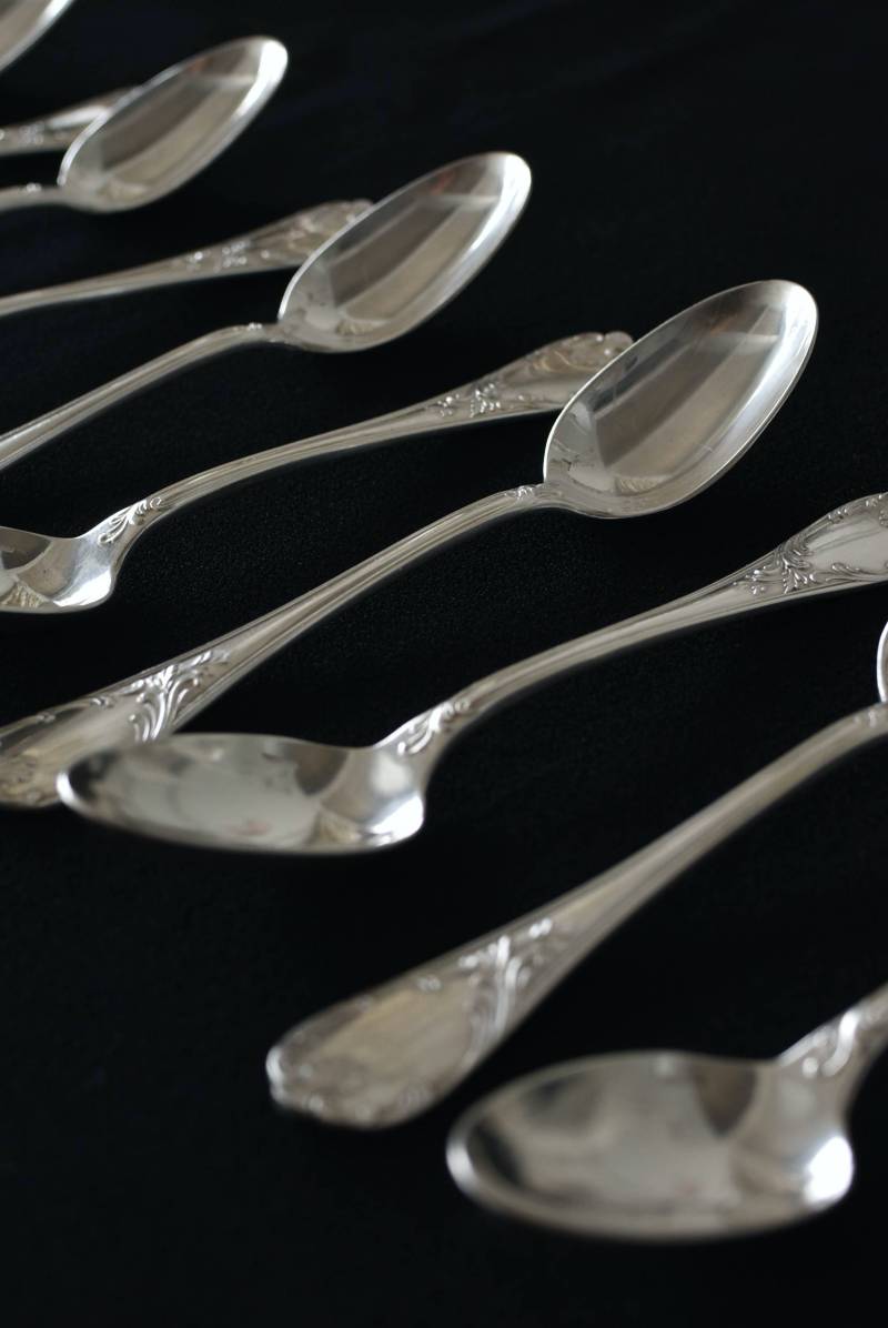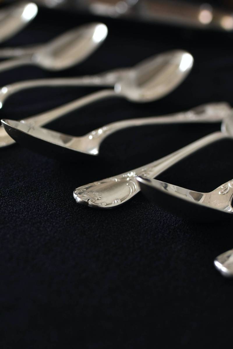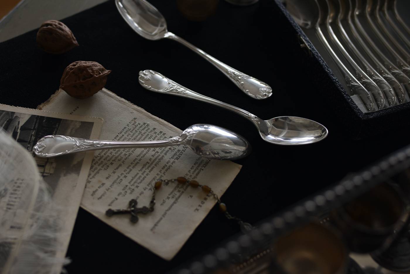フランス・Christofle(クリストフル)のティースプーン。 こちらは全長14.5cmほどの小さめのスプーン12本のセットになっています。1897年に誕生した"LOUIS XV MARLY"シリーズのもので、アカンサスやシェルなどの自然モチーフからインスピレーションを得たロココ調のデザインが特徴的なクリストフルを代表するコレクションです。美しい輝きを放つシルバープレート製で、すくい根付近に『Christofle』の刻印とCCマークが刻まれています。フランス・オルテズ(Orthez)にある宝石店の名前が印字されたボックスに12本がすっきりと収まっています。 滑らかな曲線を描くシルエットとアシンメトリーな装飾が優雅な姿で、特別な日のテーブルコーディネートにもおすすめの魅力的なアイテムです。 スプーン 全長 約14.5cm 幅 約3cm ボックス W 約16cm D 約14cm H 約4cm