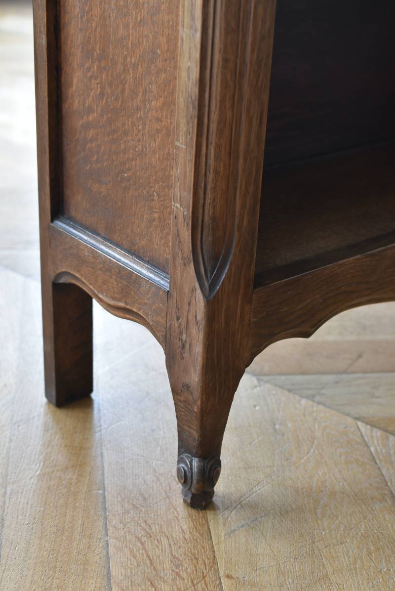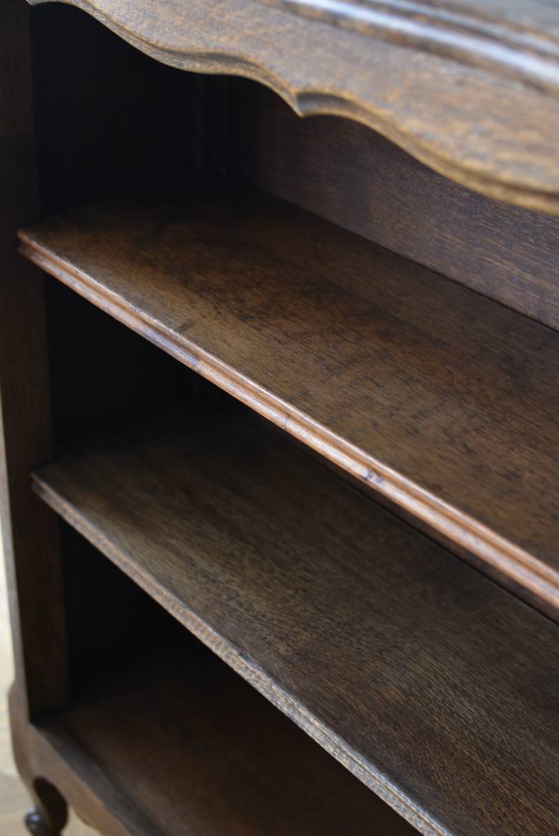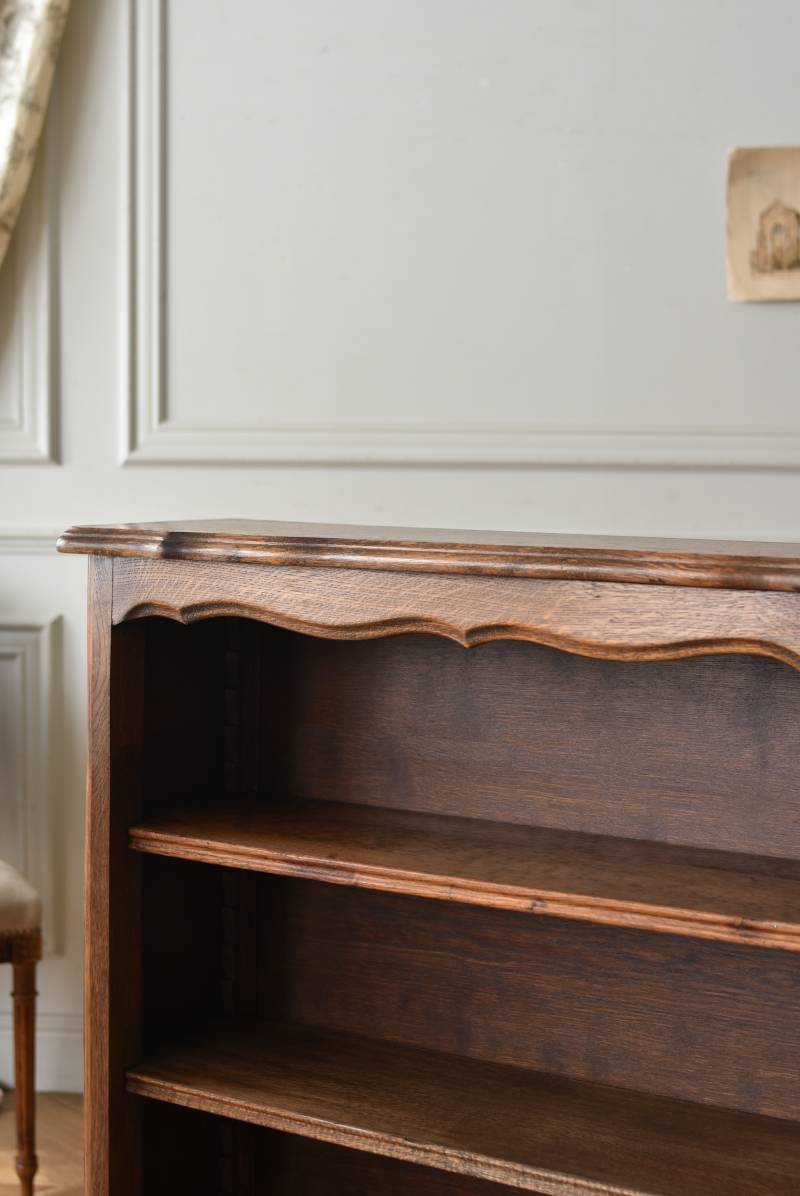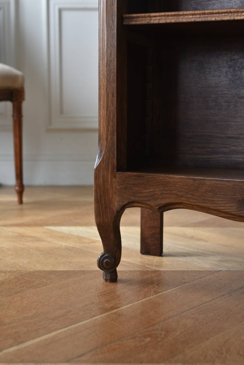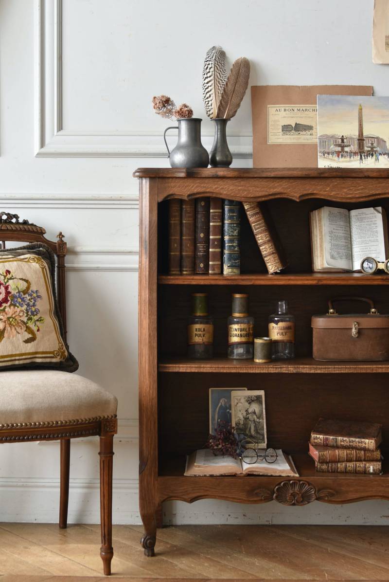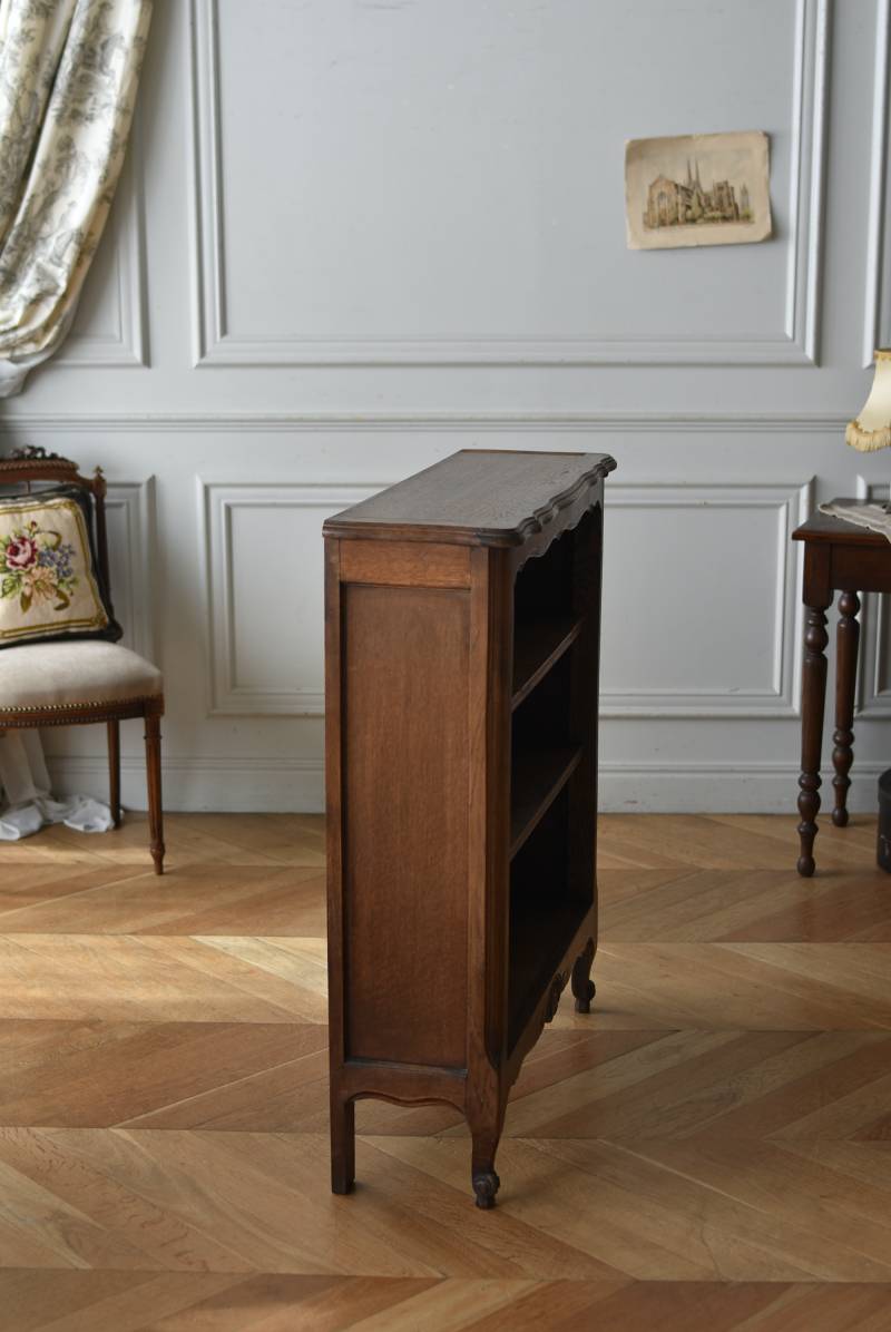 小さな猫脚が程よい抜け感を演出するフランスの3段シェルフ。 落ち着いたダークブラウンカラーのボディはオーク製で、上品な艶感がクラシカルな装い。天板や幕板部分にあしらわれた優雅な波打ちラインが美しく、さりげないシェルモチーフの彫り装飾がフランスらしいエレガントなデザインです。棚板は高さ調節ができ、取り外してのご使用も可能な機能性のある作りに。 本を収納するブックシェルフとしてはもちろん、お気に入りの雑貨や植物などを飾るディスプレイ棚としてもおすすめのアイテムです。 W 約83cm D 約27.5cm H 約100cm 棚板間隔(上から) 約19cm/約20.5cm/約27cm 棚板面積 W約76cm×D約21.5cm 搬入経路について こちらの商品の配送について