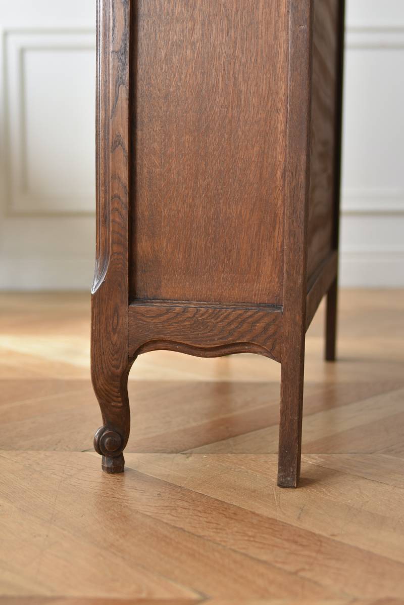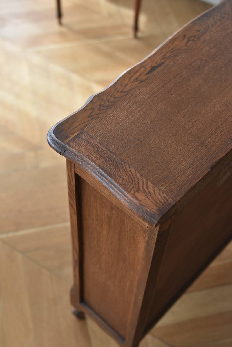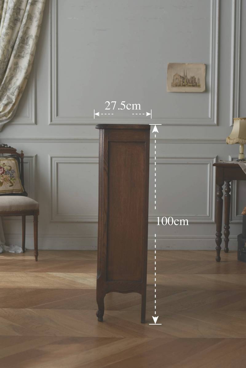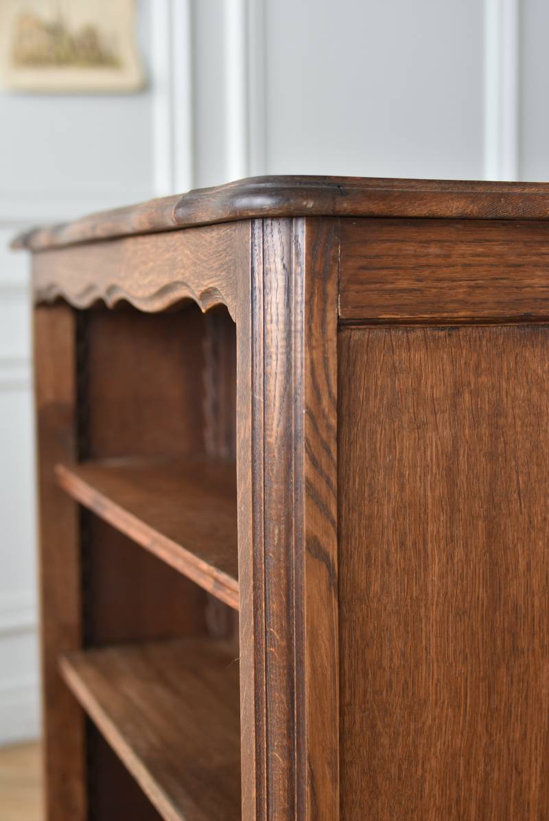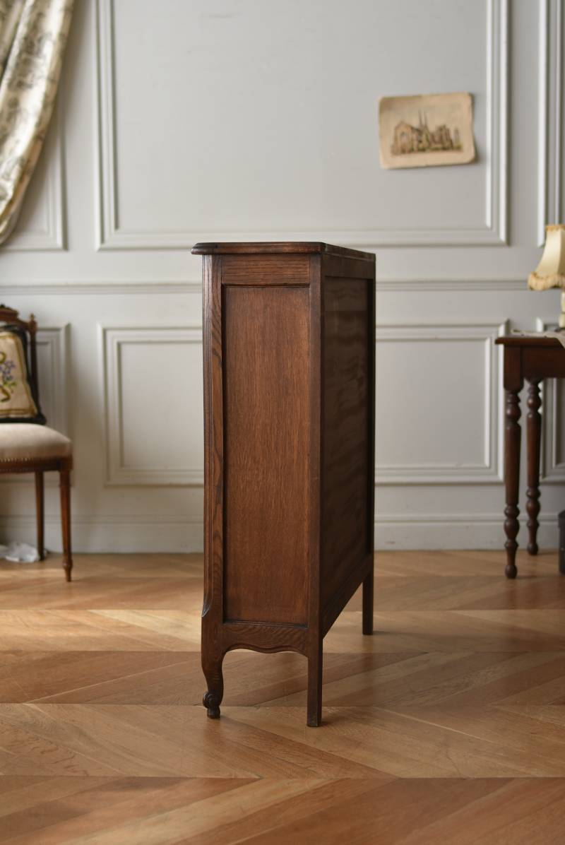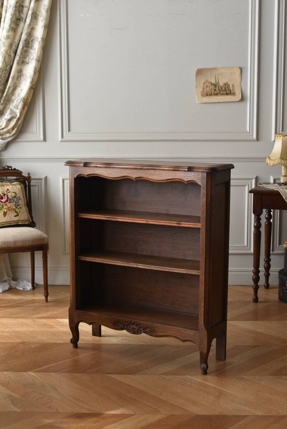 小さな猫脚が程よい抜け感を演出するフランスの3段シェルフ。 落ち着いたダークブラウンカラーのボディはオーク製で、上品な艶感がクラシカルな装い。天板や幕板部分にあしらわれた優雅な波打ちラインが美しく、さりげないシェルモチーフの彫り装飾がフランスらしいエレガントなデザインです。棚板は高さ調節ができ、取り外してのご使用も可能な機能性のある作りに。 本を収納するブックシェルフとしてはもちろん、お気に入りの雑貨や植物などを飾るディスプレイ棚としてもおすすめのアイテムです。 W 約83cm D 約27.5cm H 約100cm 棚板間隔(上から) 約19cm/約20.5cm/約27cm 棚板面積 W約76cm×D約21.5cm 搬入経路について こちらの商品の配送について