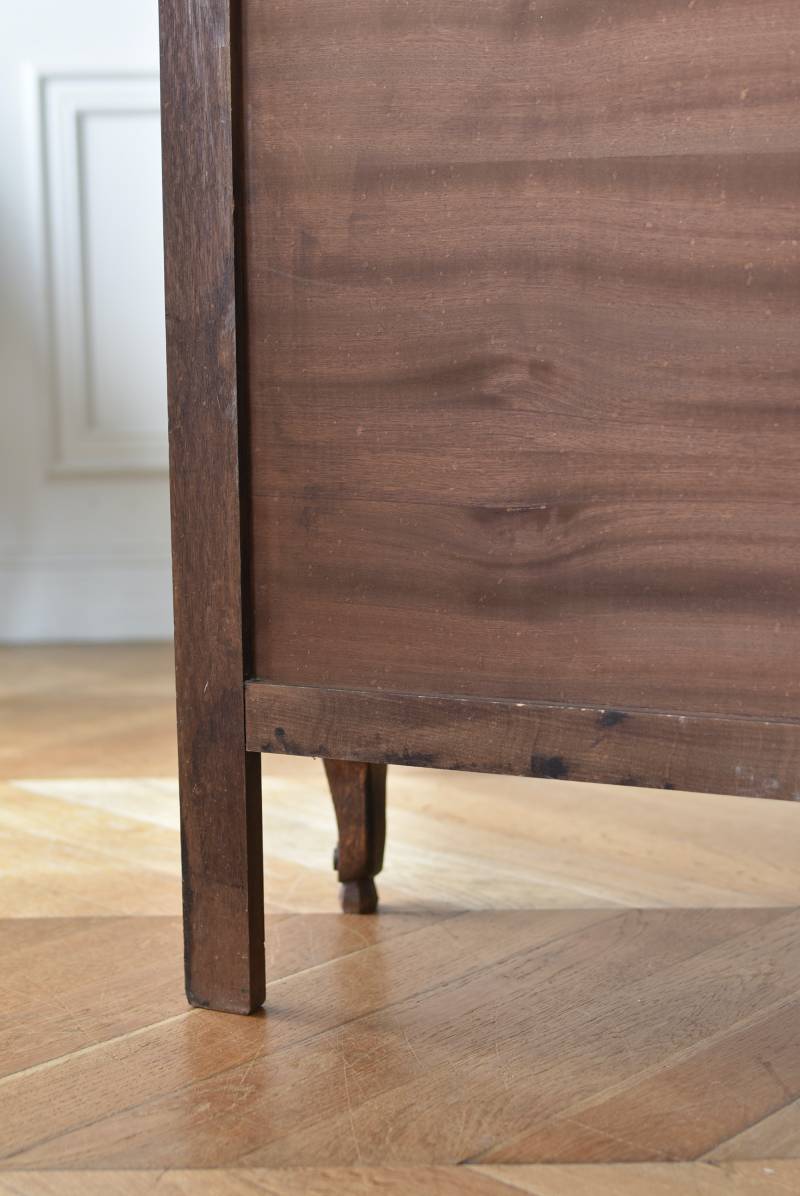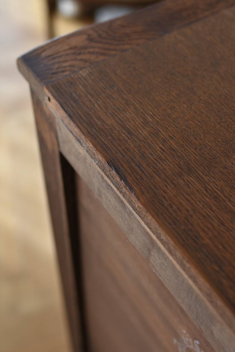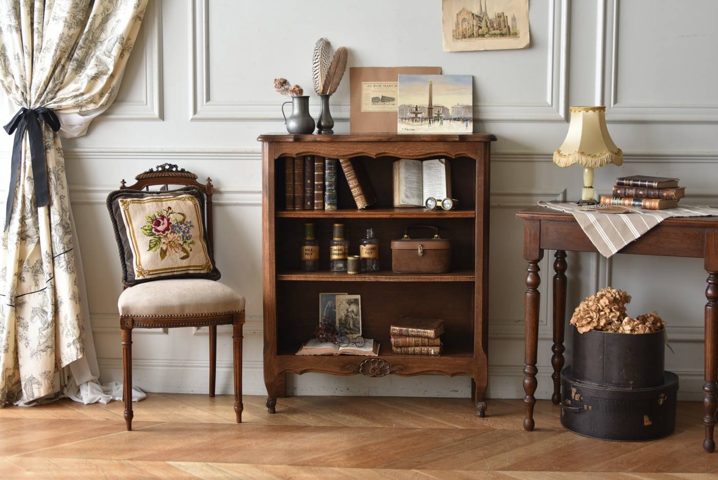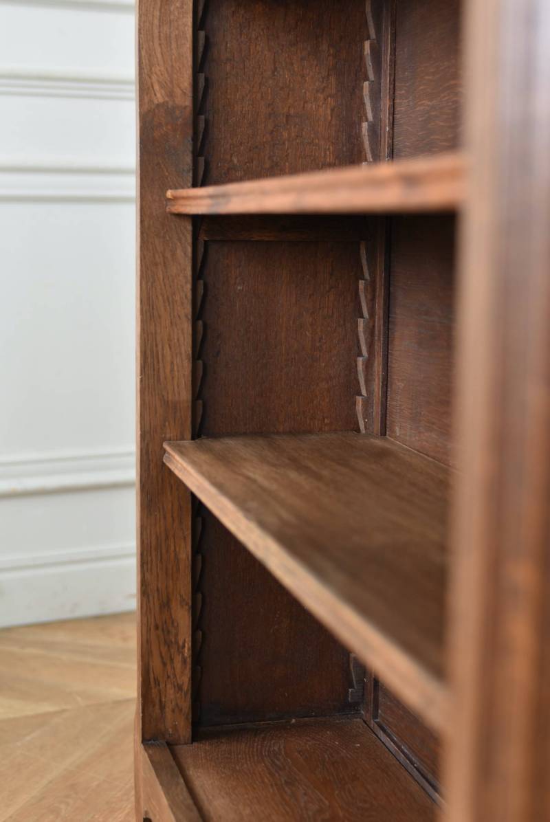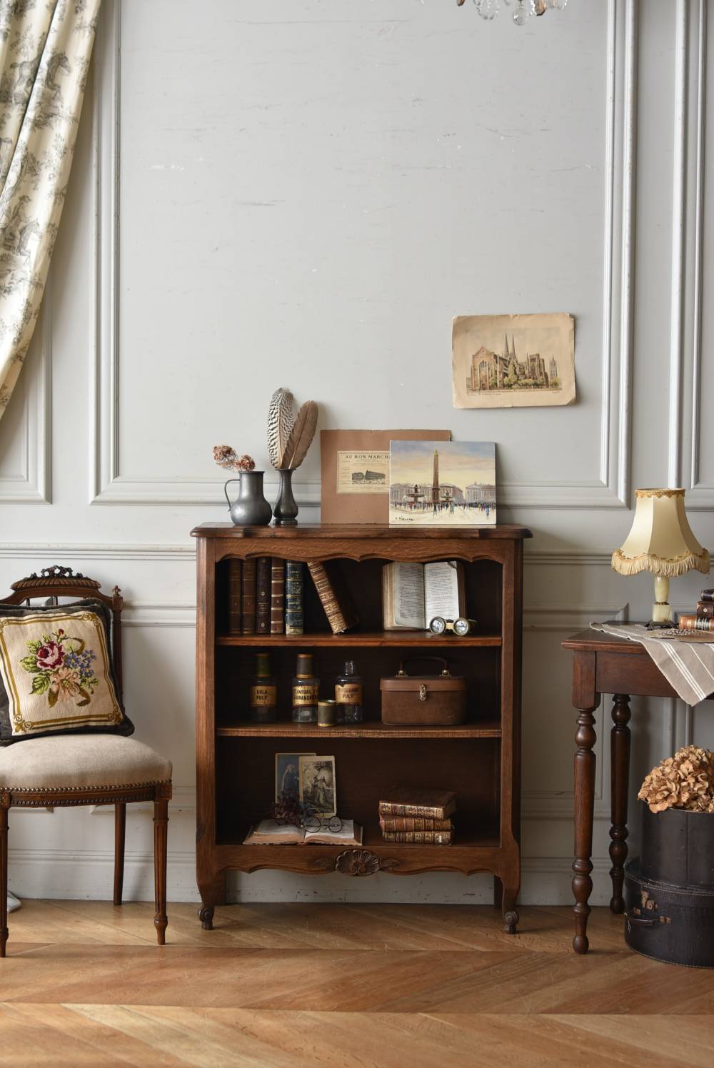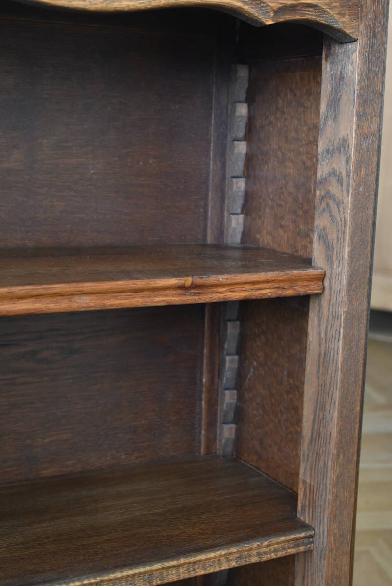 小さな猫脚が程よい抜け感を演出するフランスの3段シェルフ。 落ち着いたダークブラウンカラーのボディはオーク製で、上品な艶感がクラシカルな装い。天板や幕板部分にあしらわれた優雅な波打ちラインが美しく、さりげないシェルモチーフの彫り装飾がフランスらしいエレガントなデザインです。棚板は高さ調節ができ、取り外してのご使用も可能な機能性のある作りに。 本を収納するブックシェルフとしてはもちろん、お気に入りの雑貨や植物などを飾るディスプレイ棚としてもおすすめのアイテムです。 W 約83cm D 約27.5cm H 約100cm 棚板間隔(上から) 約19cm/約20.5cm/約27cm 棚板面積 W約76cm×D約21.5cm 搬入経路について こちらの商品の配送について