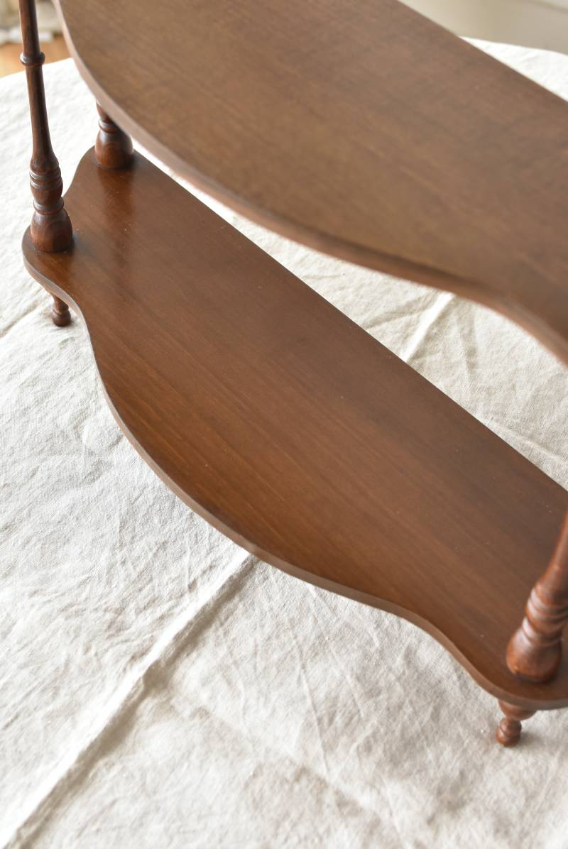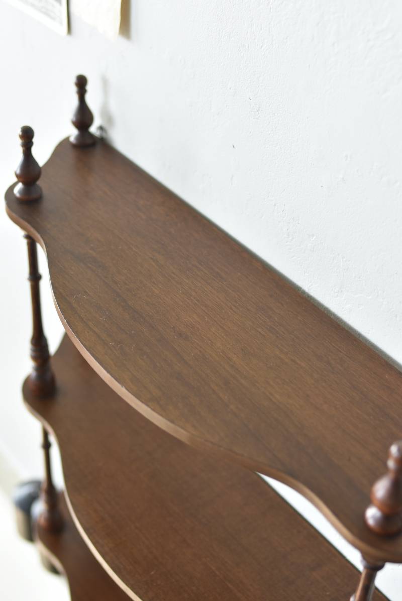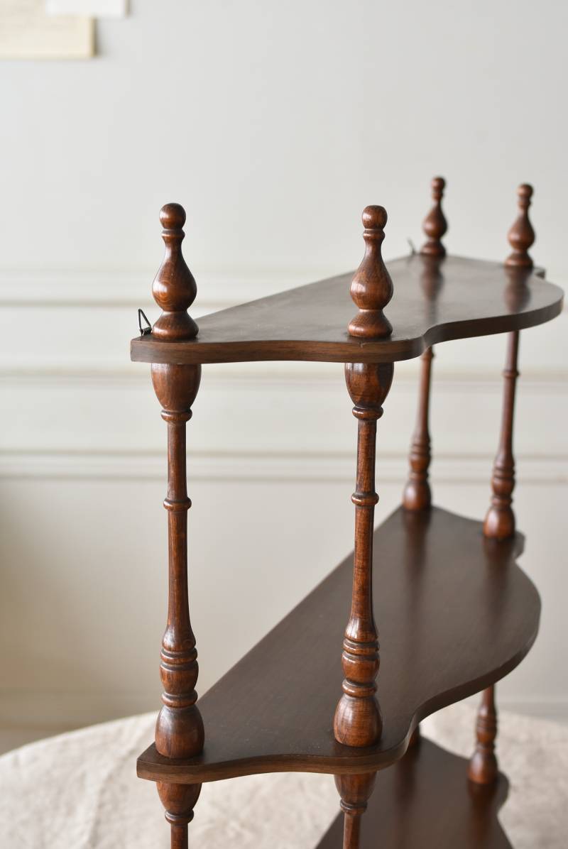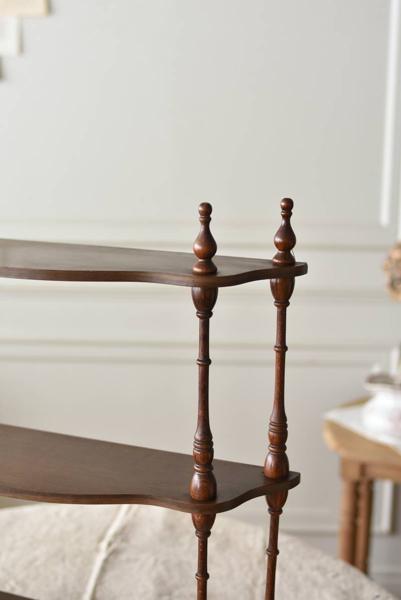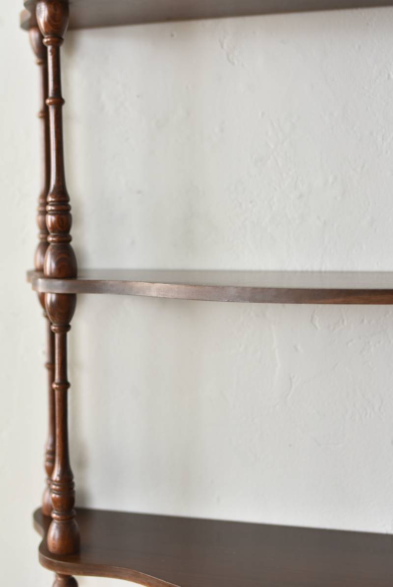 艶やかな質感でこっくりとした深いブラウンカラーが落ち着きあるシックな佇まい。凹凸のはっきりとした細身の支柱が特徴的で、滑らかな曲線を描く棚板ラインが優雅なイメージをもたらしてくれます。