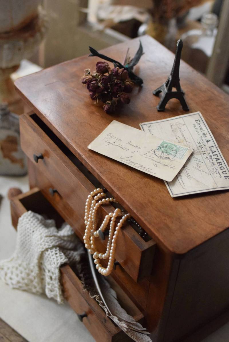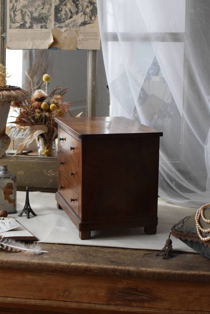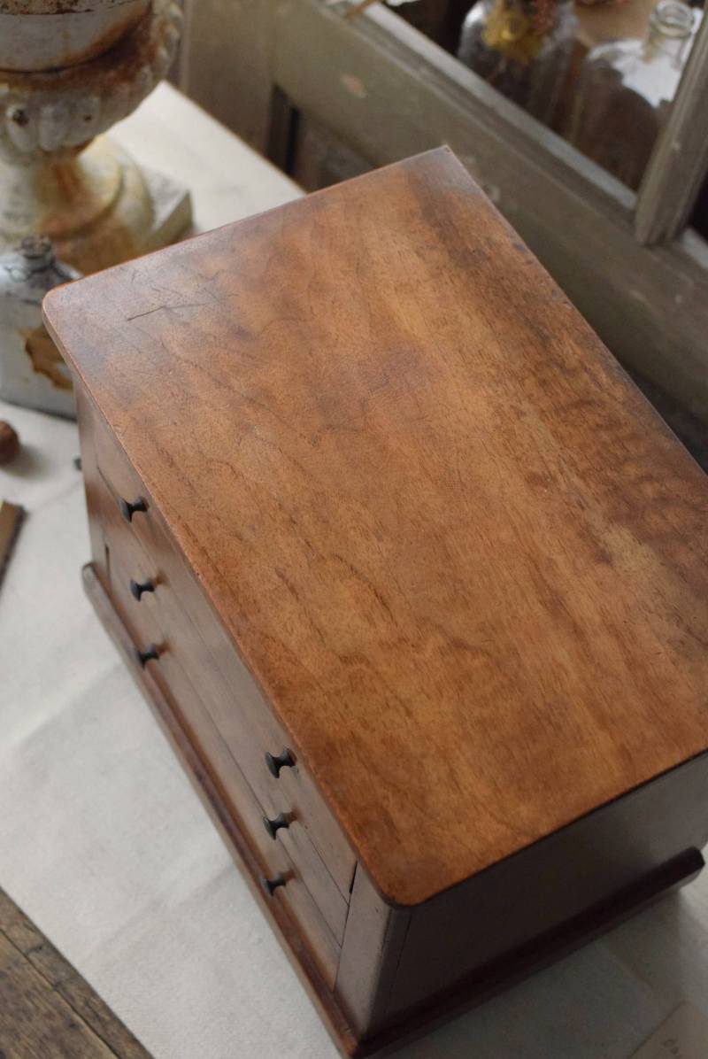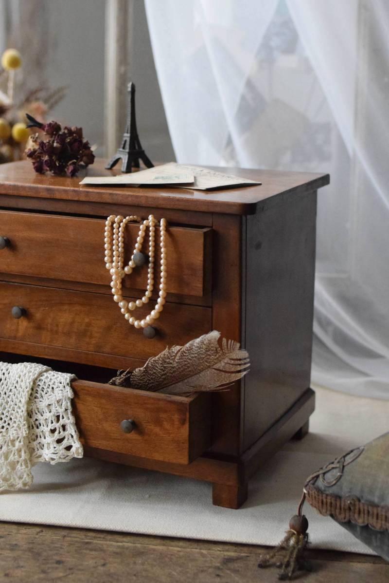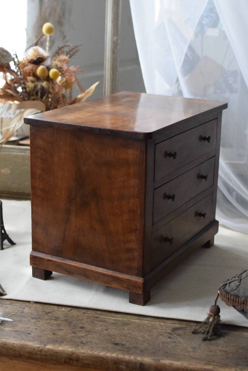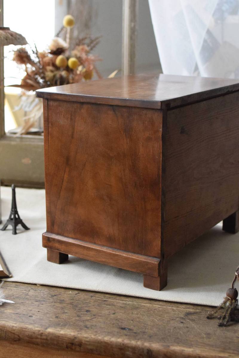 フランスの3段ミニチェスト。 流れるような優しい木目が印象的な卓上型の小さなチェスト。木製ならではの温かみが感じられると共に、さりげない艶感がクラシカルで品のある佇まいです。3段の引き出しは、アクセサリーや手芸用品、日用品などちょっとしたものをしまっておきやすいサイズ感。ドール用の家具としても可愛いですね。 シンプルですのでどんな空間にも馴染みやすく、卓上の雰囲気を深めてくれる趣のあるアイテムです。 W 約32.2cm D 約21.6cm H 約27cm 引き出し内寸 W約23.2cm×D約17.4cm×H約4.5cm