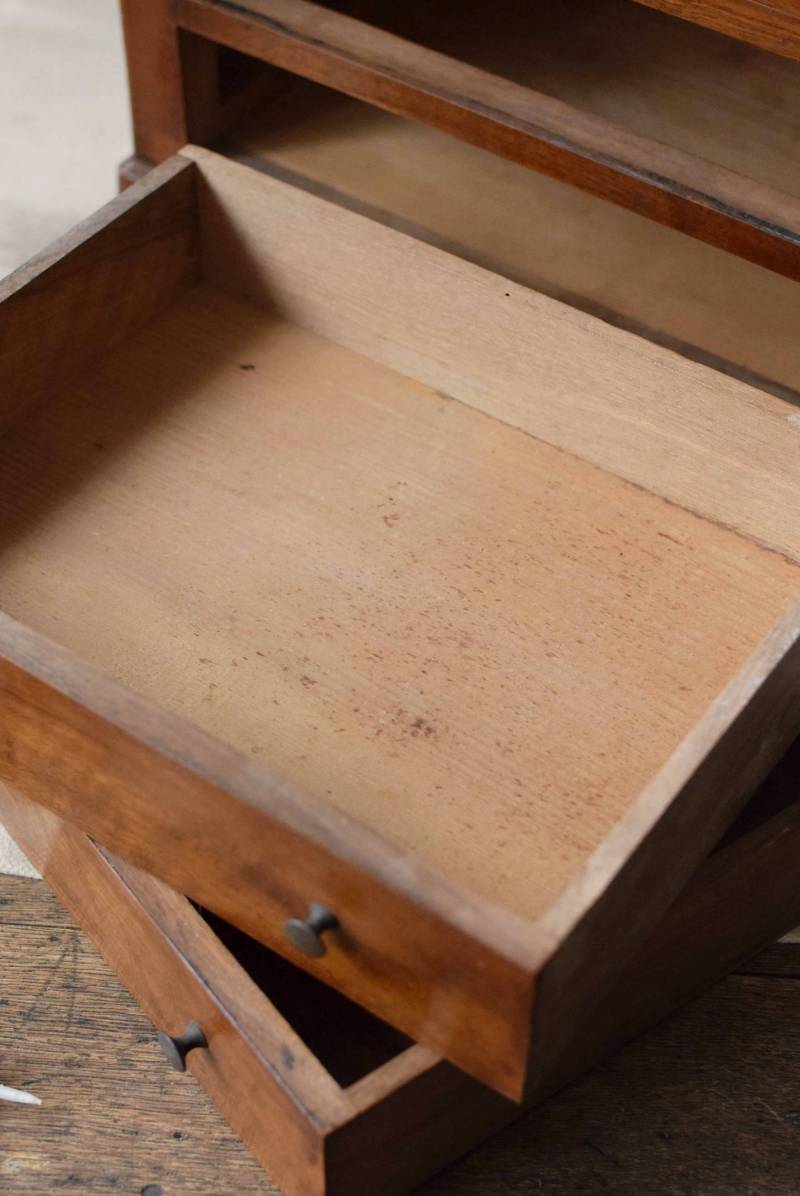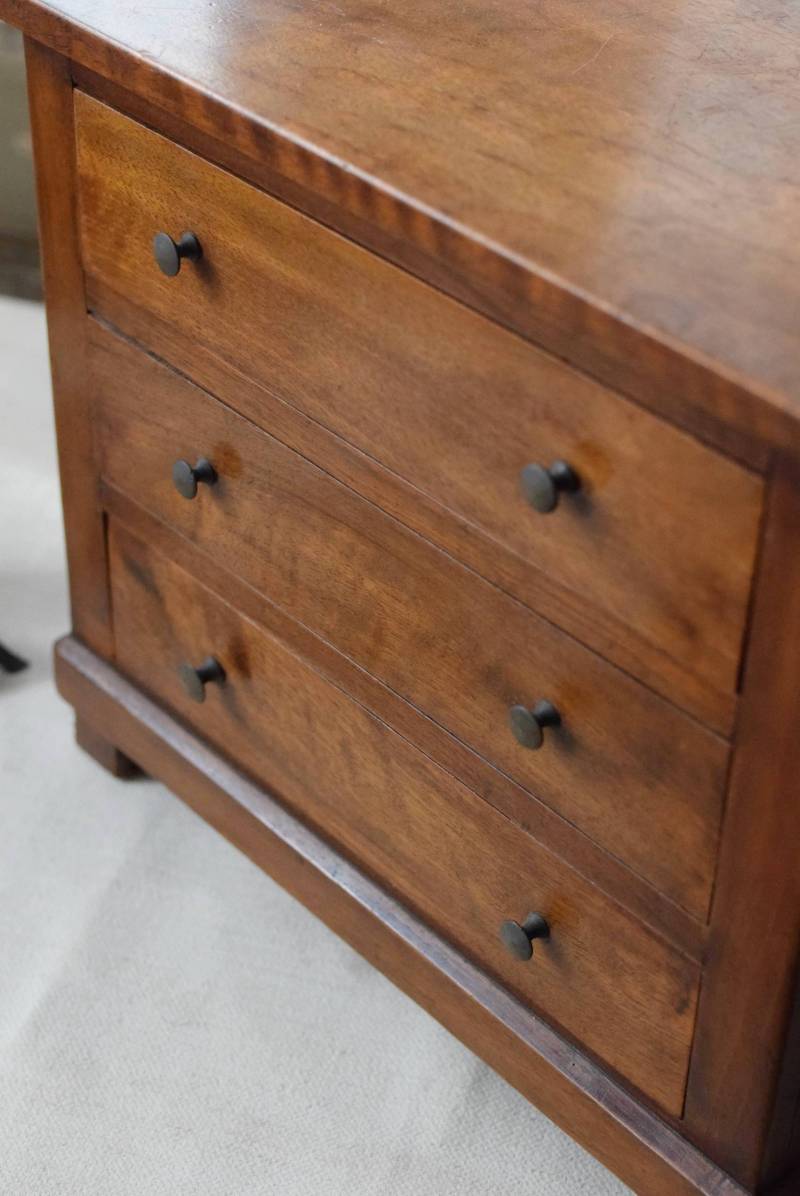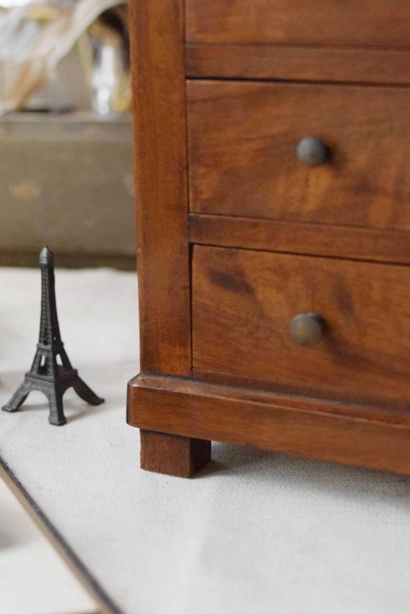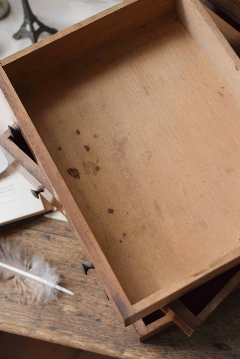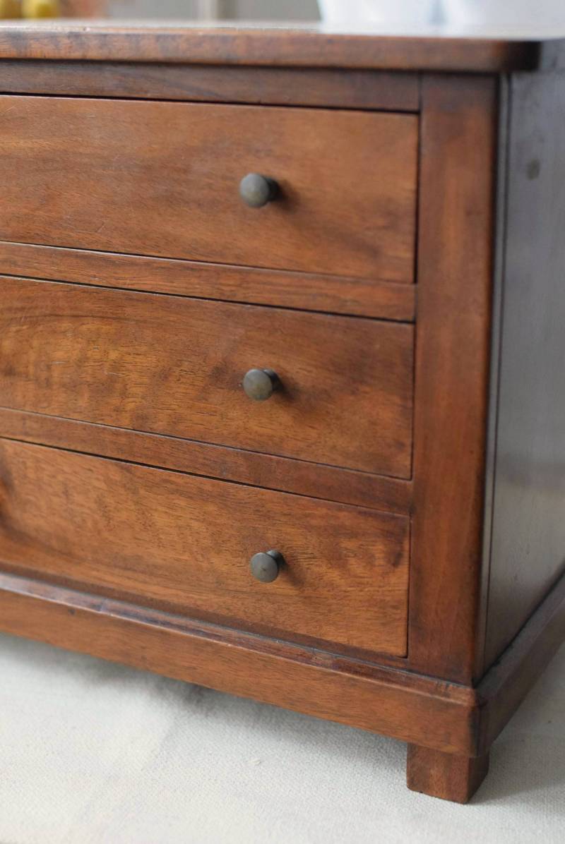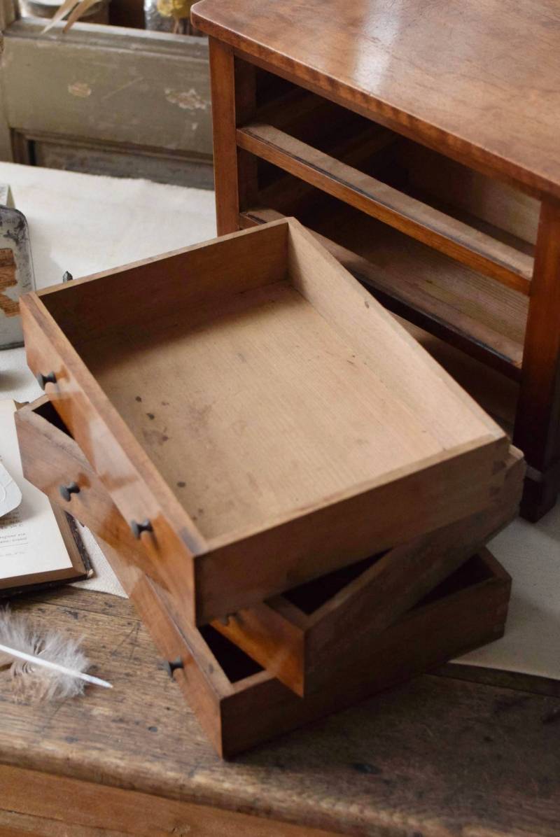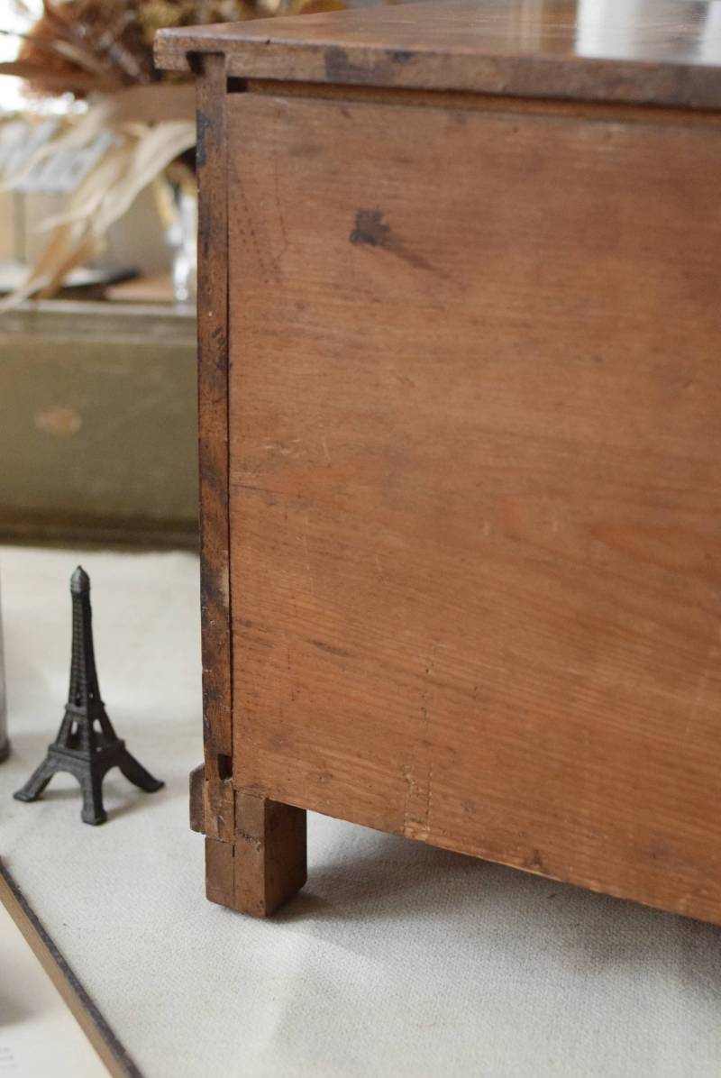 フランスの3段ミニチェスト。 流れるような優しい木目が印象的な卓上型の小さなチェスト。木製ならではの温かみが感じられると共に、さりげない艶感がクラシカルで品のある佇まいです。3段の引き出しは、アクセサリーや手芸用品、日用品などちょっとしたものをしまっておきやすいサイズ感。ドール用の家具としても可愛いですね。 シンプルですのでどんな空間にも馴染みやすく、卓上の雰囲気を深めてくれる趣のあるアイテムです。 W 約32.2cm D 約21.6cm H 約27cm 引き出し内寸 W約23.2cm×D約17.4cm×H約4.5cm