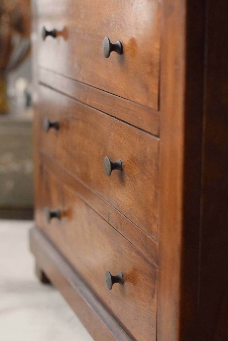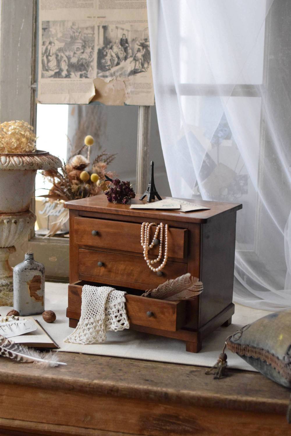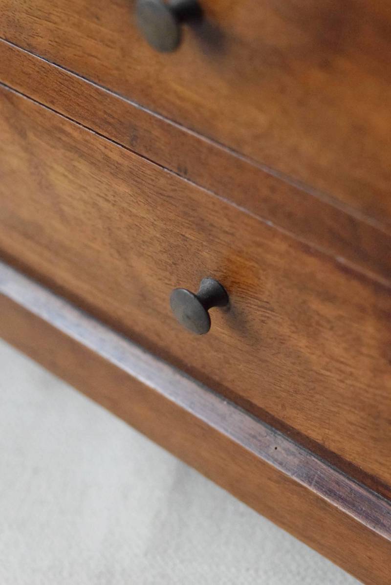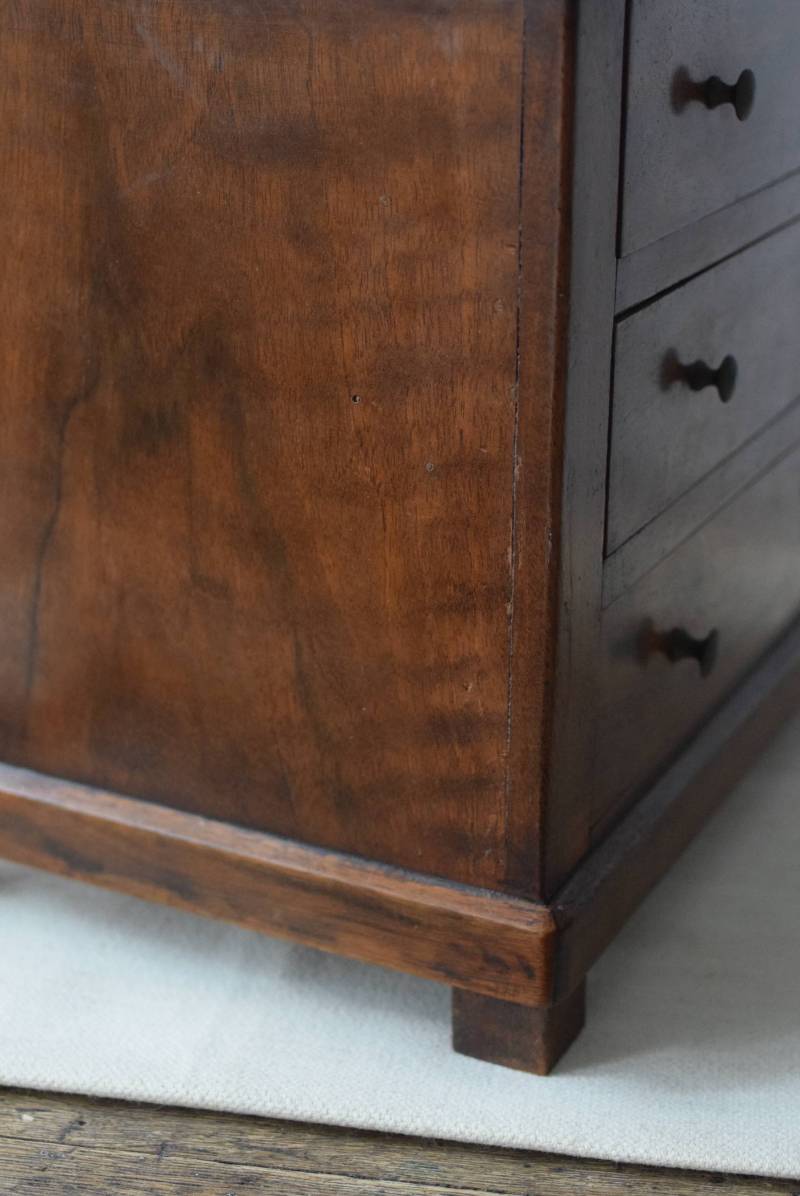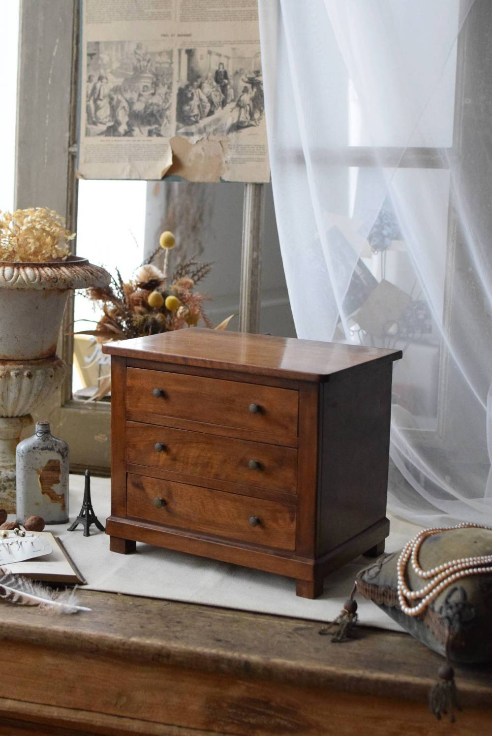 フランスの3段ミニチェスト。 流れるような優しい木目が印象的な卓上型の小さなチェスト。木製ならではの温かみが感じられると共に、さりげない艶感がクラシカルで品のある佇まいです。3段の引き出しは、アクセサリーや手芸用品、日用品などちょっとしたものをしまっておきやすいサイズ感。ドール用の家具としても可愛いですね。 シンプルですのでどんな空間にも馴染みやすく、卓上の雰囲気を深めてくれる趣のあるアイテムです。 W 約32.2cm D 約21.6cm H 約27cm 引き出し内寸 W約23.2cm×D約17.4cm×H約4.5cm
