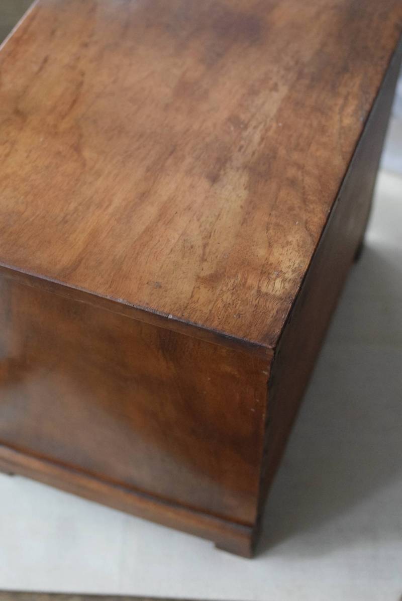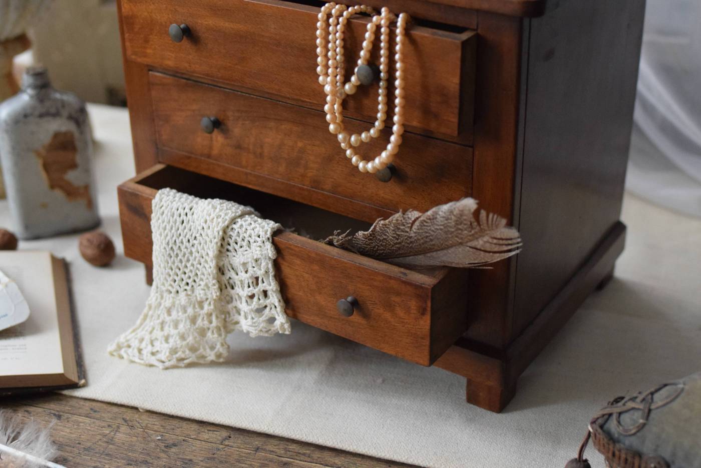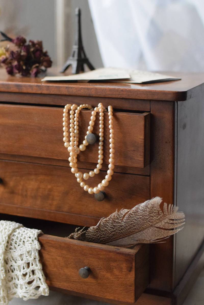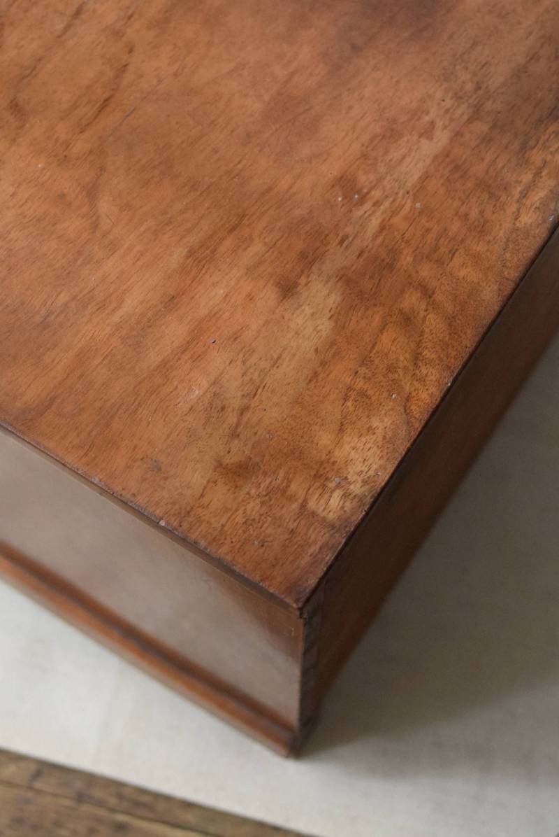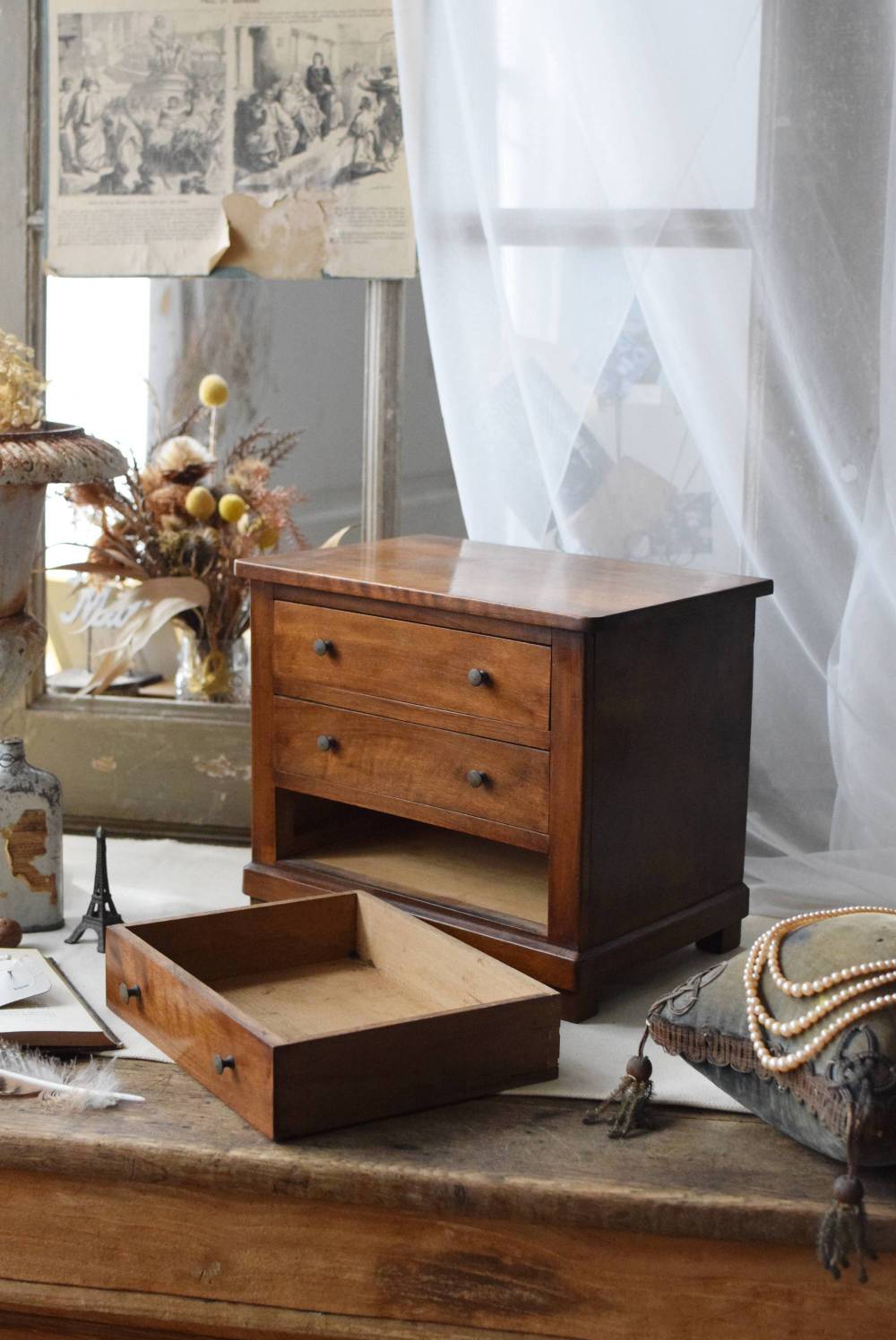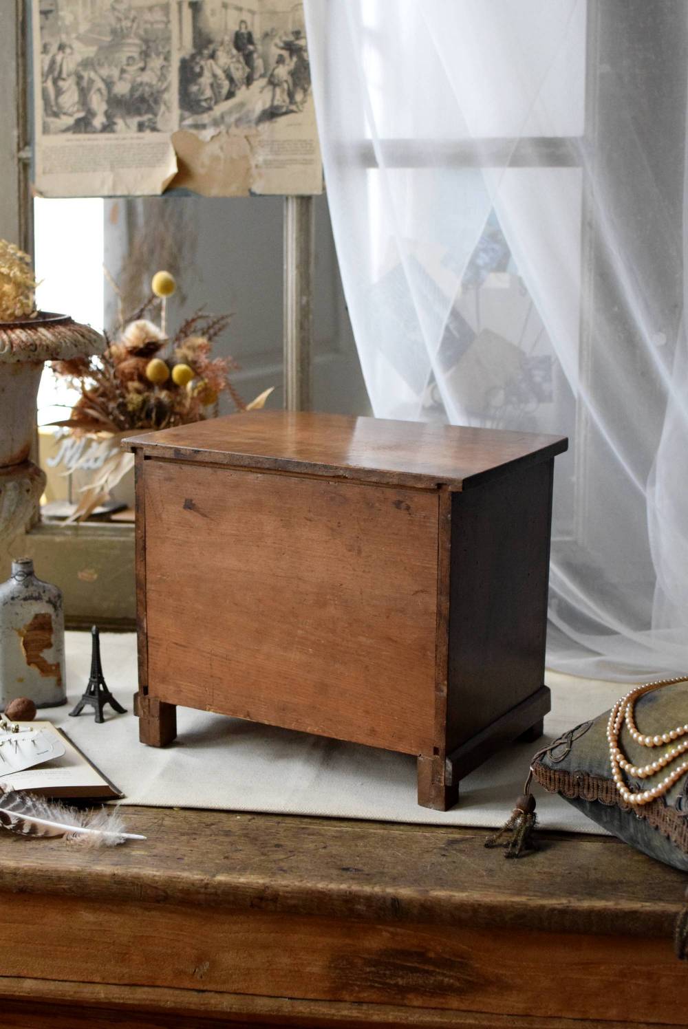フランスの3段ミニチェスト。 流れるような優しい木目が印象的な卓上型の小さなチェスト。木製ならではの温かみが感じられると共に、さりげない艶感がクラシカルで品のある佇まいです。3段の引き出しは、アクセサリーや手芸用品、日用品などちょっとしたものをしまっておきやすいサイズ感。ドール用の家具としても可愛いですね。 シンプルですのでどんな空間にも馴染みやすく、卓上の雰囲気を深めてくれる趣のあるアイテムです。 W 約32.2cm D 約21.6cm H 約27cm 引き出し内寸 W約23.2cm×D約17.4cm×H約4.5cm