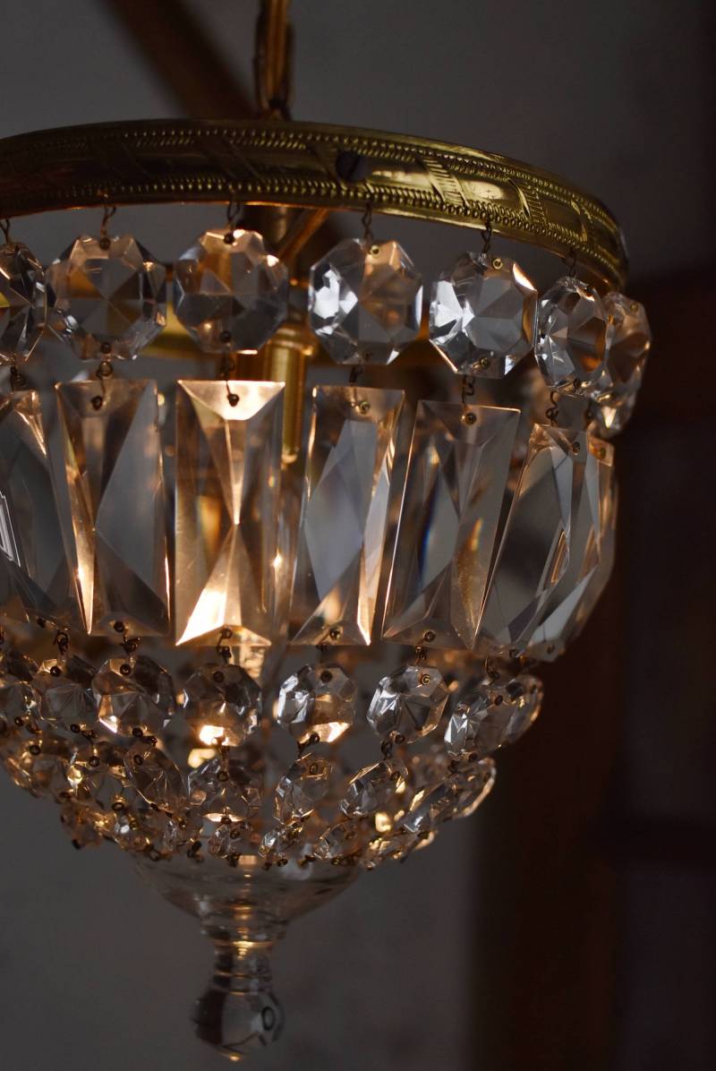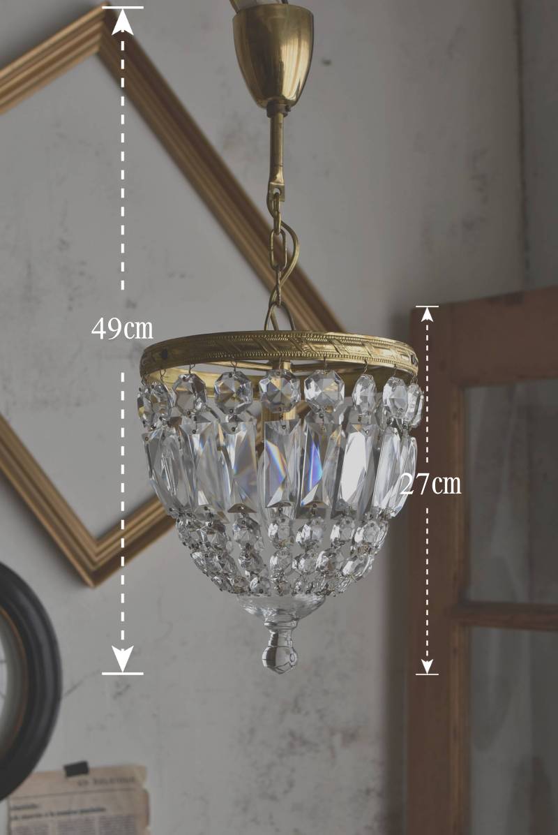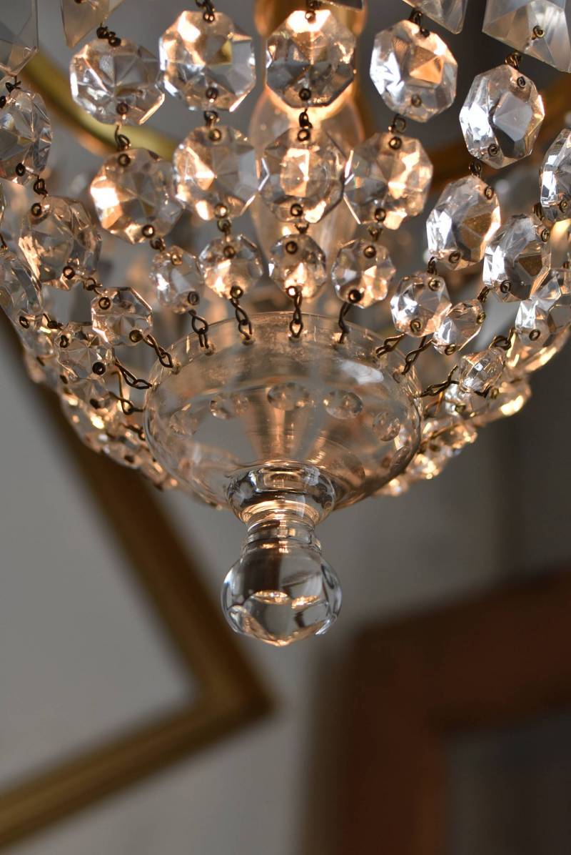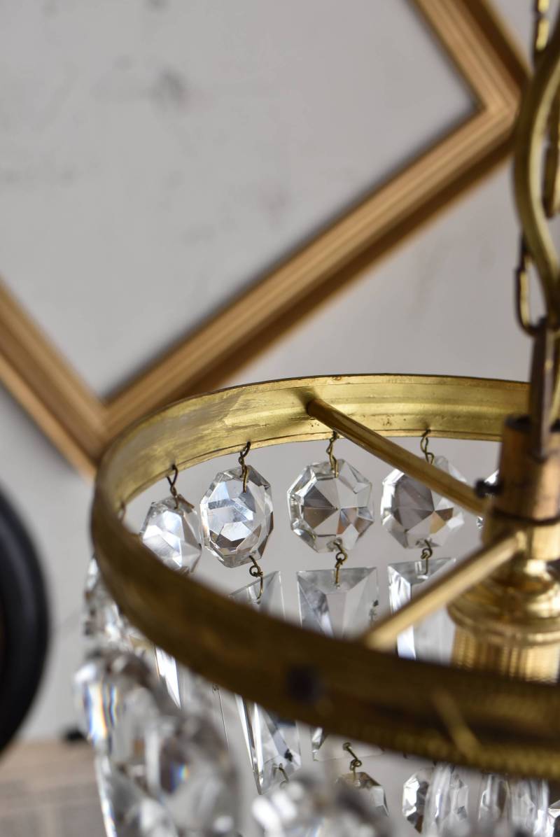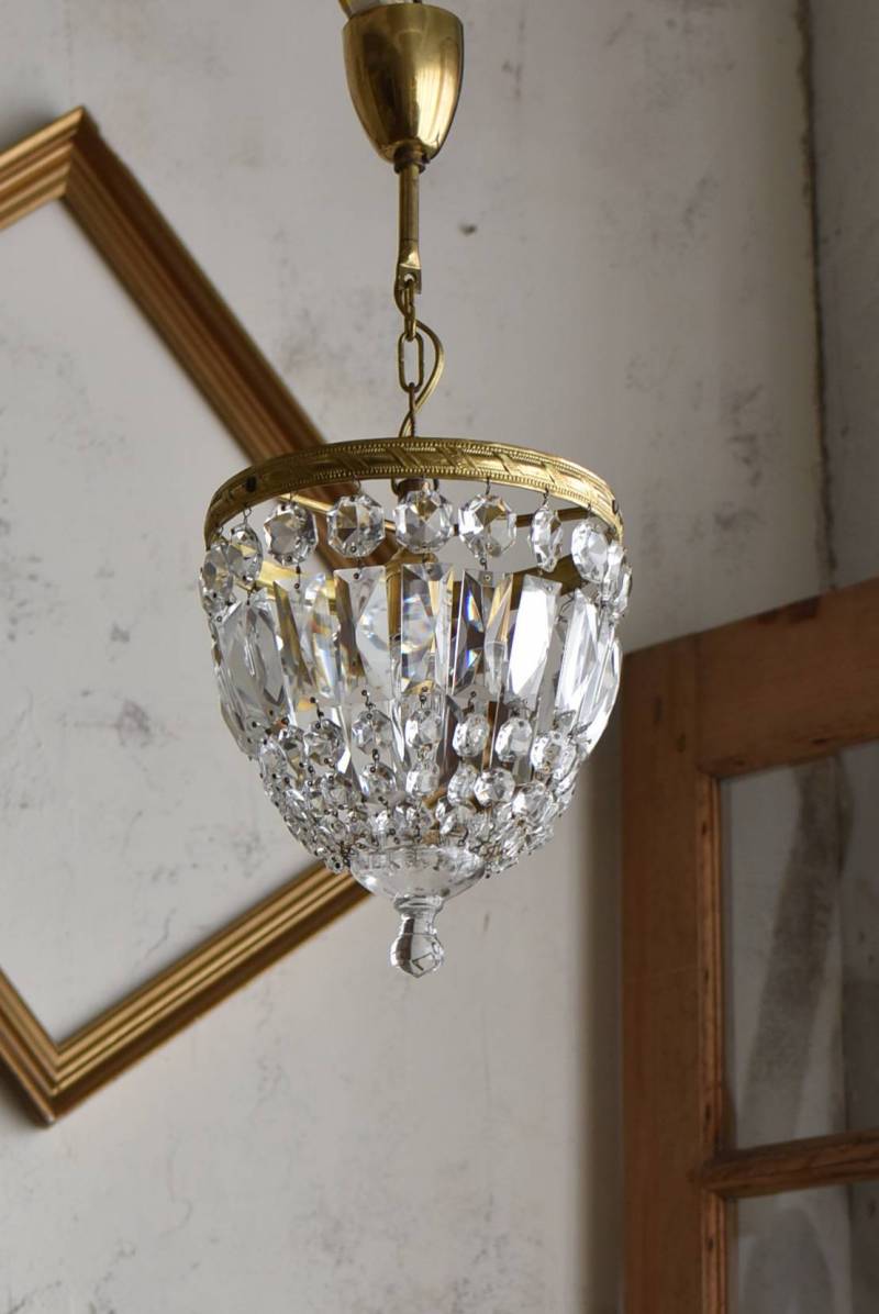 フランスの1灯ペンダントランプ。 綺麗なカットデザインがあしらわれたガラスパーツが連なったふんわりと丸みのあるフォルムの先端のパーツまでもガラス製となっており、澄んだ表情を楽しませてくれます。上部のフレームには細かな模様が施され、パールやリボンを巻いたようなデザインによって気品高い印象をもたらしてくれそうです。 古いものですのでガラスパーツにカケなどが見受けられます。コード・ソケット・シーリングは新しいものに交換済みです。こちらの商品は条件を満たしているので引掛シーリングをご使用いただけます。元は直付けで使われていた物で天井カバーが浅い為、天井との間に若干の隙間ができます。天井との隙間が気になられる方は直付け工事をおすすめします。 電球は付属しません。 直径 約21cm H 約27cm コード含む全長 約49cm 重量 約1.6kg 電球口径 E17 *60W以下をご使用下さい。