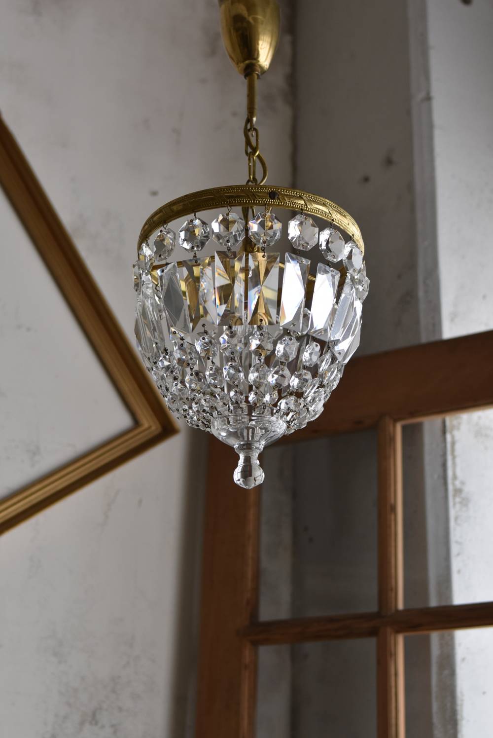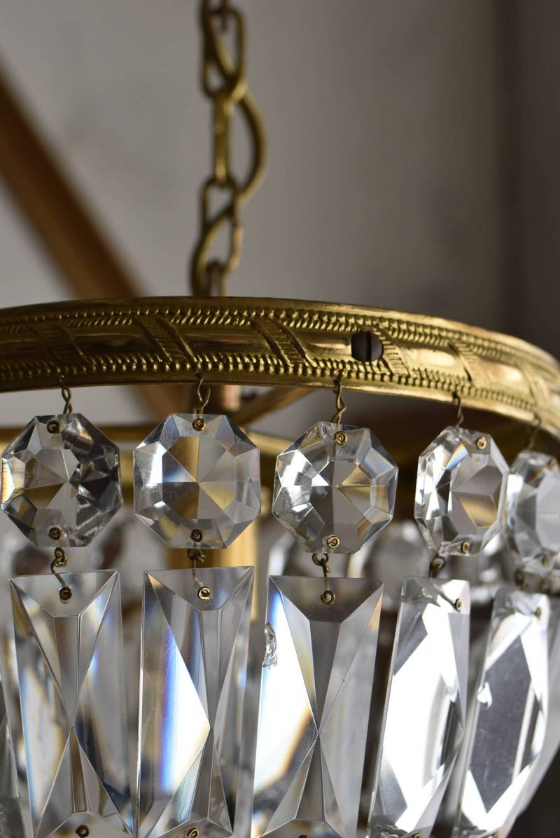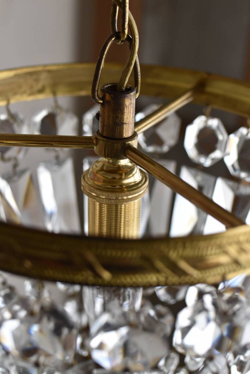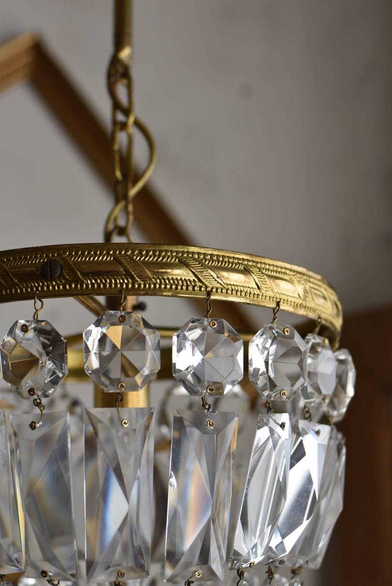 フランスの1灯ペンダントランプ。 綺麗なカットデザインがあしらわれたガラスパーツが連なったふんわりと丸みのあるフォルムの先端のパーツまでもガラス製となっており、澄んだ表情を楽しませてくれます。上部のフレームには細かな模様が施され、パールやリボンを巻いたようなデザインによって気品高い印象をもたらしてくれそうです。 古いものですのでガラスパーツにカケなどが見受けられます。コード・ソケット・シーリングは新しいものに交換済みです。こちらの商品は条件を満たしているので引掛シーリングをご使用いただけます。元は直付けで使われていた物で天井カバーが浅い為、天井との間に若干の隙間ができます。天井との隙間が気になられる方は直付け工事をおすすめします。 電球は付属しません。 直径 約21cm H 約27cm コード含む全長 約49cm 重量 約1.6kg 電球口径 E17 *60W以下をご使用下さい。