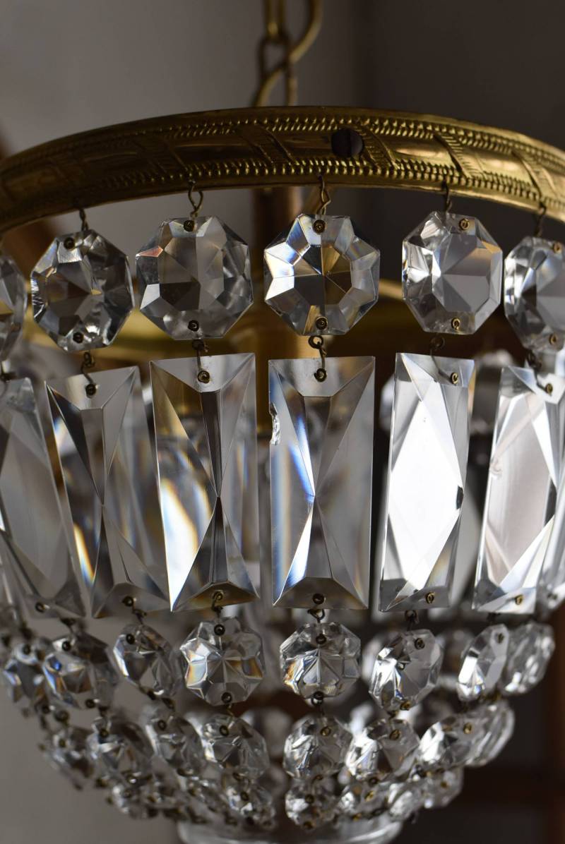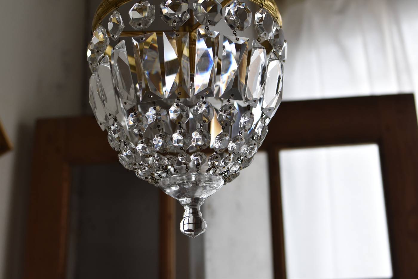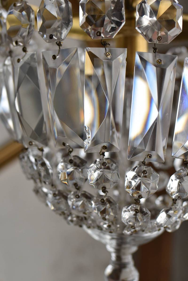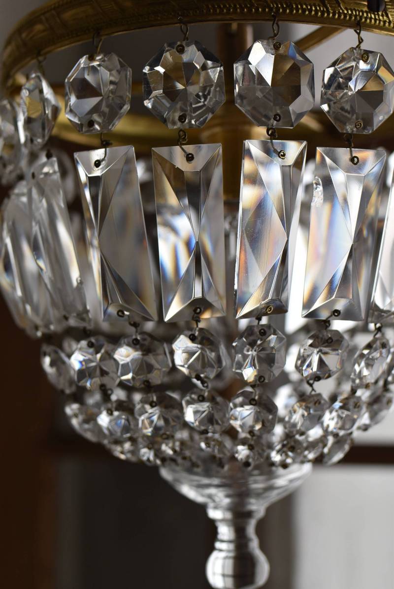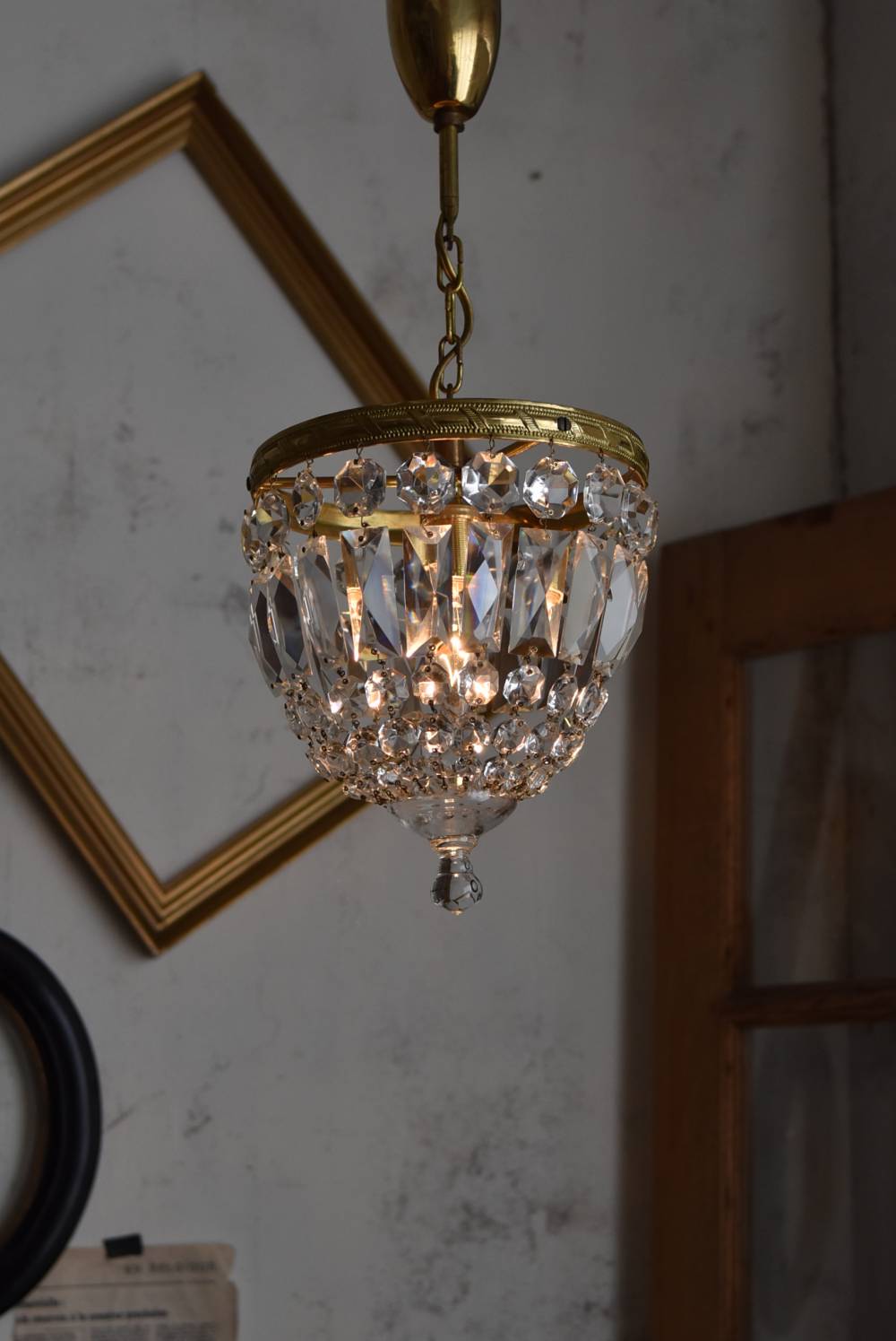 フランスの1灯ペンダントランプ。 綺麗なカットデザインがあしらわれたガラスパーツが連なったふんわりと丸みのあるフォルムの先端のパーツまでもガラス製となっており、澄んだ表情を楽しませてくれます。上部のフレームには細かな模様が施され、パールやリボンを巻いたようなデザインによって気品高い印象をもたらしてくれそうです。 古いものですのでガラスパーツにカケなどが見受けられます。コード・ソケット・シーリングは新しいものに交換済みです。こちらの商品は条件を満たしているので引掛シーリングをご使用いただけます。元は直付けで使われていた物で天井カバーが浅い為、天井との間に若干の隙間ができます。天井との隙間が気になられる方は直付け工事をおすすめします。 電球は付属しません。 直径 約21cm H 約27cm コード含む全長 約49cm 重量 約1.6kg 電球口径 E17 *60W以下をご使用下さい。