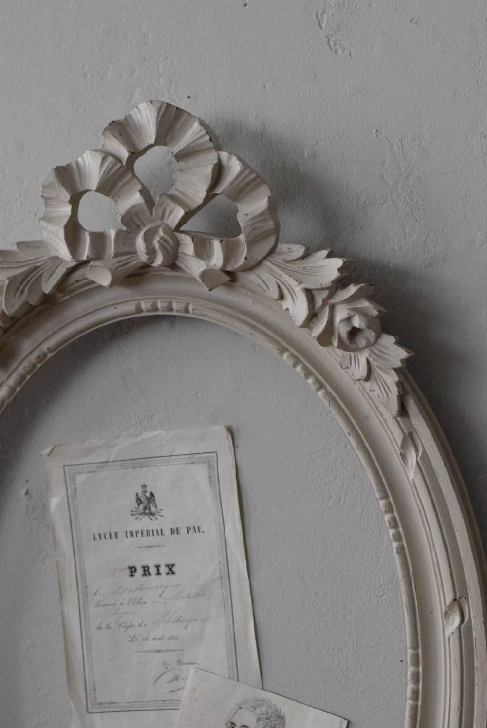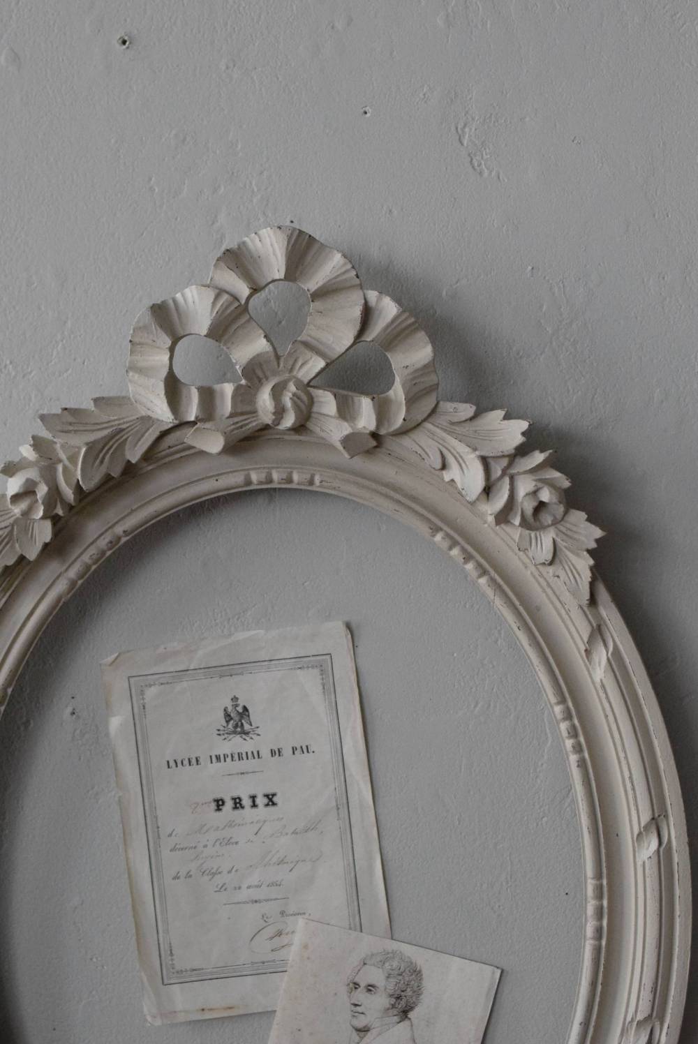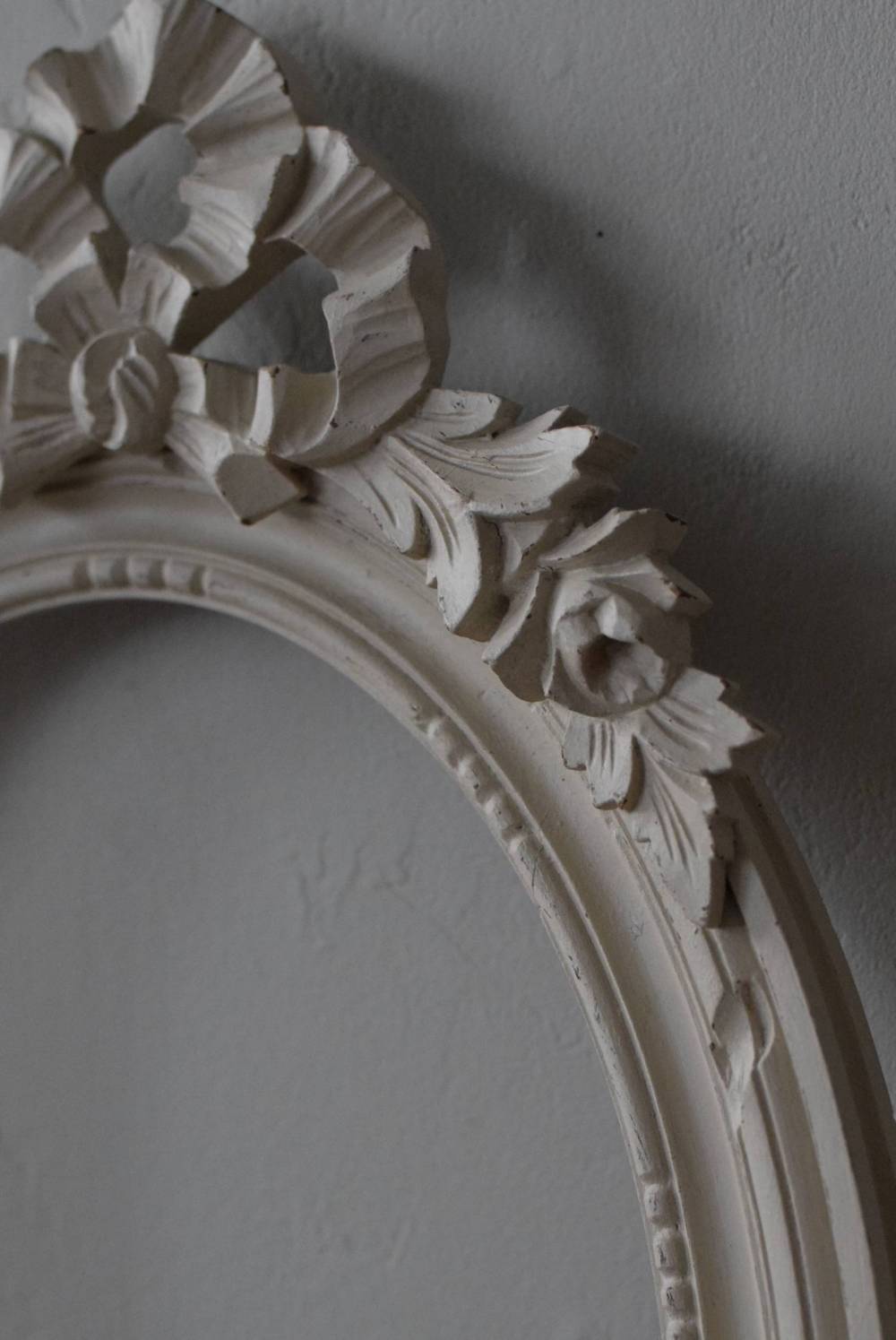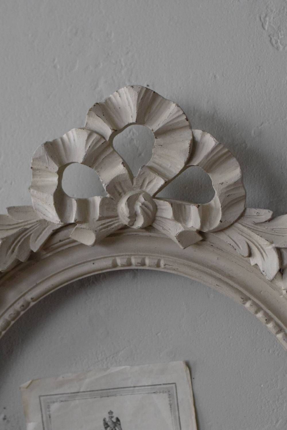 フランスのオーバルフレーム。 トップで圧倒的な存在感を放つ、大きなリボンのモチーフが目を引くアイテム。リボンに寄り添う草花のモチーフは活力に溢れながらもエレガントな姿で、オーバルのフレームにも、程よい厚みと立体感があり、壁に飾ると奥行き感をもたらしてくれます。 背板やガラスがないのでアレンジもしやすく、グレージュのような優しいカラーで、そっと空間に馴染む美しさです。よく似たタイプのフレームがもう一点ありますが(オーバルフレーム.リボン30)細かなデザインやサイズ感が少し異なります。 W 約38.3cm D 約4cm+金具 約1.5cm H 約55.5cm 内寸 W約28.5cm×H約38.5cm 重量 約0.6kg