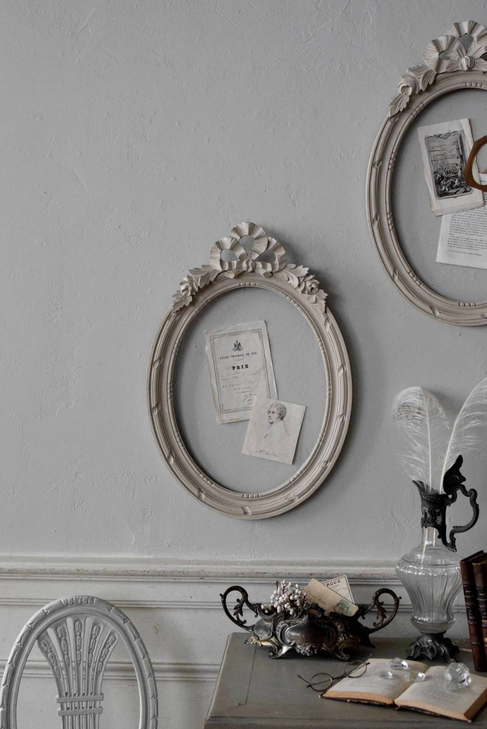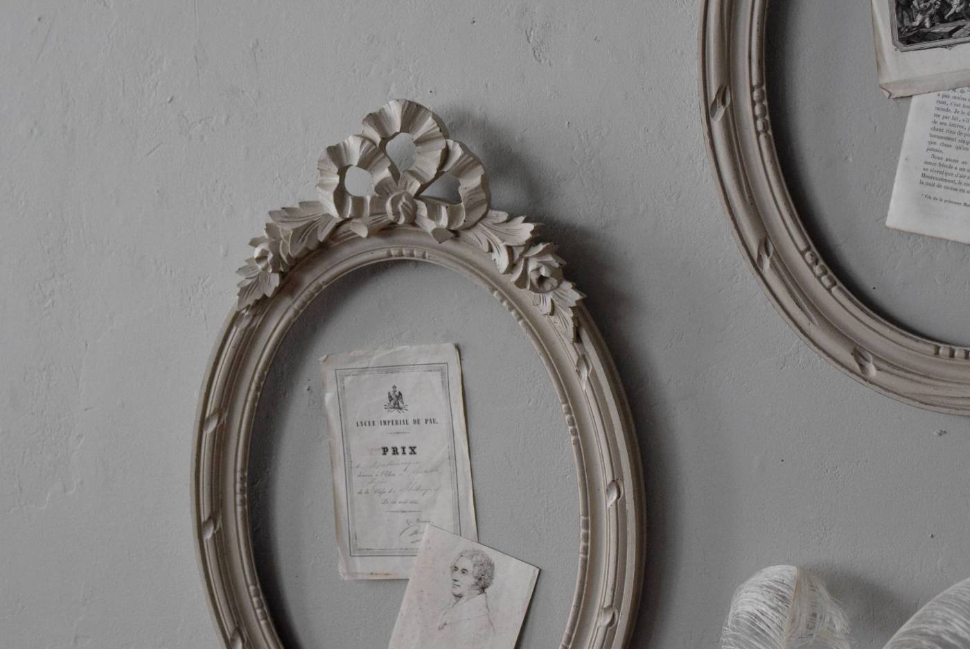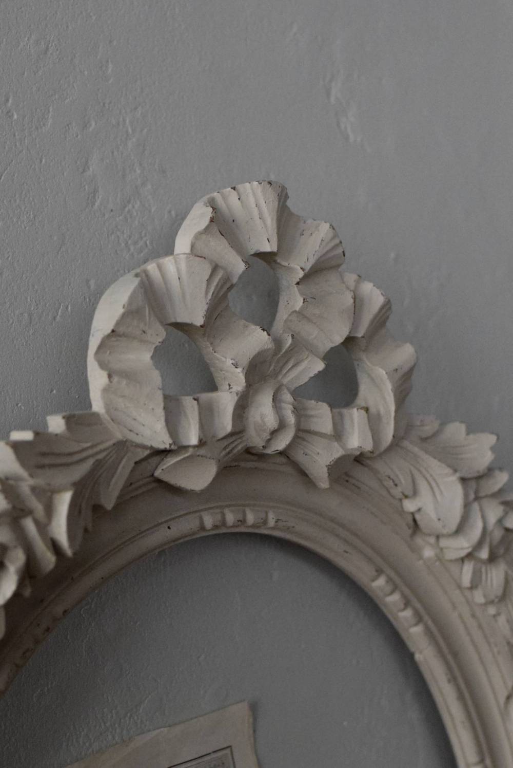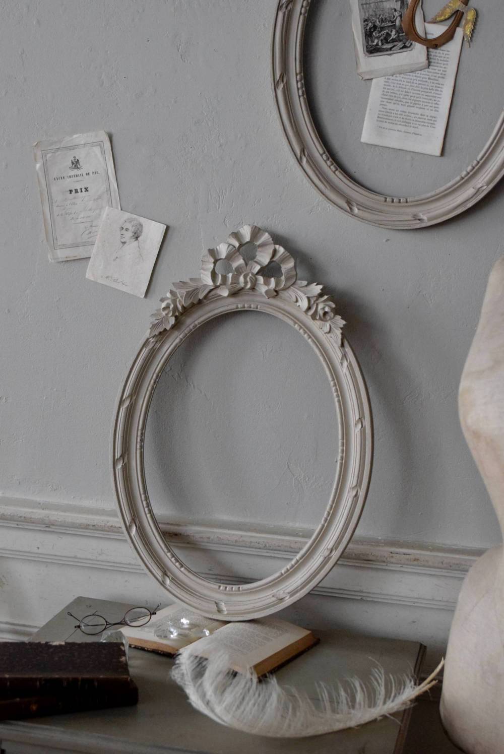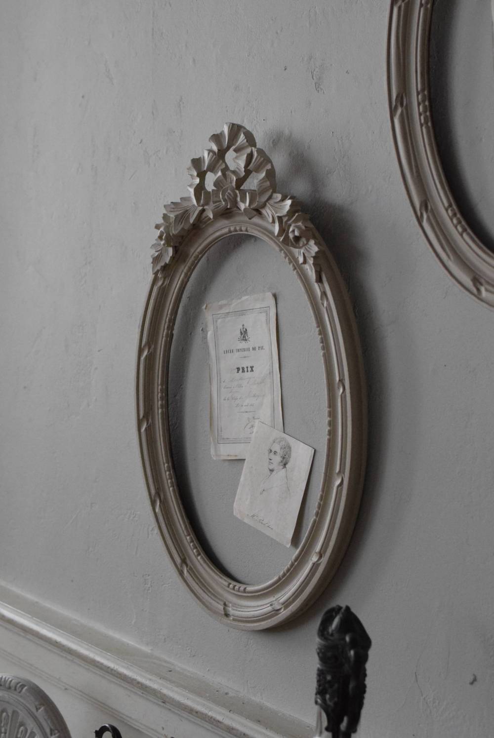 フランスのオーバルフレーム。 トップで圧倒的な存在感を放つ、大きなリボンのモチーフが目を引くアイテム。リボンに寄り添う草花のモチーフは活力に溢れながらもエレガントな姿で、オーバルのフレームにも、程よい厚みと立体感があり、壁に飾ると奥行き感をもたらしてくれます。 背板やガラスがないのでアレンジもしやすく、グレージュのような優しいカラーで、そっと空間に馴染む美しさです。よく似たタイプのフレームがもう一点ありますが(オーバルフレーム.リボン30)細かなデザインやサイズ感が少し異なります。 W 約38.3cm D 約4cm+金具 約1.5cm H 約55.5cm 内寸 W約28.5cm×H約38.5cm 重量 約0.6kg