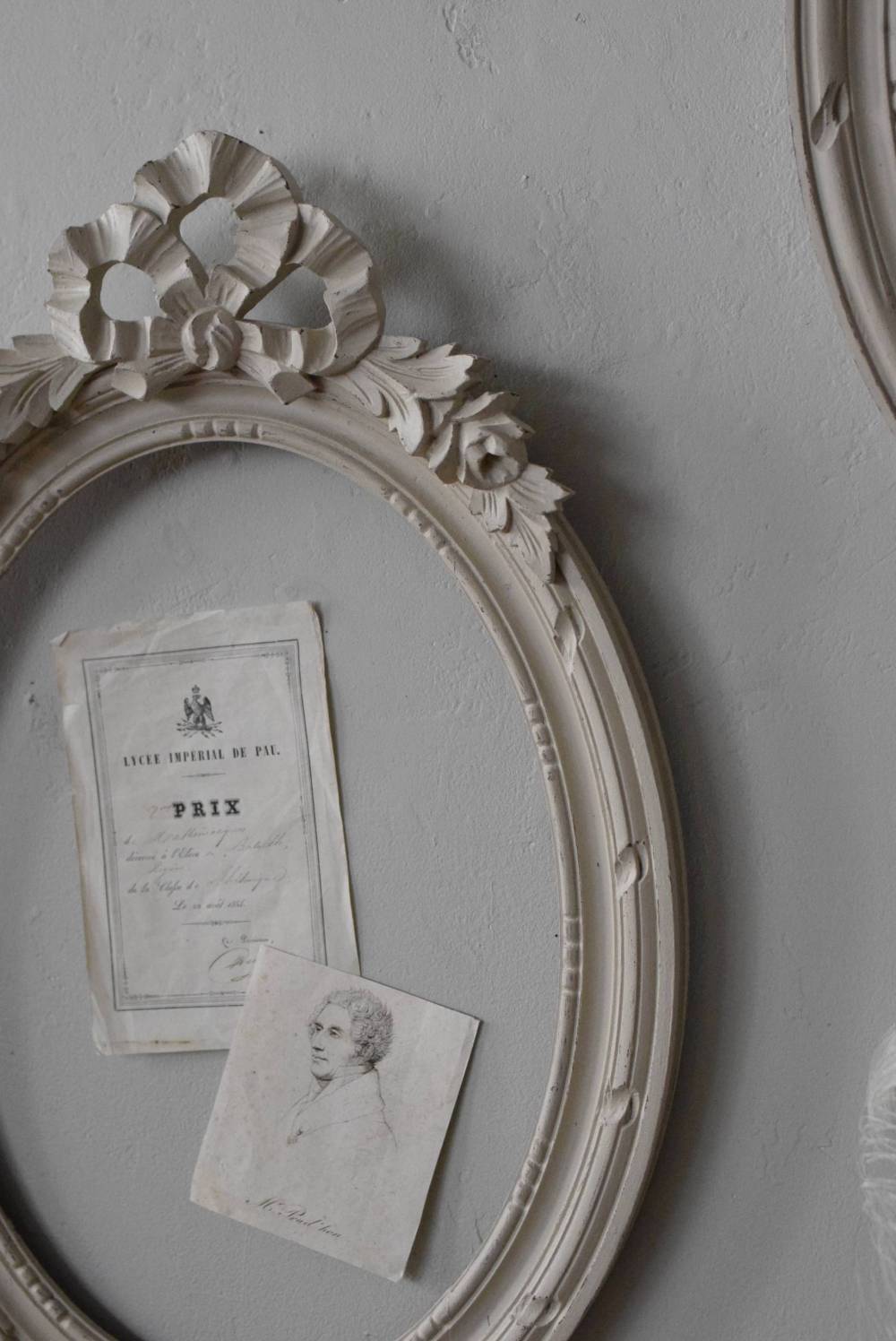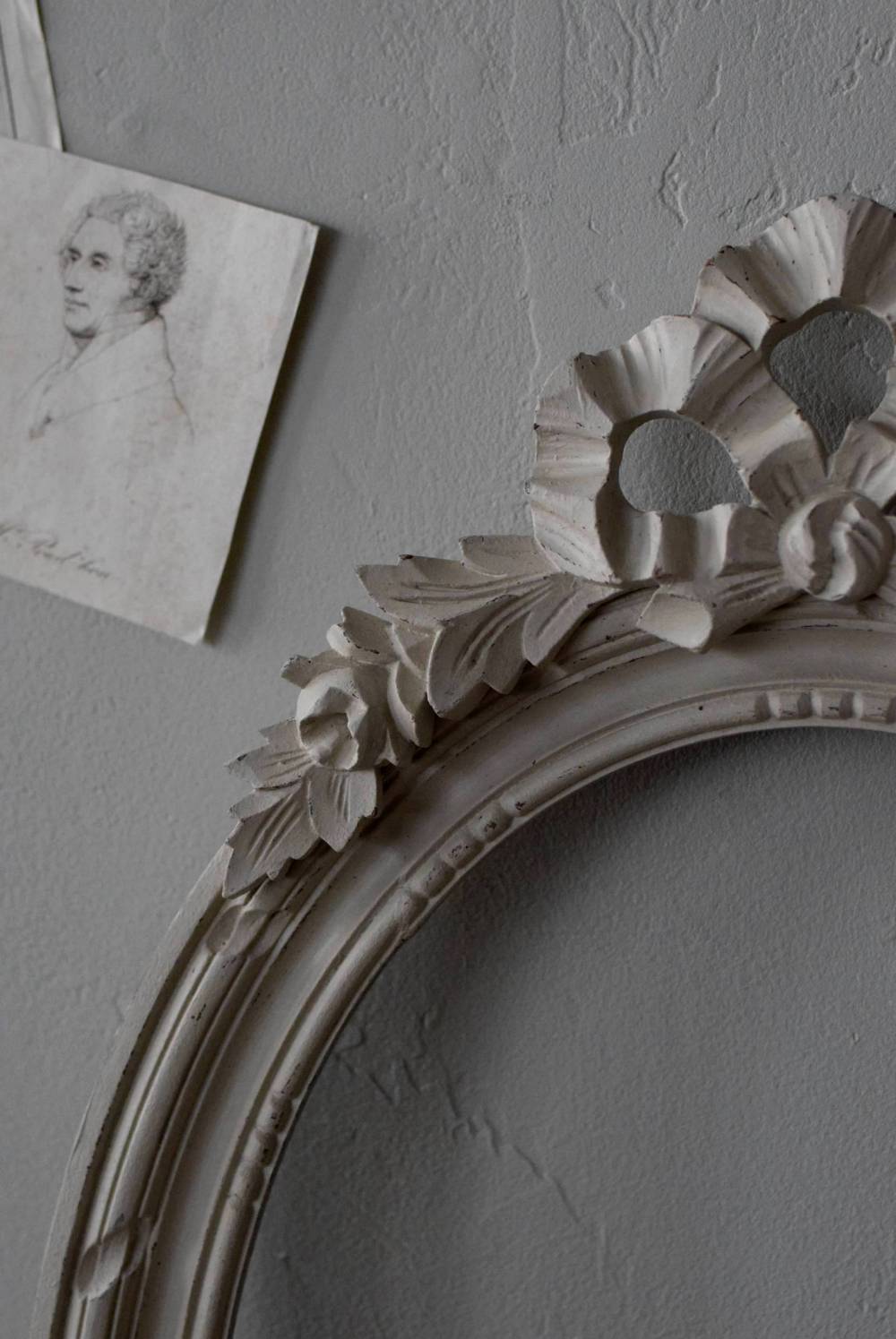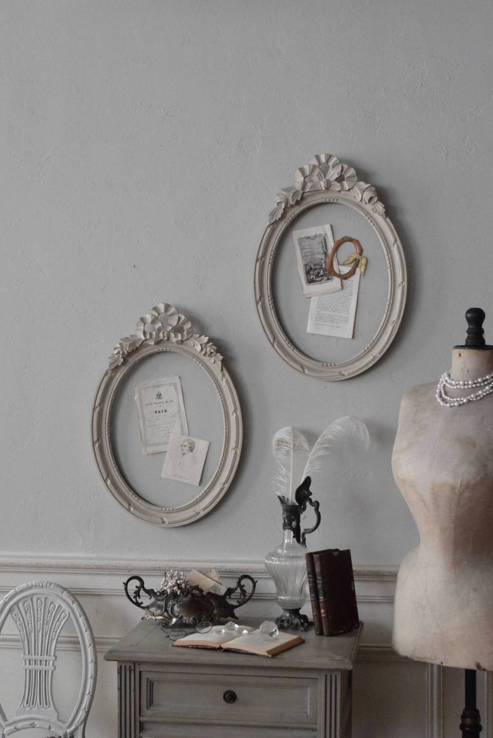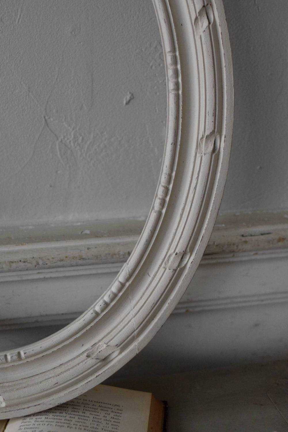 フランスのオーバルフレーム。 トップで圧倒的な存在感を放つ、大きなリボンのモチーフが目を引くアイテム。リボンに寄り添う草花のモチーフは活力に溢れながらもエレガントな姿で、オーバルのフレームにも、程よい厚みと立体感があり、壁に飾ると奥行き感をもたらしてくれます。 背板やガラスがないのでアレンジもしやすく、グレージュのような優しいカラーで、そっと空間に馴染む美しさです。よく似たタイプのフレームがもう一点ありますが(オーバルフレーム.リボン30)細かなデザインやサイズ感が少し異なります。 W 約38.3cm D 約4cm+金具 約1.5cm H 約55.5cm 内寸 W約28.5cm×H約38.5cm 重量 約0.6kg