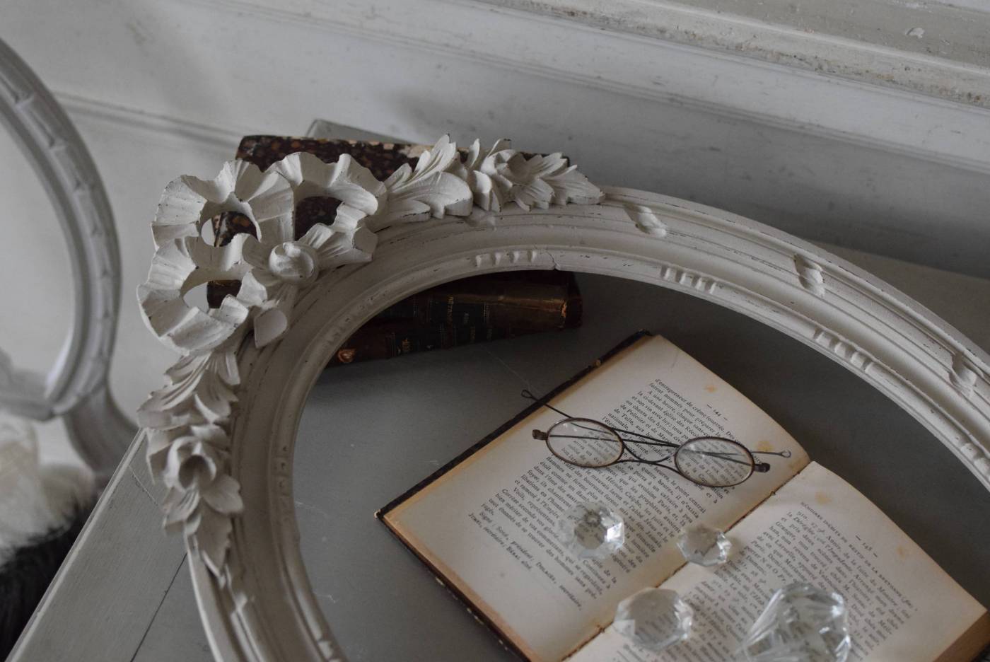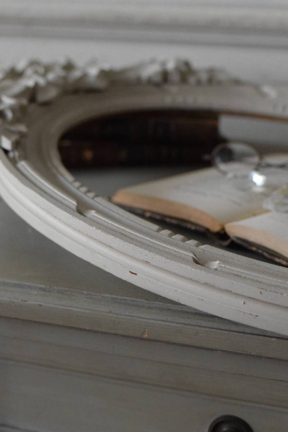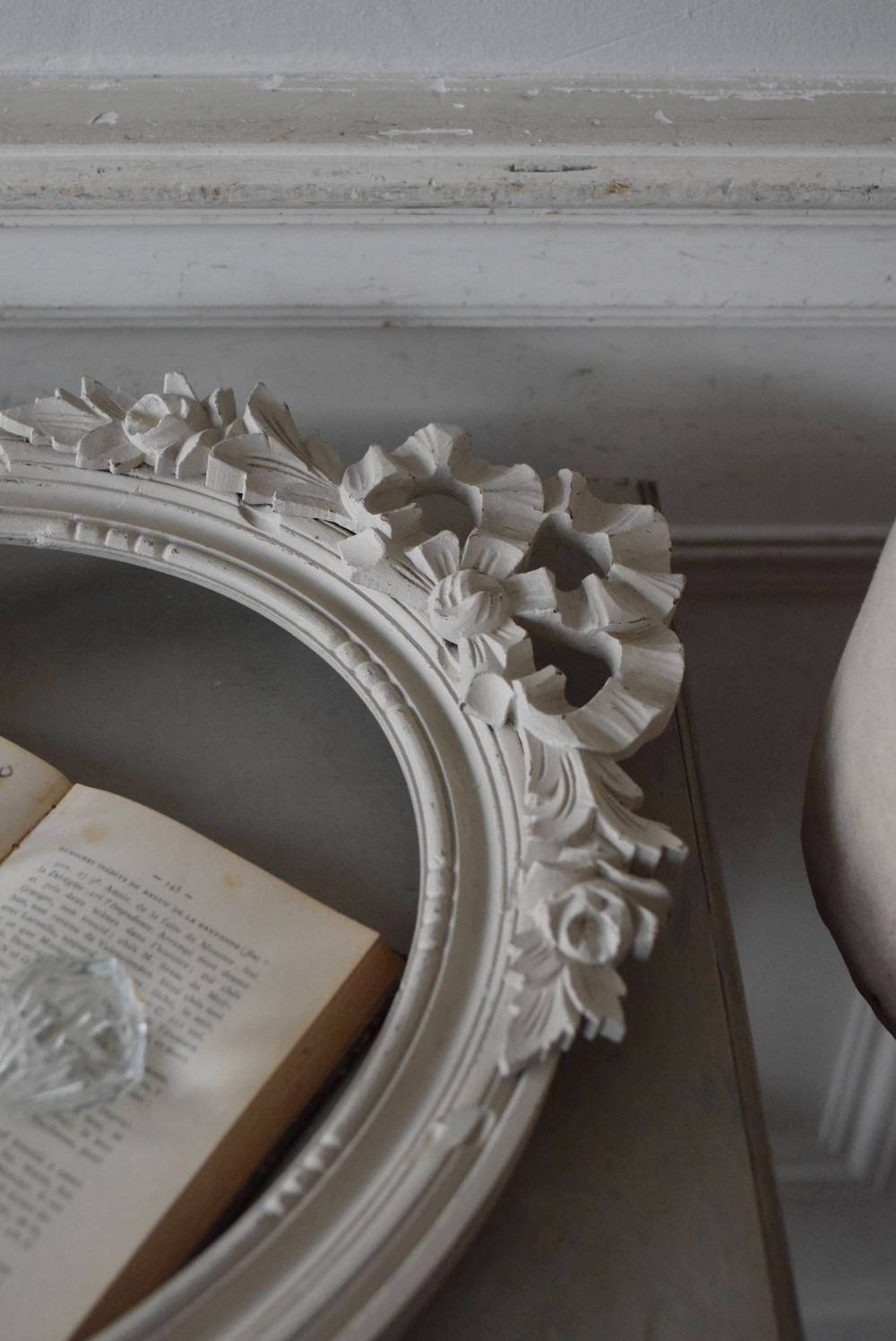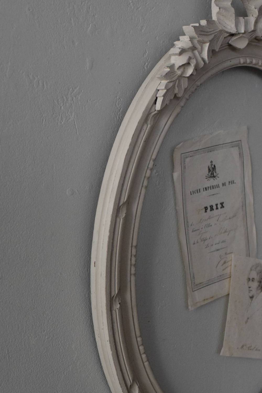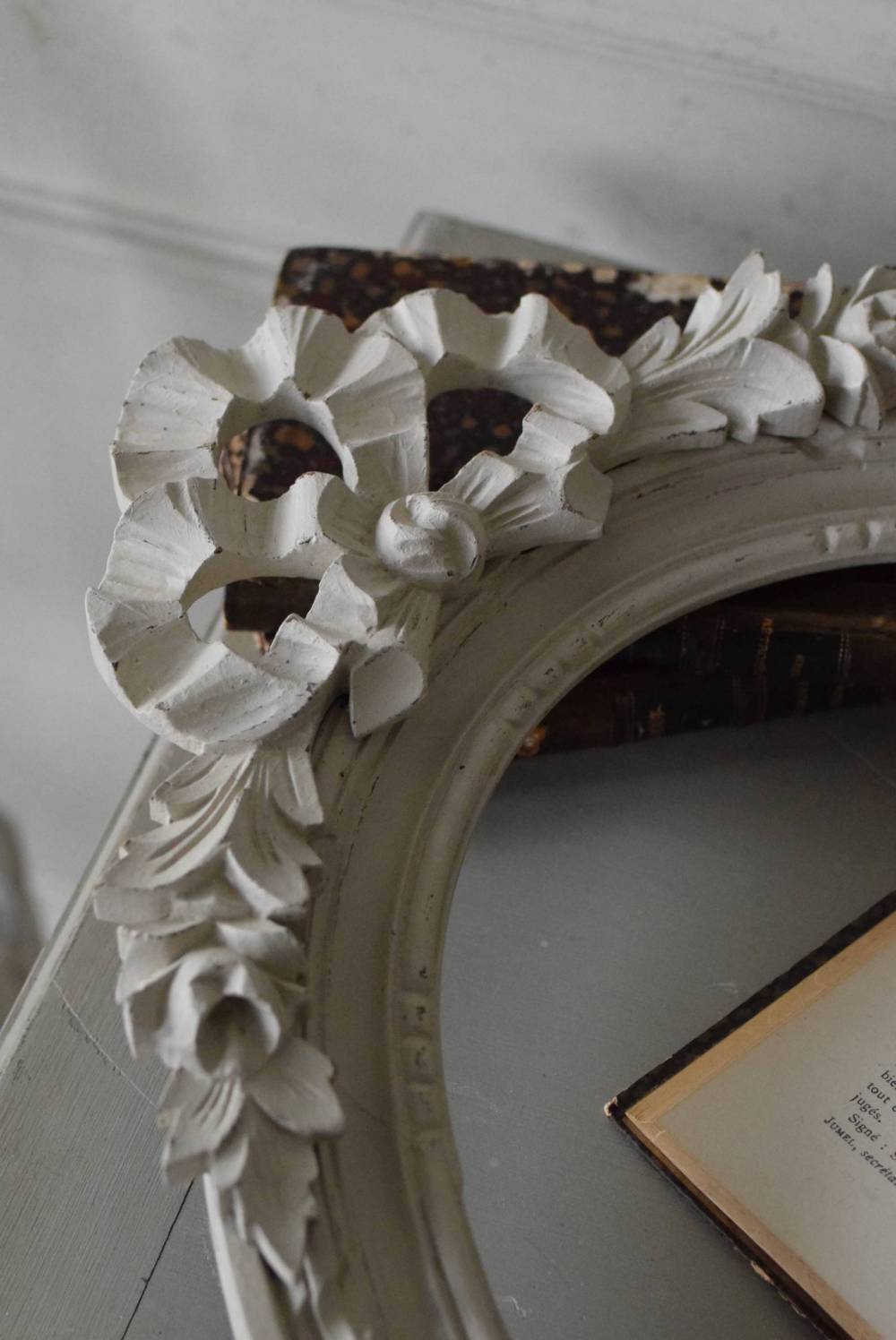 フランスのオーバルフレーム。 トップで圧倒的な存在感を放つ、大きなリボンのモチーフが目を引くアイテム。リボンに寄り添う草花のモチーフは活力に溢れながらもエレガントな姿で、オーバルのフレームにも、程よい厚みと立体感があり、壁に飾ると奥行き感をもたらしてくれます。 背板やガラスがないのでアレンジもしやすく、グレージュのような優しいカラーで、そっと空間に馴染む美しさです。よく似たタイプのフレームがもう一点ありますが(オーバルフレーム.リボン30)細かなデザインやサイズ感が少し異なります。 W 約38.3cm D 約4cm+金具 約1.5cm H 約55.5cm 内寸 W約28.5cm×H約38.5cm 重量 約0.6kg