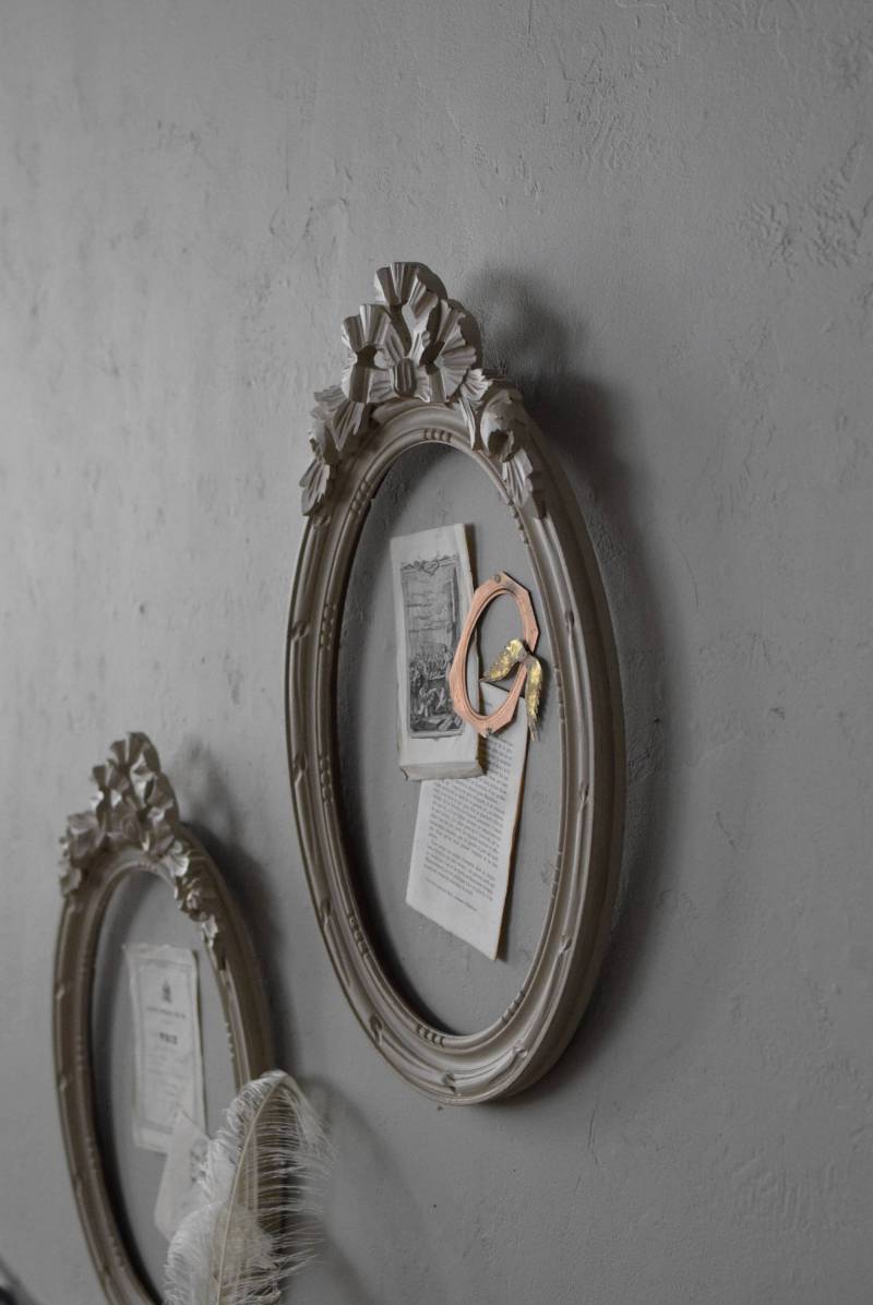 背板やガラスがないのでアレンジもしやすく、グレージュのような優しいカラーで、そっと空間に馴染む美しさです。よく似たタイプのフレームがもう一点ありますが(オーバルフレーム.リボン29)細かなデザインやサイズ感が少し異なります。 W 約37.5cm
