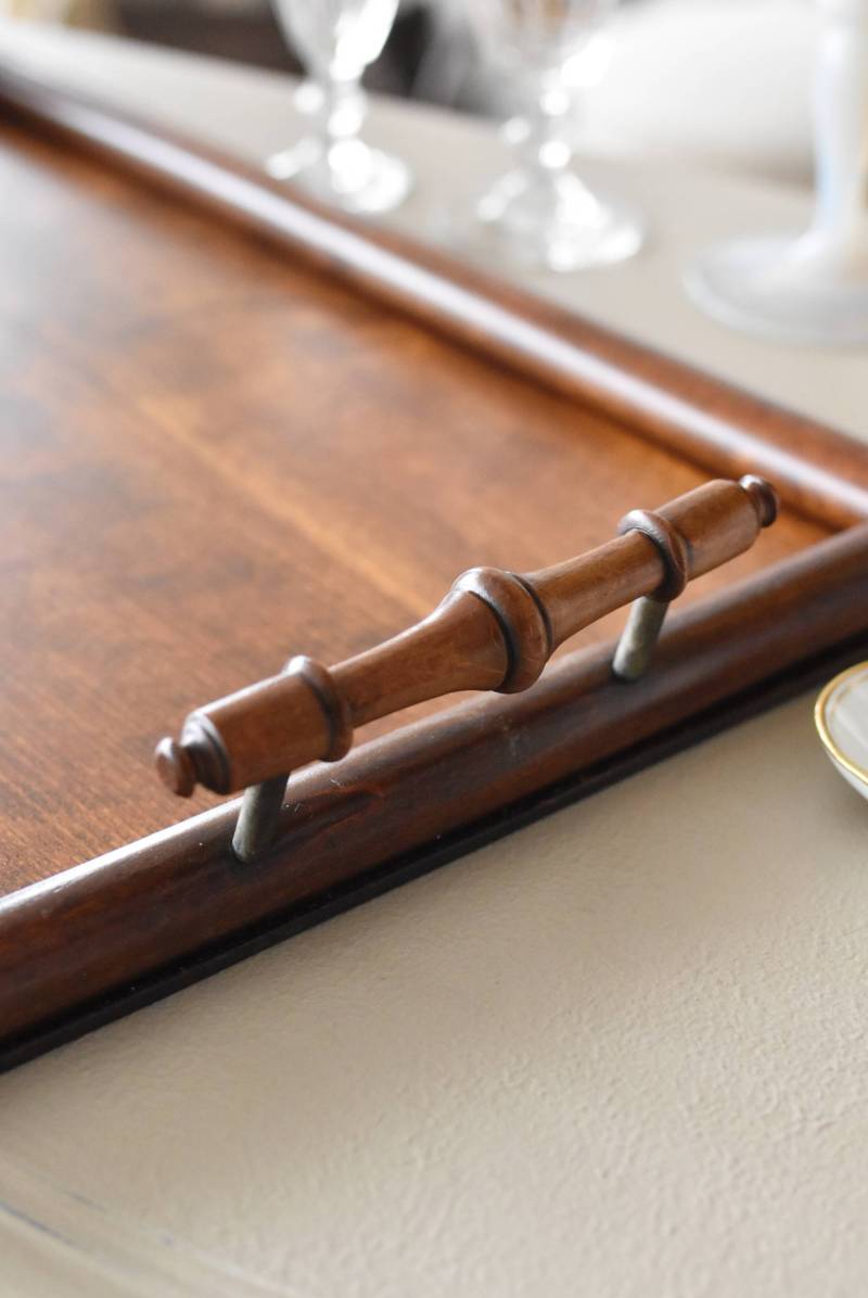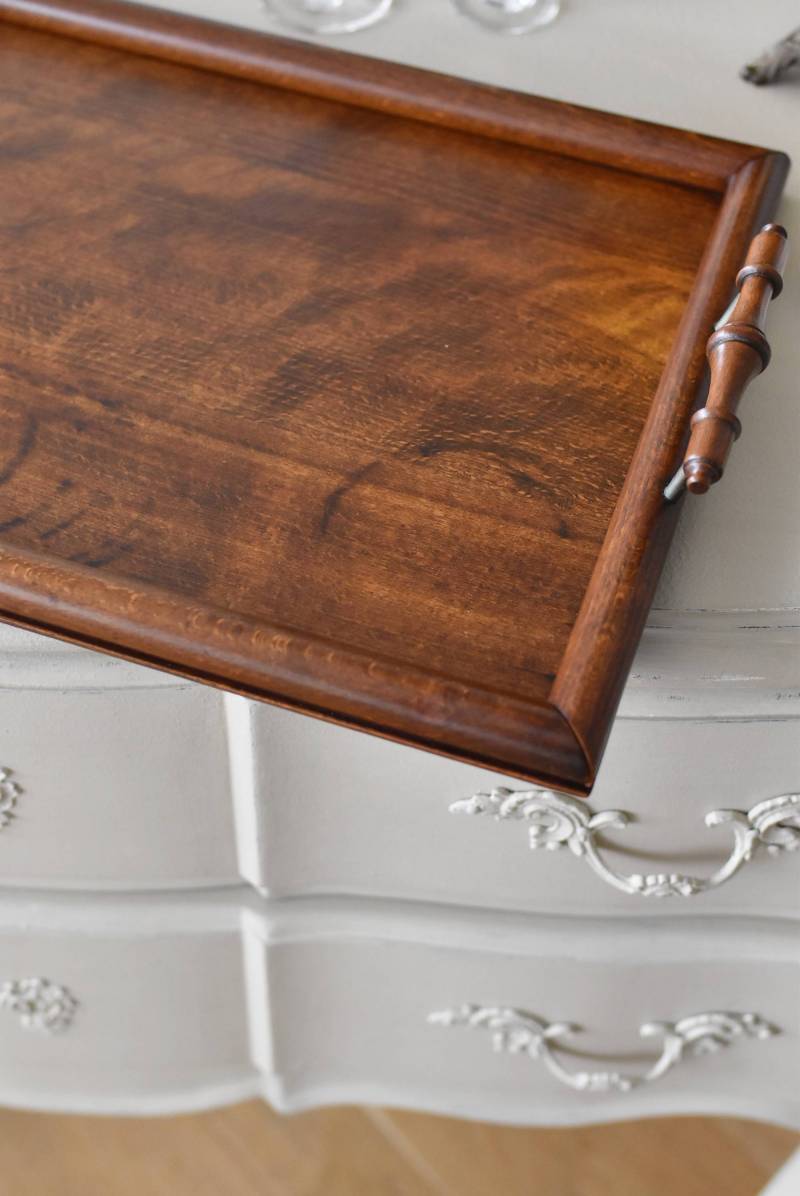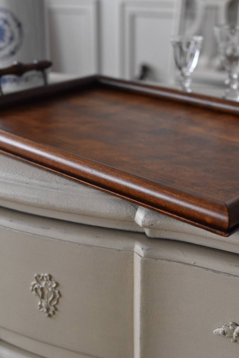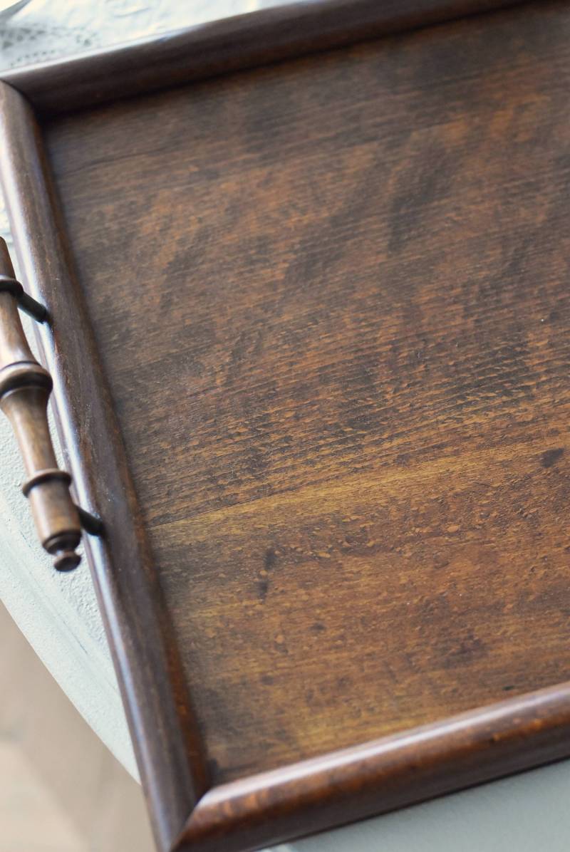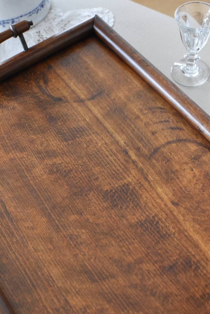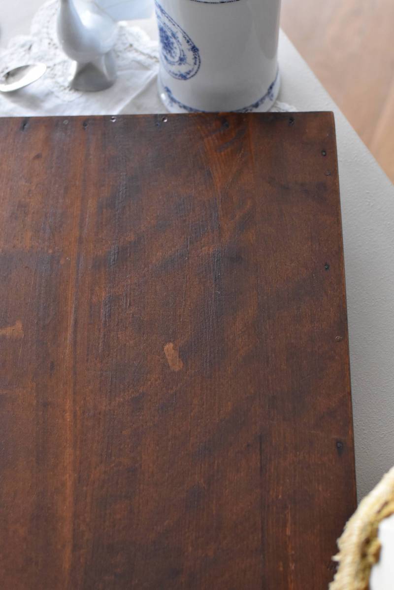 オーク材が使用されたフランスの木製トレイ。 深みのある色合いとはっきりとした力強い木目、四角いシルエットに縁周りのぷっくりとした丸みのある形状が合わさり、ほっこりとするような優しげな印象を受けます。両サイドの持ち手部分も節のあるこだわり抜かれたデザインで、落ち着いた印象ながらも卓上をグッと引き締めてくれそうです。 輪ジミなどが見受けられますが一度剥離をして再塗装を行なっており、滑らかな質感になっています。 W 約45cm D 約29.5cm H 約6cm 内寸 W約38cm×D約25cm