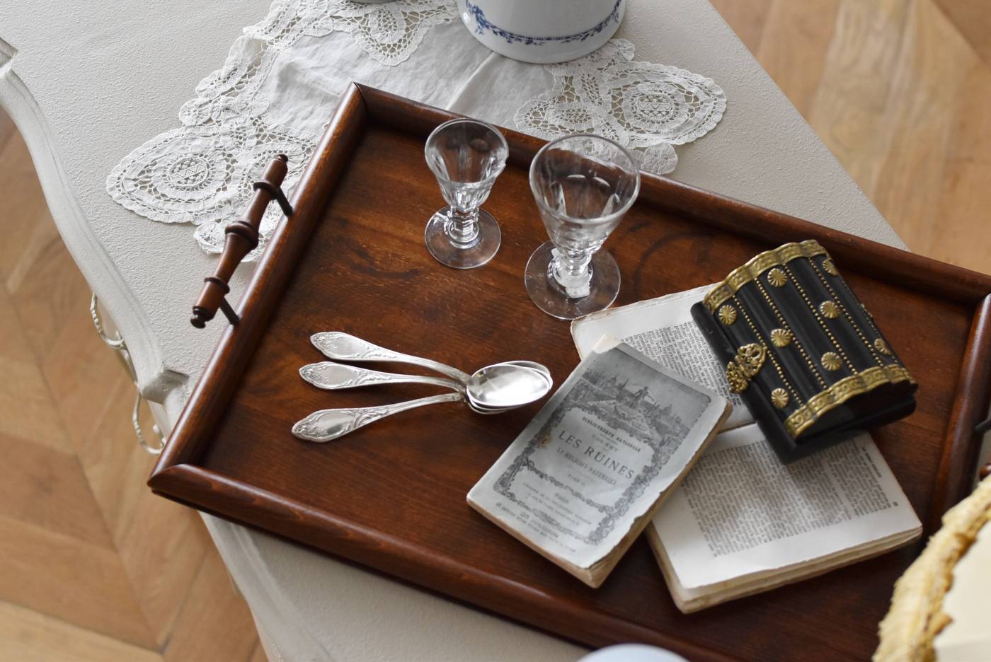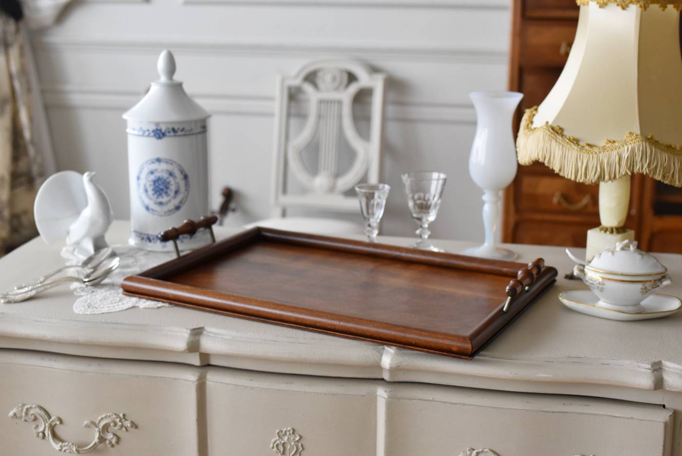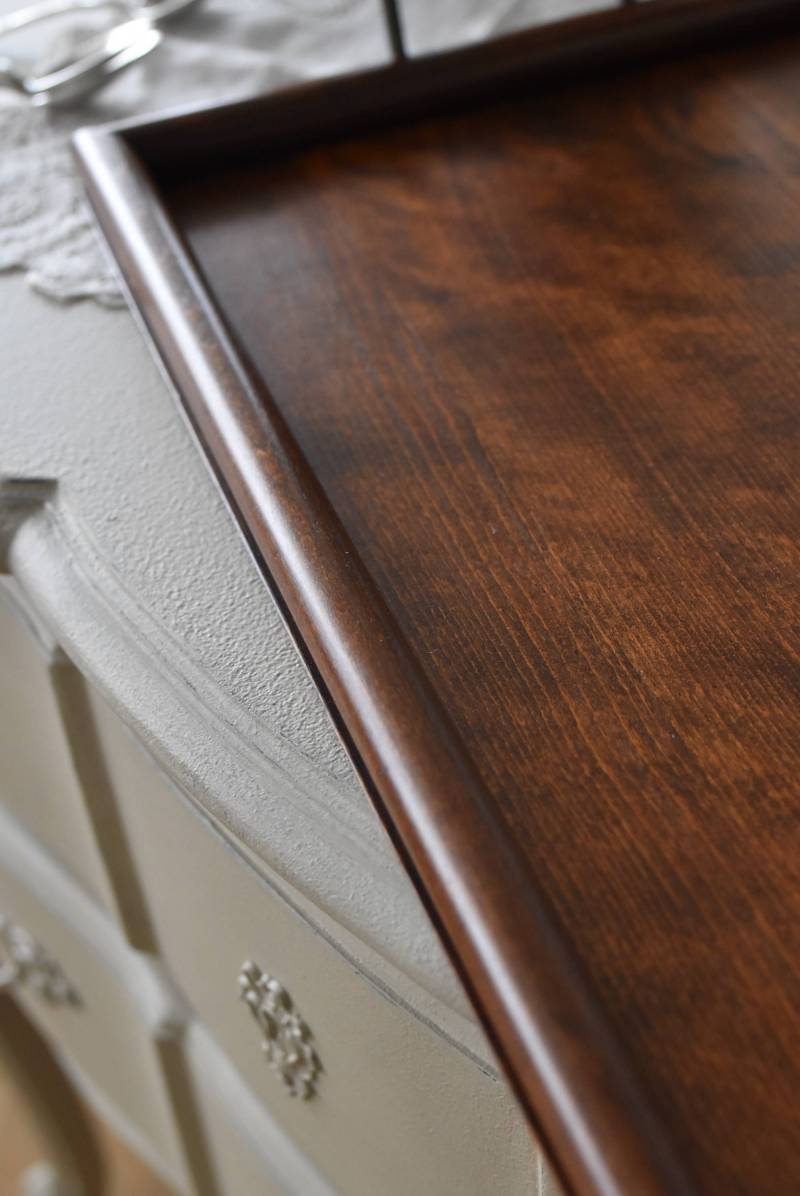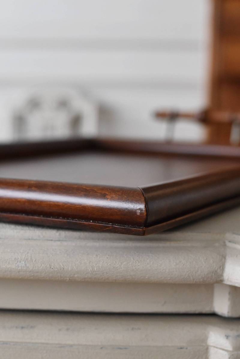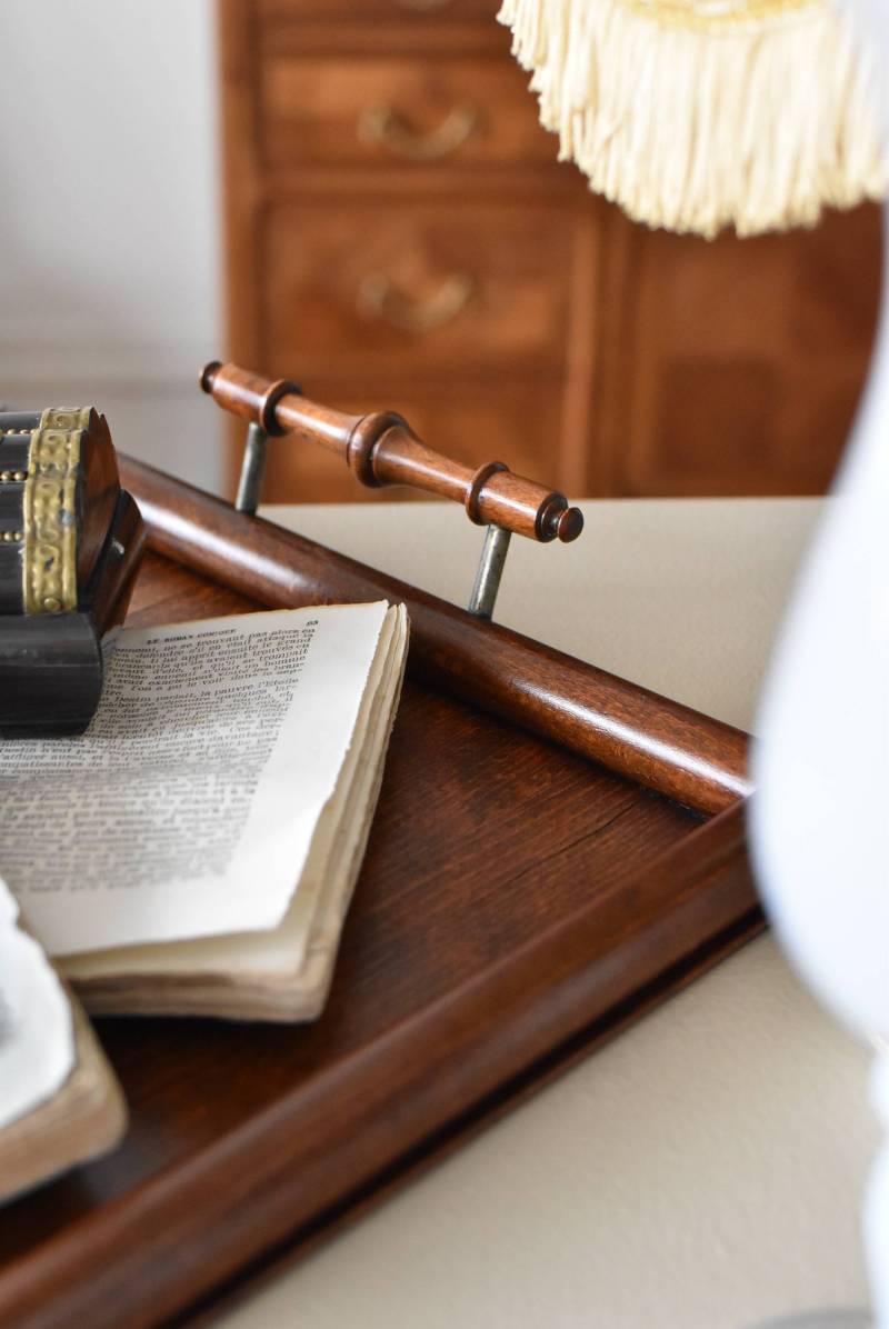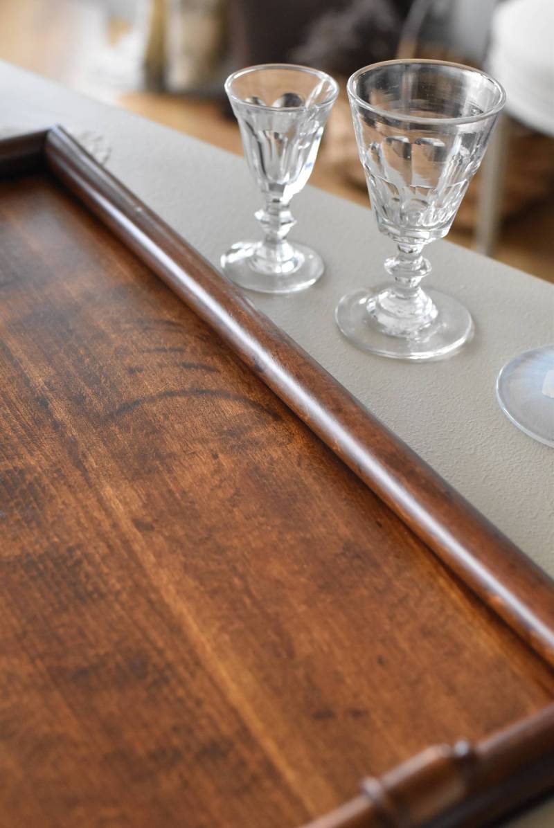 オーク材が使用されたフランスの木製トレイ。 深みのある色合いとはっきりとした力強い木目、四角いシルエットに縁周りのぷっくりとした丸みのある形状が合わさり、ほっこりとするような優しげな印象を受けます。両サイドの持ち手部分も節のあるこだわり抜かれたデザインで、落ち着いた印象ながらも卓上をグッと引き締めてくれそうです。 輪ジミなどが見受けられますが一度剥離をして再塗装を行なっており、滑らかな質感になっています。 W 約45cm D 約29.5cm H 約6cm 内寸 W約38cm×D約25cm