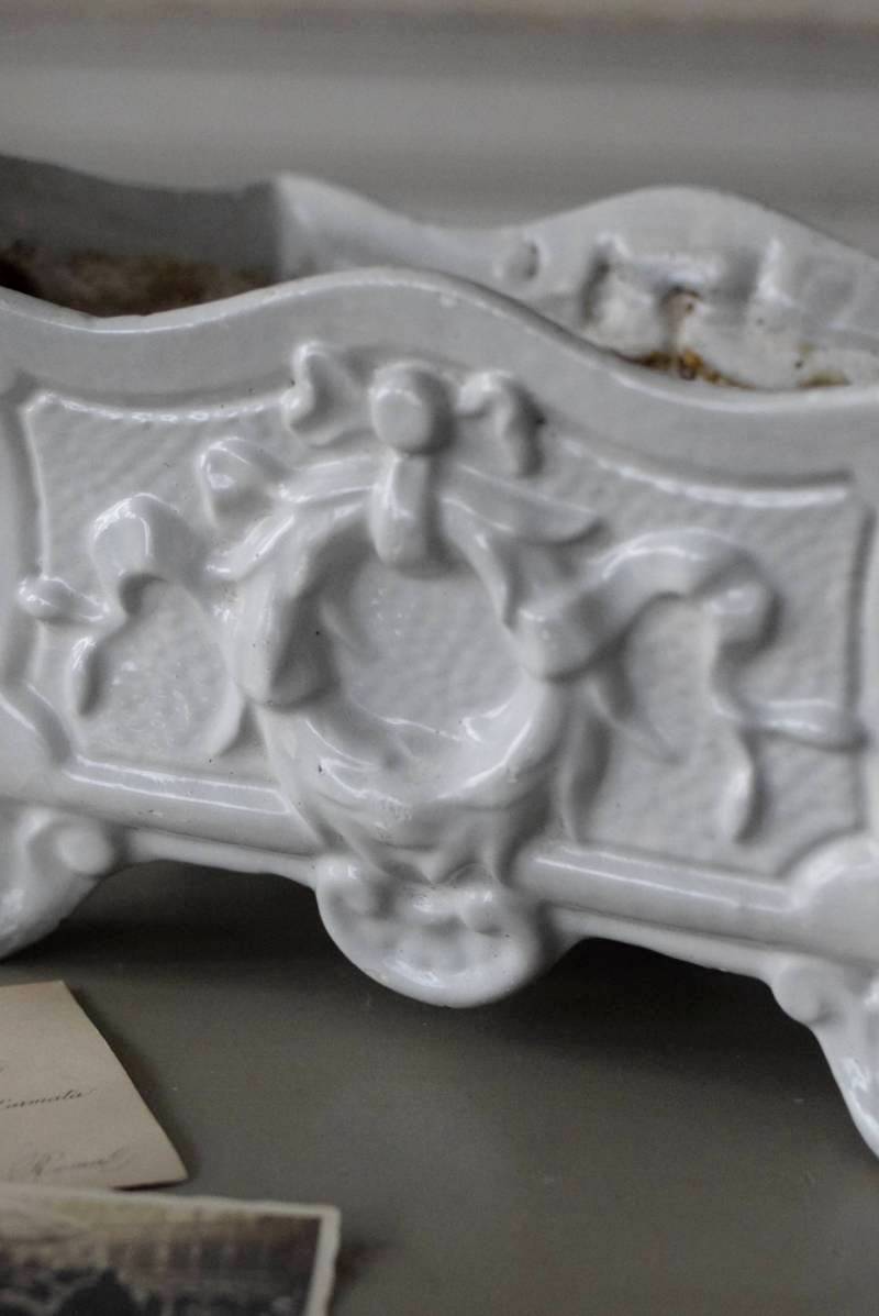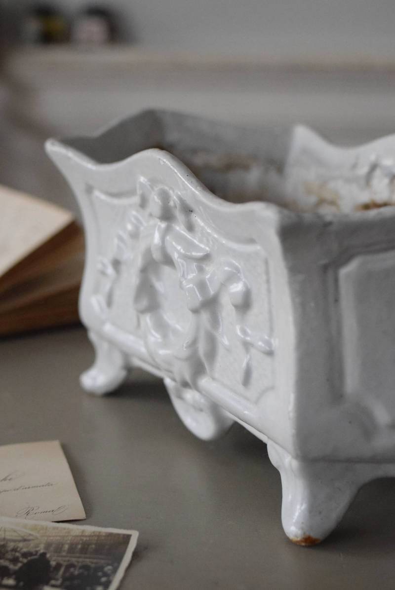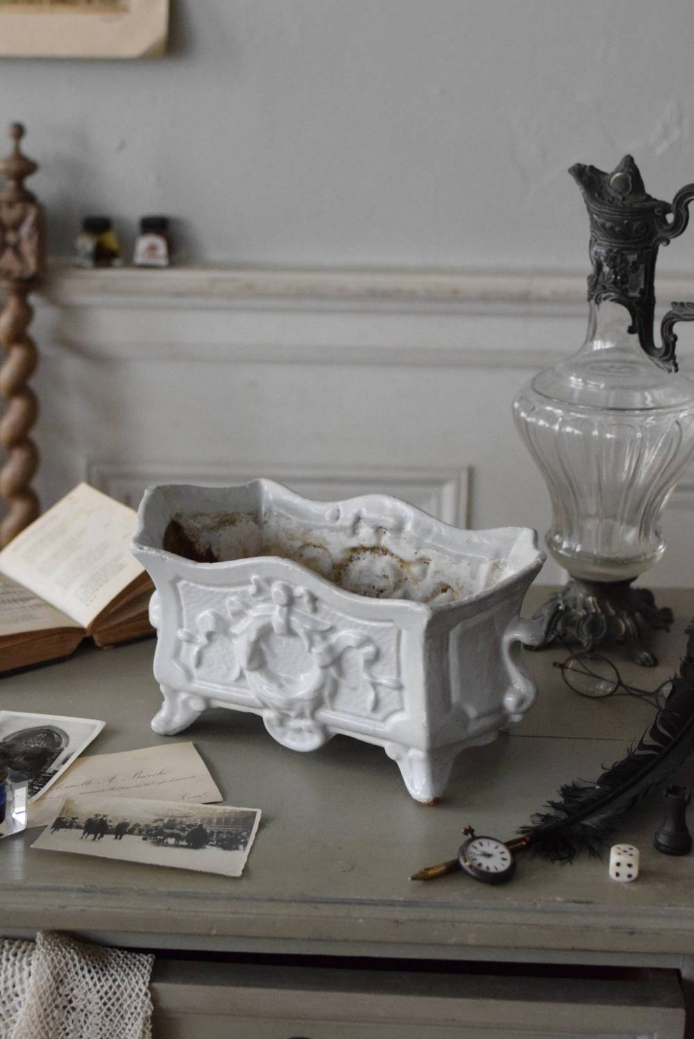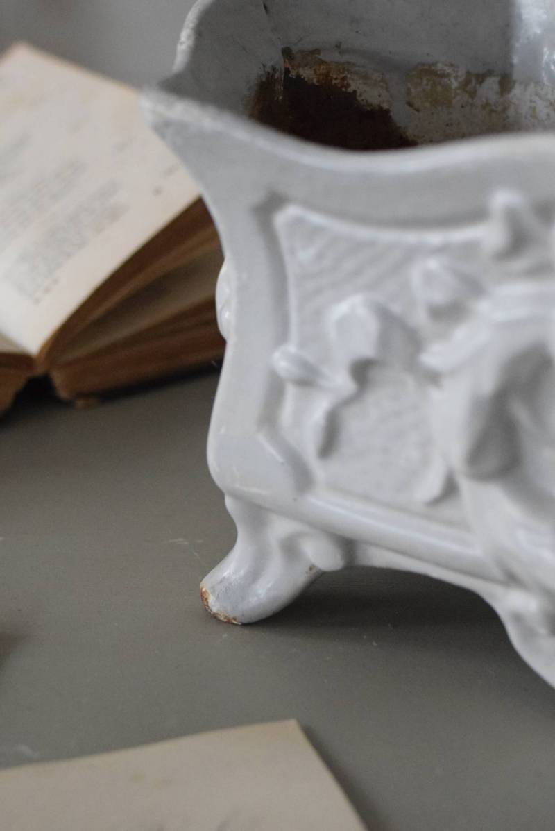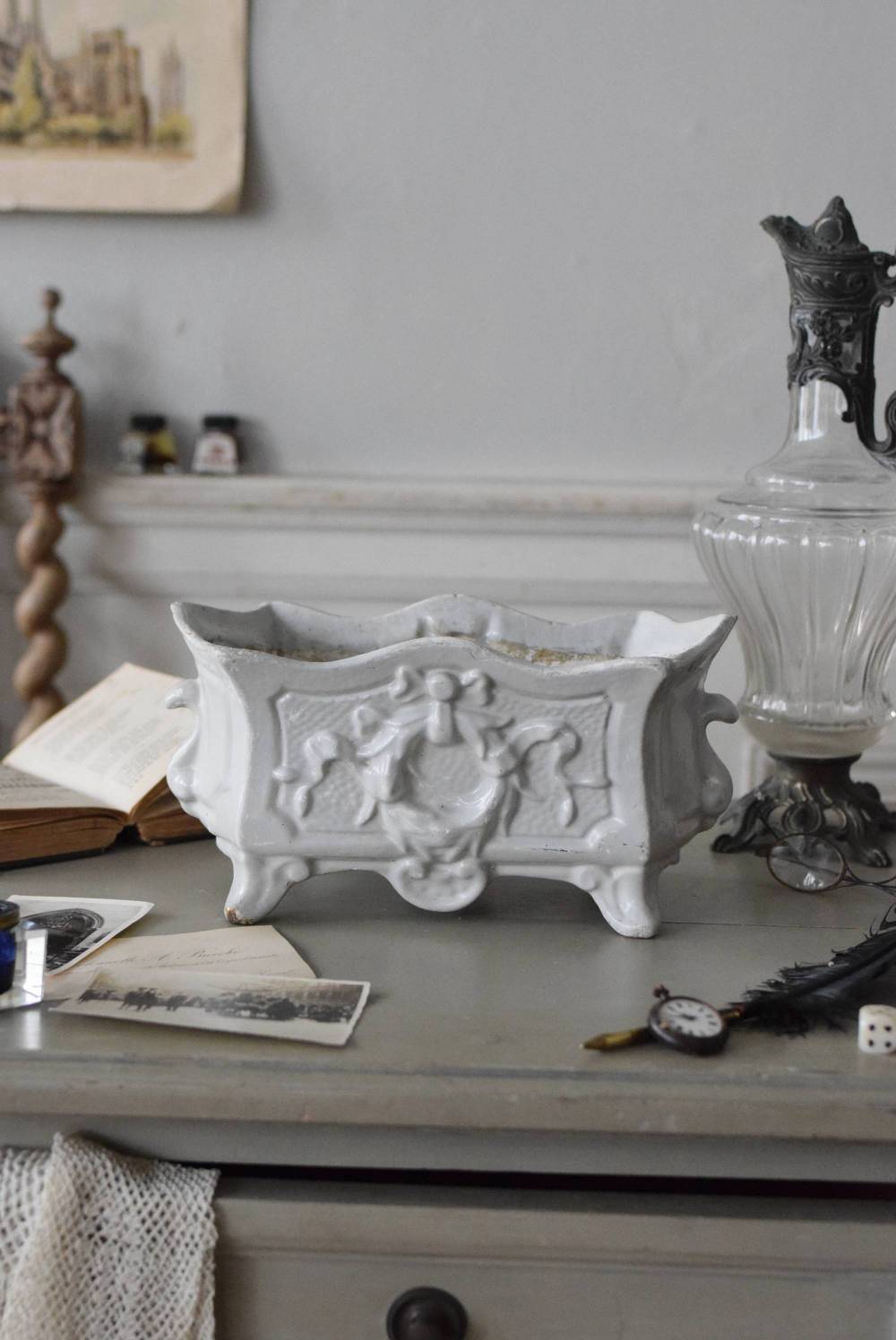 フランスのジャルディニエール。 アイアンで出来た重厚な姿ながら、厚めのホワイトペイントが施され、まるで陶器や琺瑯のようにも感じられる艶やかで上品な質感です。立体的なリボンやリースのようなモチーフもとても印象的で、どの角度から見ても見応えのある美しいデザイン。 実際にプランターとして使われてきたもので、内部には錆が多く見られます。アイアン製ですのでしっかりとした重さと安定感があり、屋内外問わずアレンジをお楽しみいただけます。 W 約25cm D 約14cm H 約13cm 内寸 約21×10.5×10cm