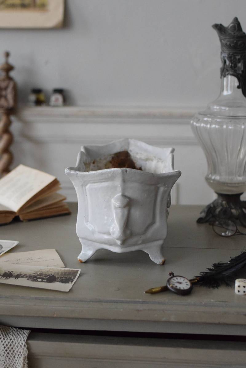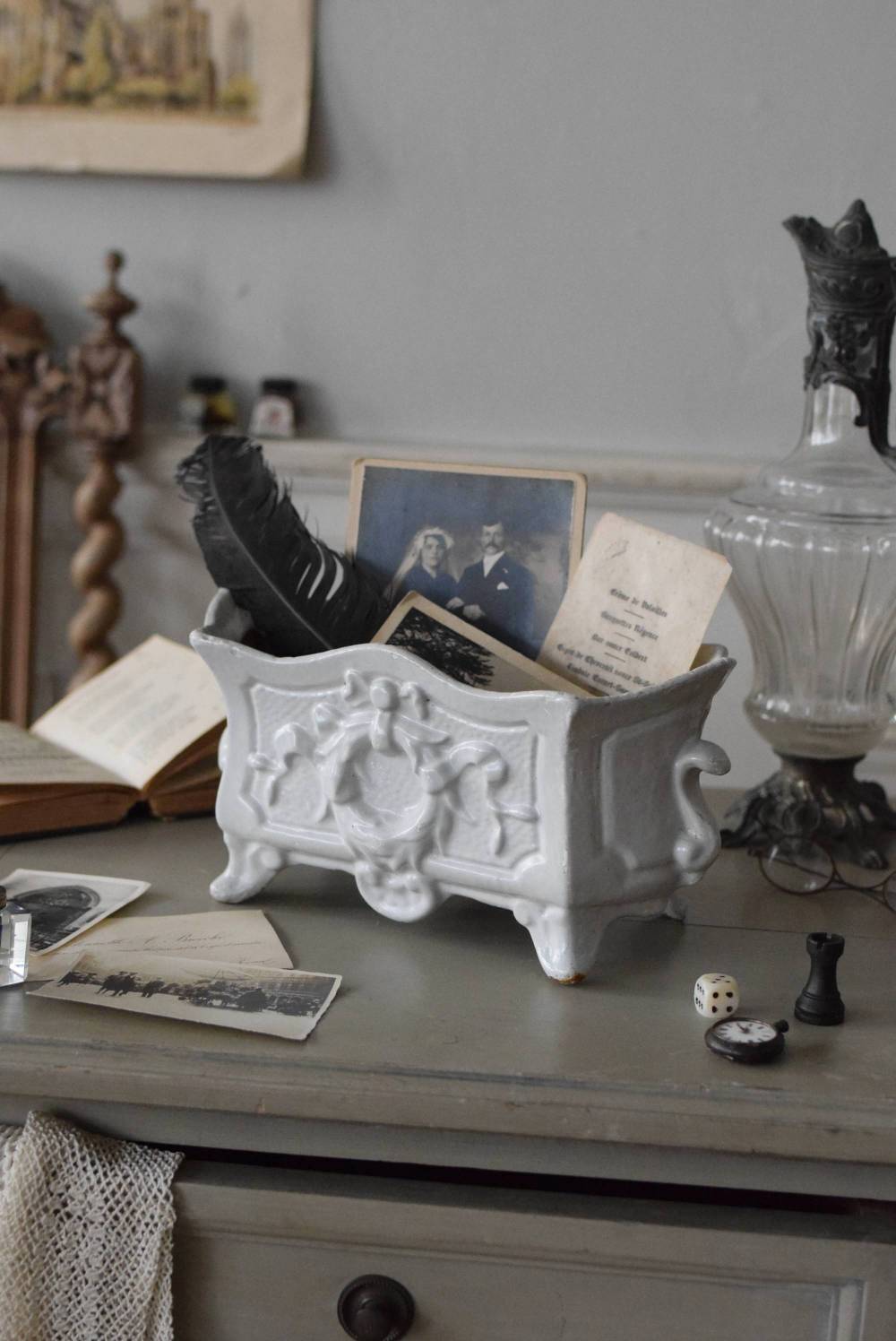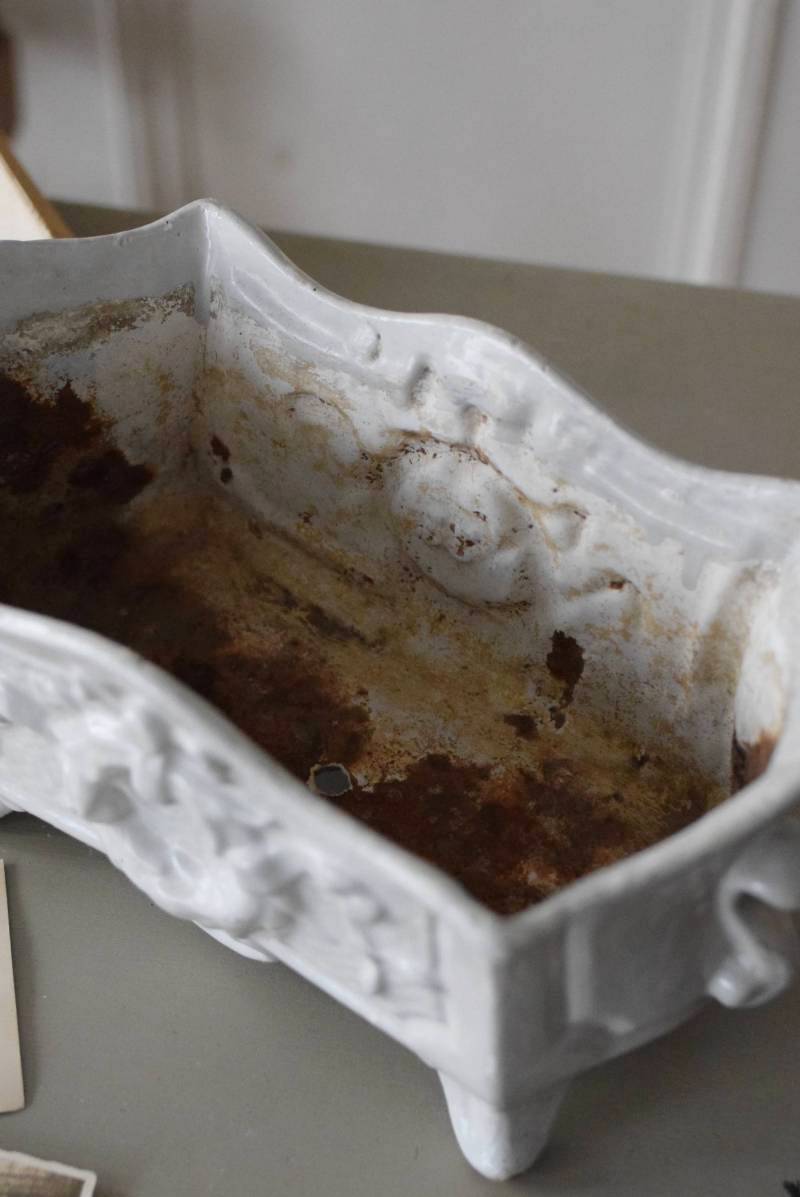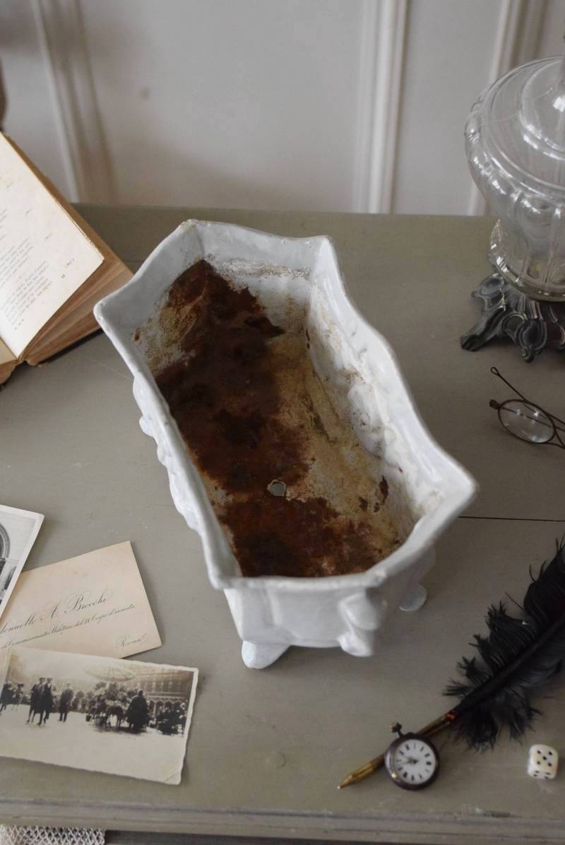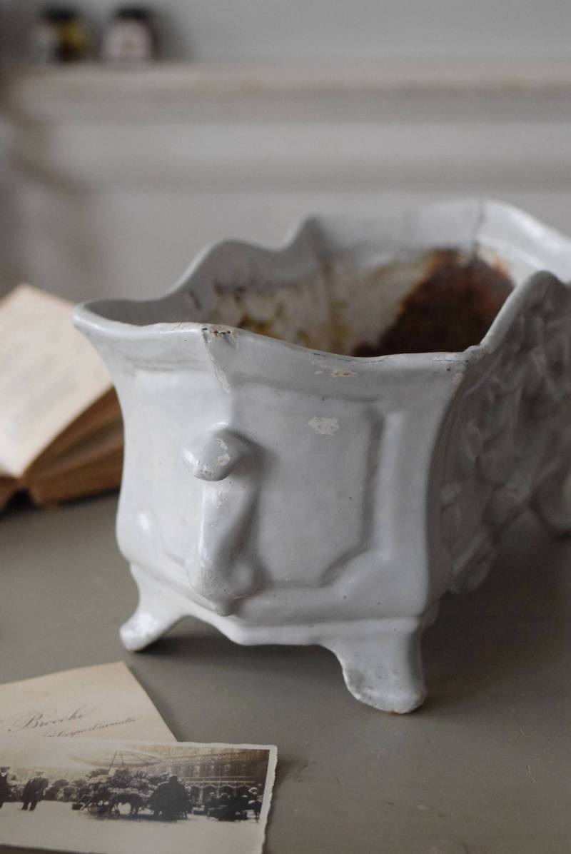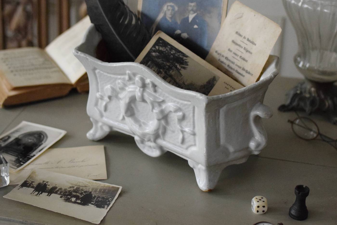 フランスのジャルディニエール。 アイアンで出来た重厚な姿ながら、厚めのホワイトペイントが施され、まるで陶器や琺瑯のようにも感じられる艶やかで上品な質感です。立体的なリボンやリースのようなモチーフもとても印象的で、どの角度から見ても見応えのある美しいデザイン。 実際にプランターとして使われてきたもので、内部には錆が多く見られます。アイアン製ですのでしっかりとした重さと安定感があり、屋内外問わずアレンジをお楽しみいただけます。 W 約25cm D 約14cm H 約13cm 内寸 約21×10.5×10cm