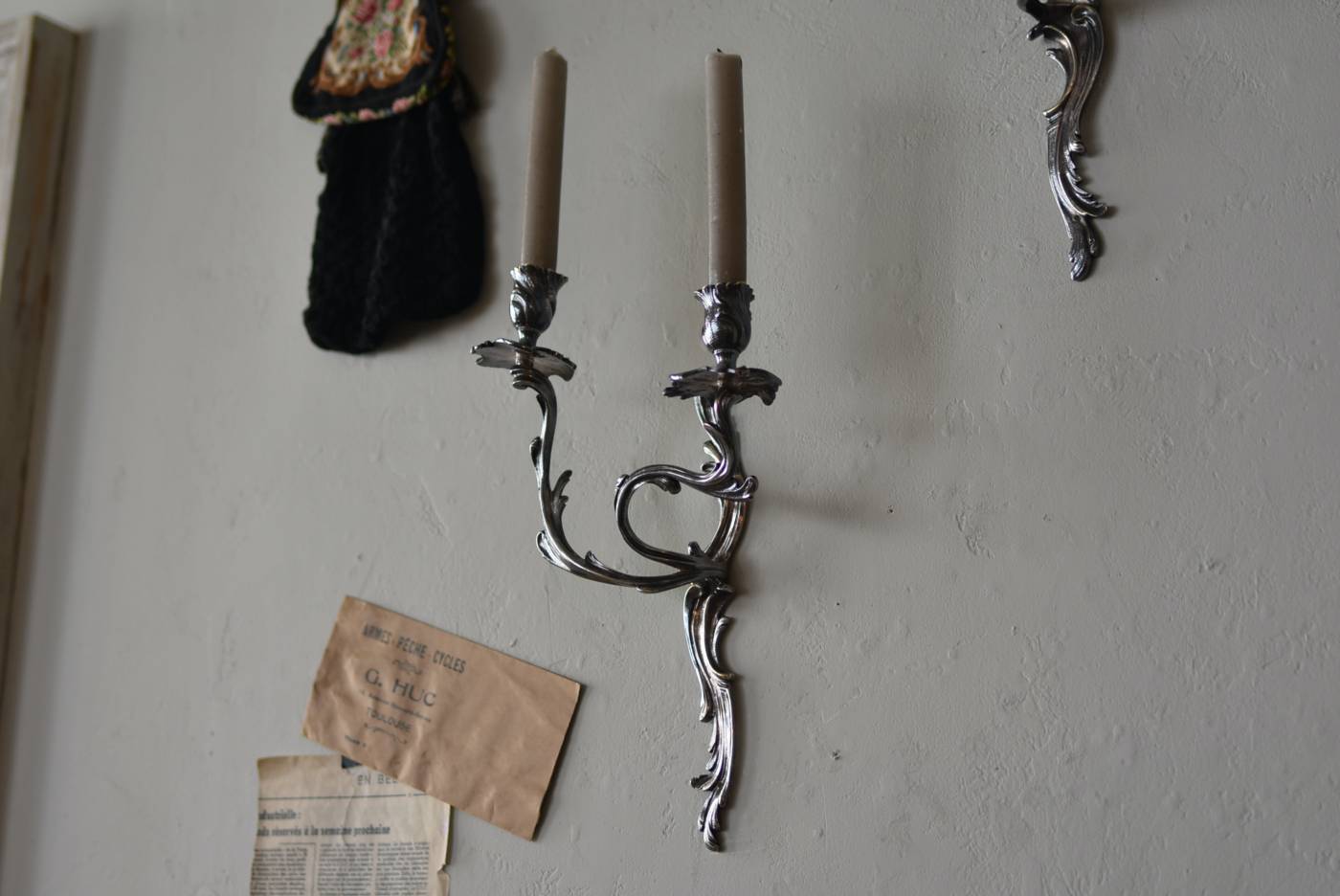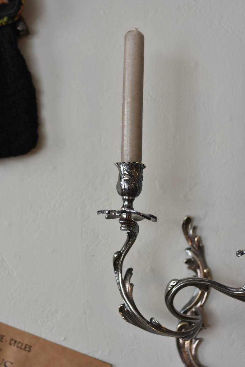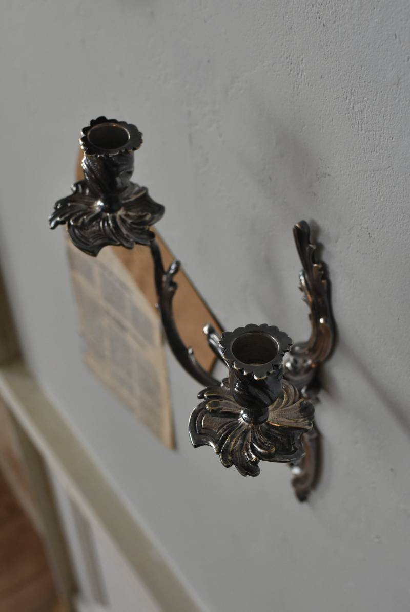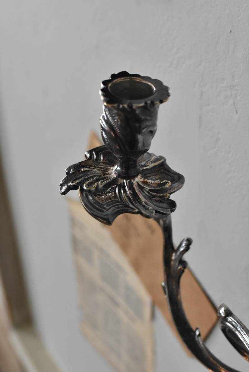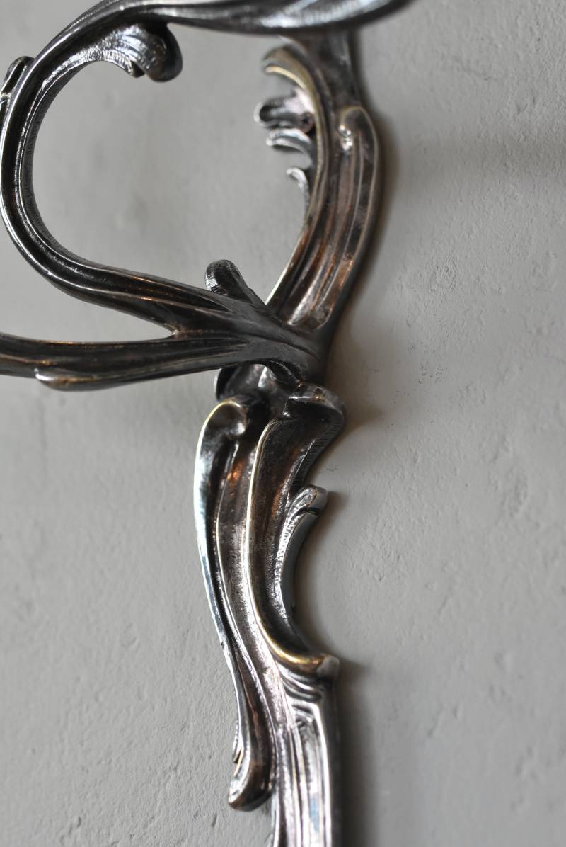 フランスの2灯キャンドルスタンド。 植物を模した繊細な曲線が織りなす優雅なシルエットが目を惹く魅力的な佇まい。凛とした涼やかさを漂わせてくれるシルバーカラーで、アカンサスの葉をモチーフとした表面装飾とアシンメトリーな作りが特徴的なロココ様式のデザインとなっています。ボディには固定用の穴が2箇所開けられており、壁に固定してクラシカルなウォールディスプレイを楽しめる逸品に。 左右が反転したようなデザインのキャンドルスタンドとシンメトリーに配置するのも雰囲気が出ておすすめです。 W 約22cm D 約13cm H 約34.5cm 口径 約2cm 重量 約0.8kg