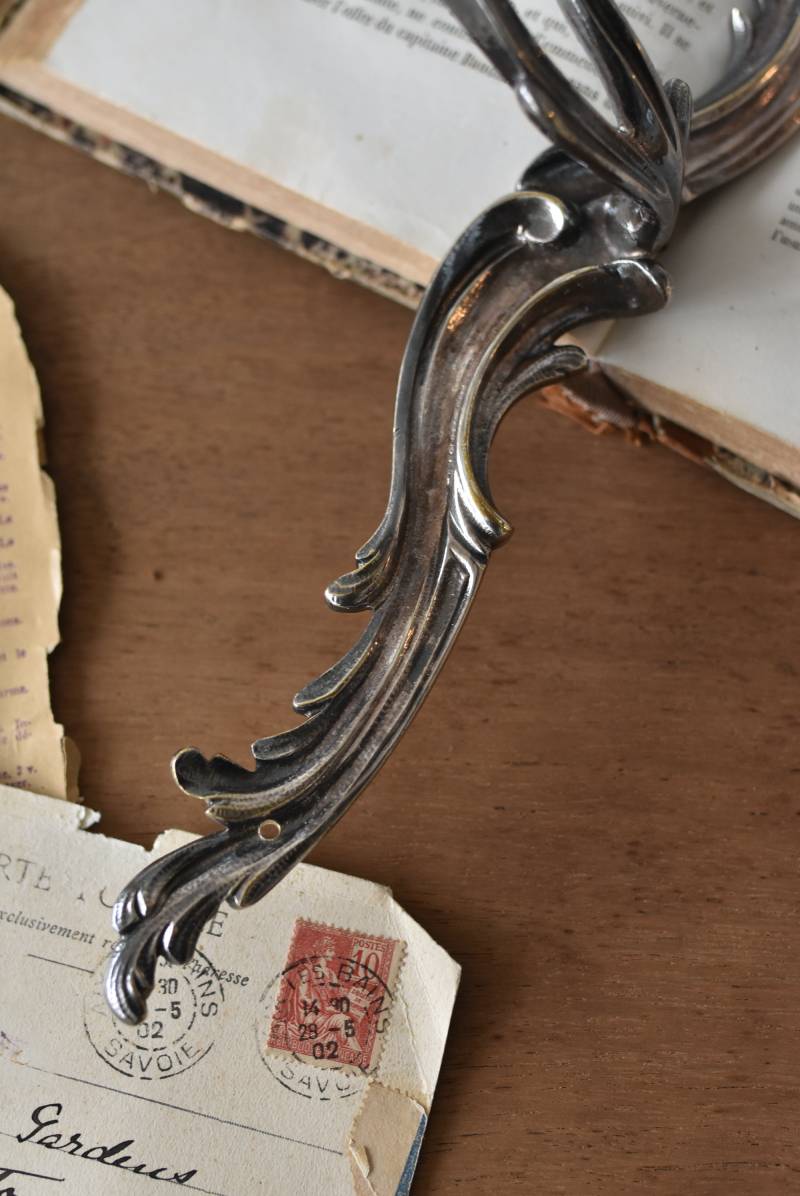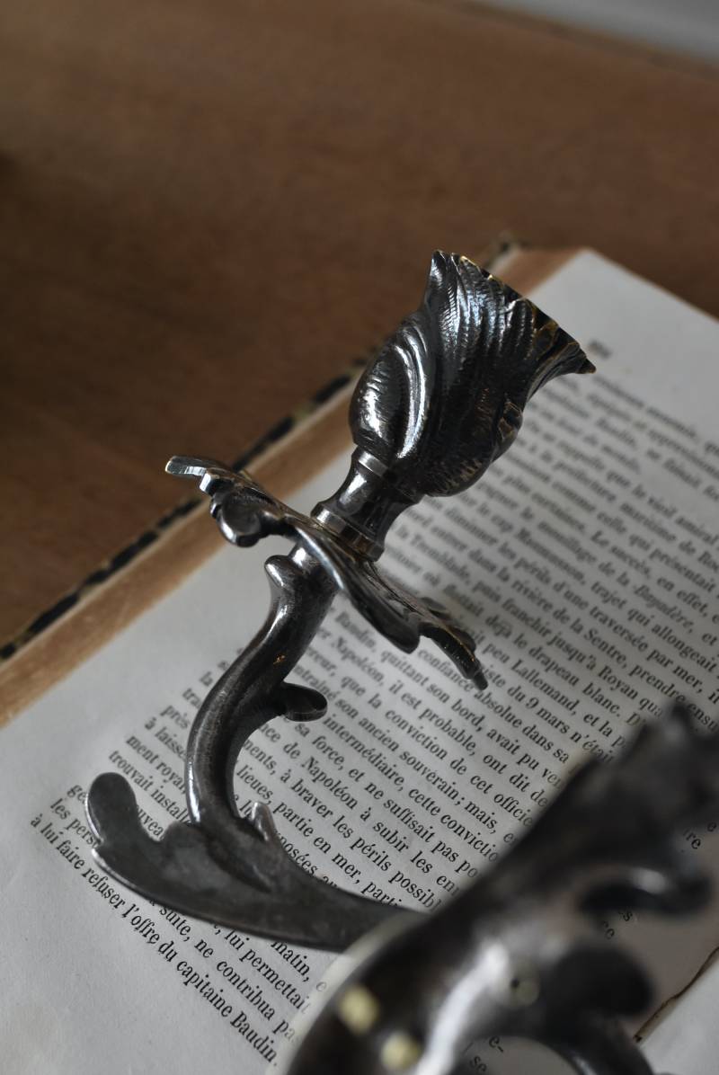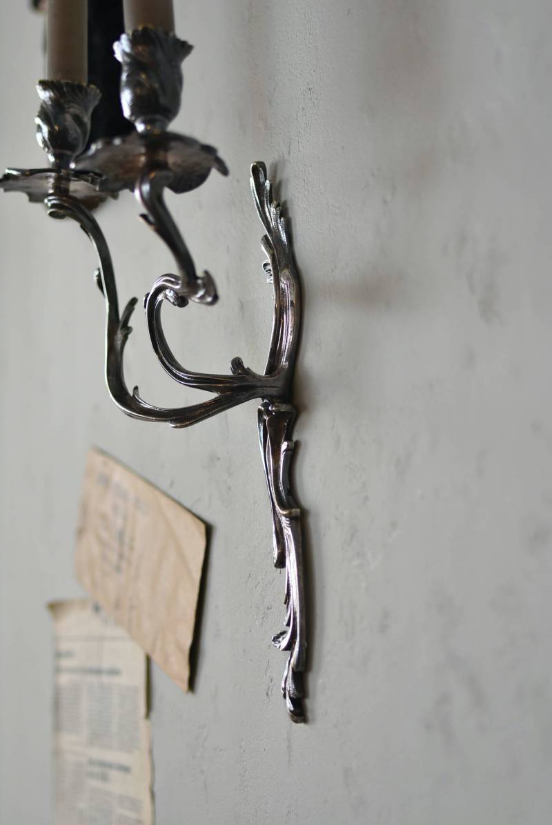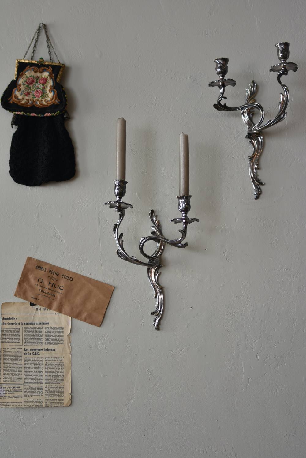 フランスの2灯キャンドルスタンド。 植物を模した繊細な曲線が織りなす優雅なシルエットが目を惹く魅力的な佇まい。凛とした涼やかさを漂わせてくれるシルバーカラーで、アカンサスの葉をモチーフとした表面装飾とアシンメトリーな作りが特徴的なロココ様式のデザインとなっています。ボディには固定用の穴が2箇所開けられており、壁に固定してクラシカルなウォールディスプレイを楽しめる逸品に。 左右が反転したようなデザインのキャンドルスタンドとシンメトリーに配置するのも雰囲気が出ておすすめです。 W 約22cm D 約13cm H 約34.5cm 口径 約2cm 重量 約0.8kg