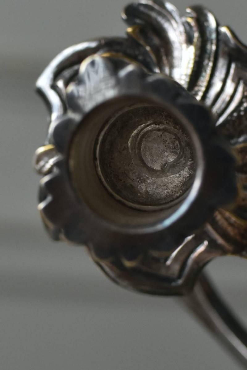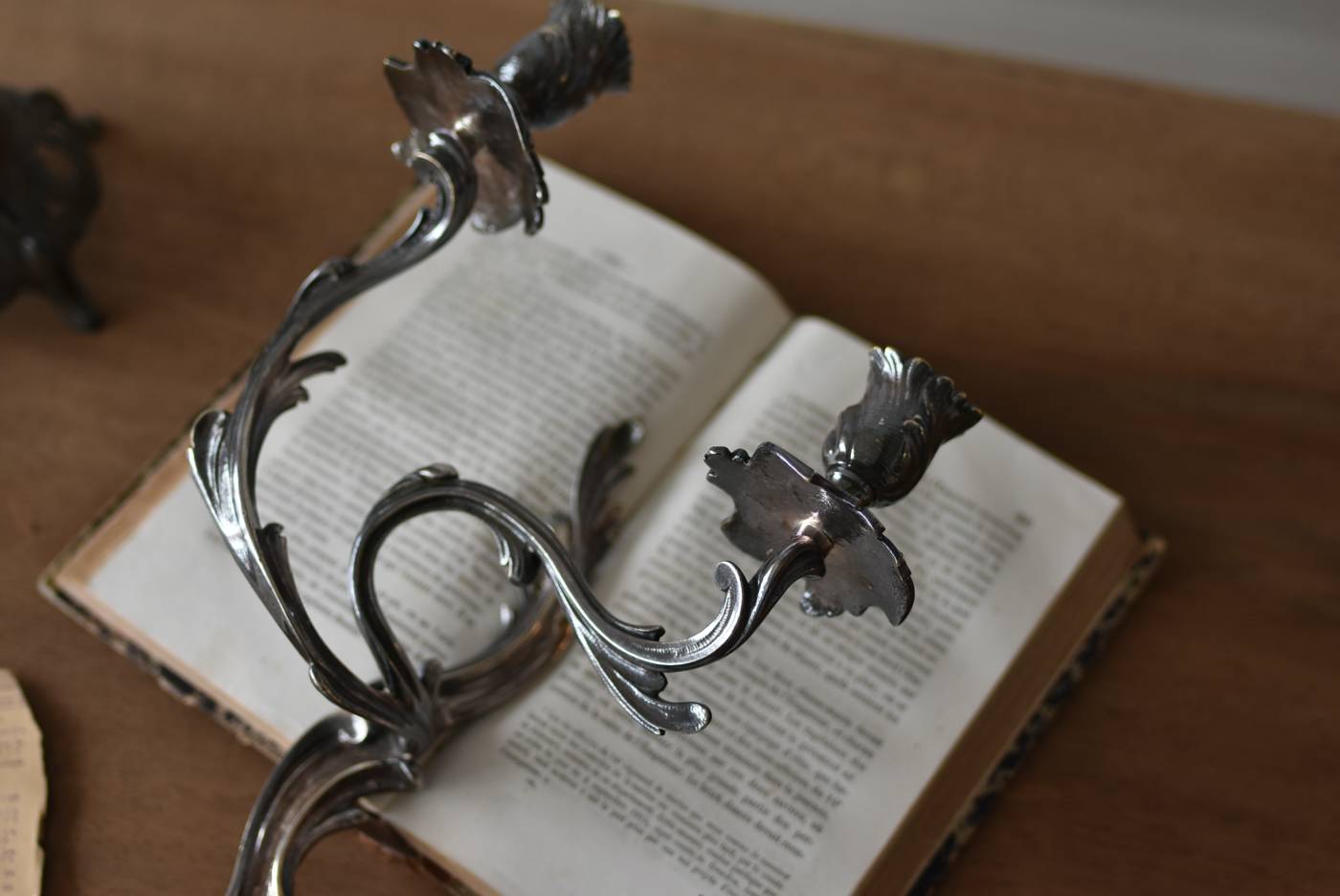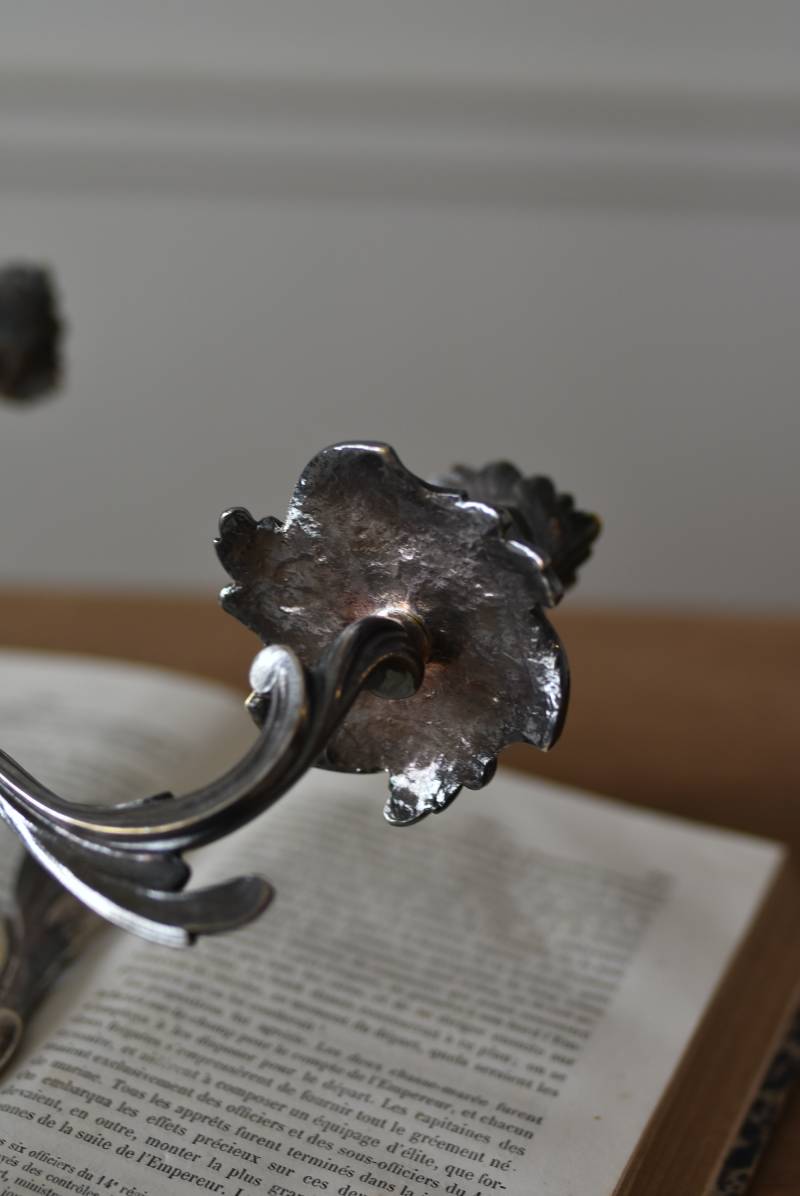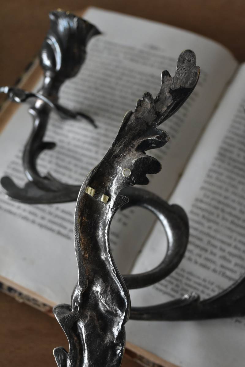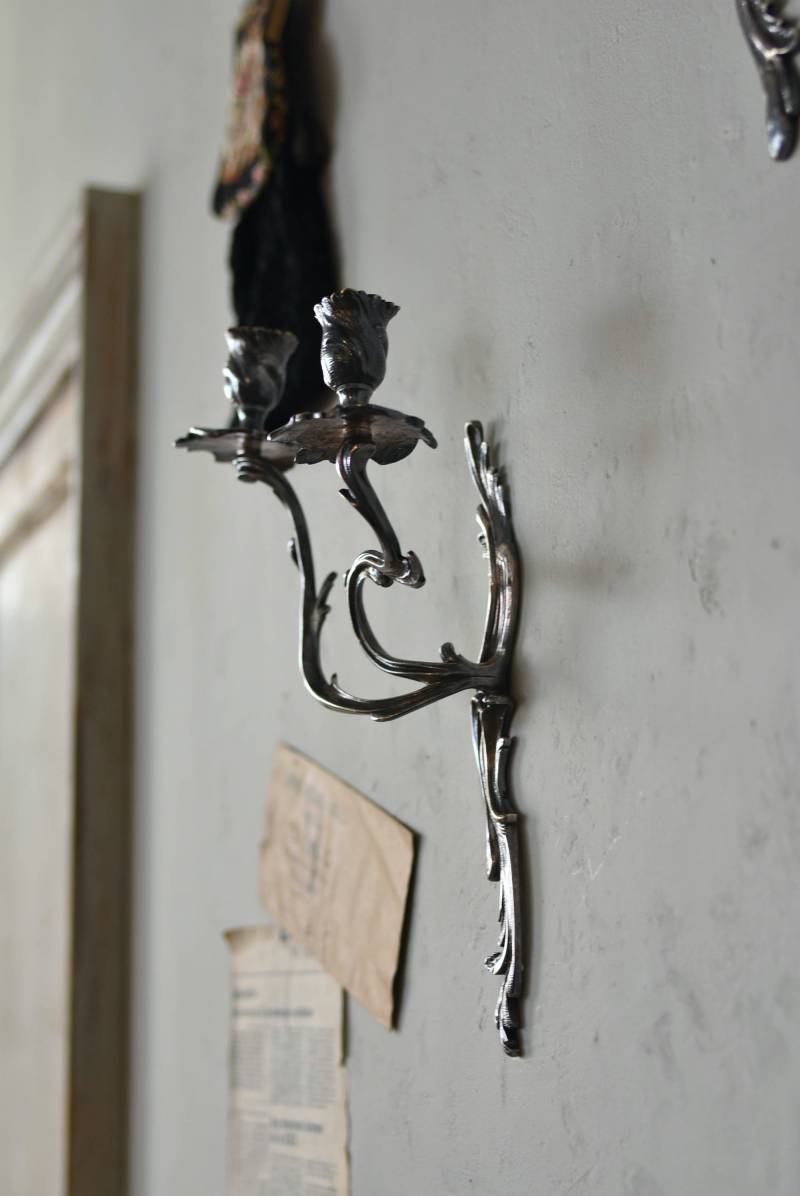 フランスの2灯キャンドルスタンド。 植物を模した繊細な曲線が織りなす優雅なシルエットが目を惹く魅力的な佇まい。凛とした涼やかさを漂わせてくれるシルバーカラーで、アカンサスの葉をモチーフとした表面装飾とアシンメトリーな作りが特徴的なロココ様式のデザインとなっています。ボディには固定用の穴が2箇所開けられており、壁に固定してクラシカルなウォールディスプレイを楽しめる逸品に。 左右が反転したようなデザインのキャンドルスタンドとシンメトリーに配置するのも雰囲気が出ておすすめです。 W 約22cm D 約13cm H 約34.5cm 口径 約2cm 重量 約0.8kg