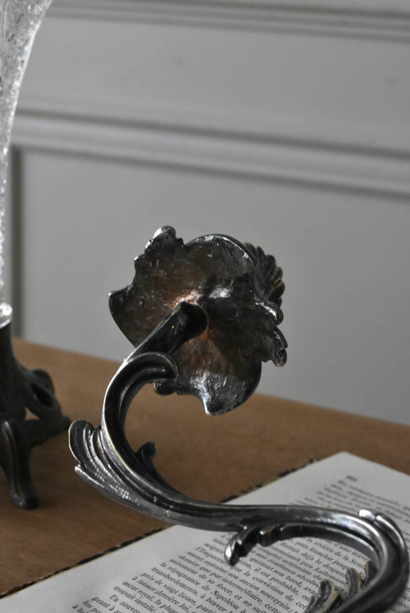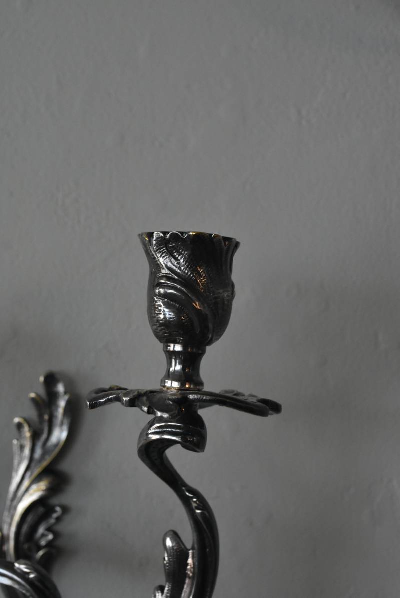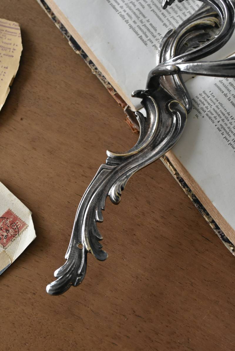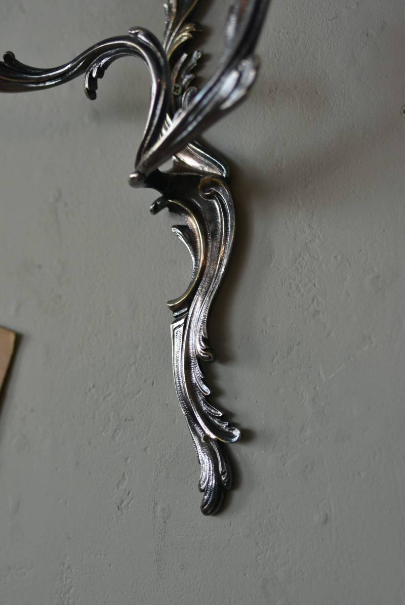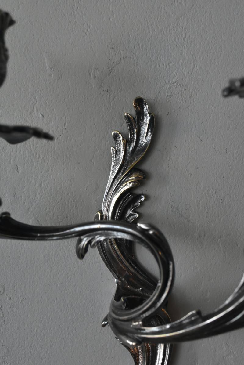 フランスの2灯キャンドルスタンド。 植物を模した繊細な曲線が織りなす優雅なシルエットが目を惹く魅力的な佇まい。凛とした涼やかさを漂わせてくれるシルバーカラーで、アカンサスの葉をモチーフとした表面装飾とアシンメトリーな作りが特徴的なロココ様式のデザインとなっています。ボディには固定用の穴が2箇所開けられており、壁に固定してクラシカルなウォールディスプレイを楽しめる逸品に。 左右が反転したようなデザインのキャンドルスタンドとシンメトリーに配置するのも雰囲気が出ておすすめです。 W 約21.5cm D 約14cm H 約35cm 口径 約2cm 重量 約0.8kg