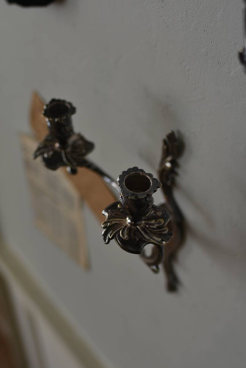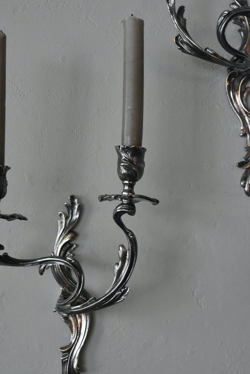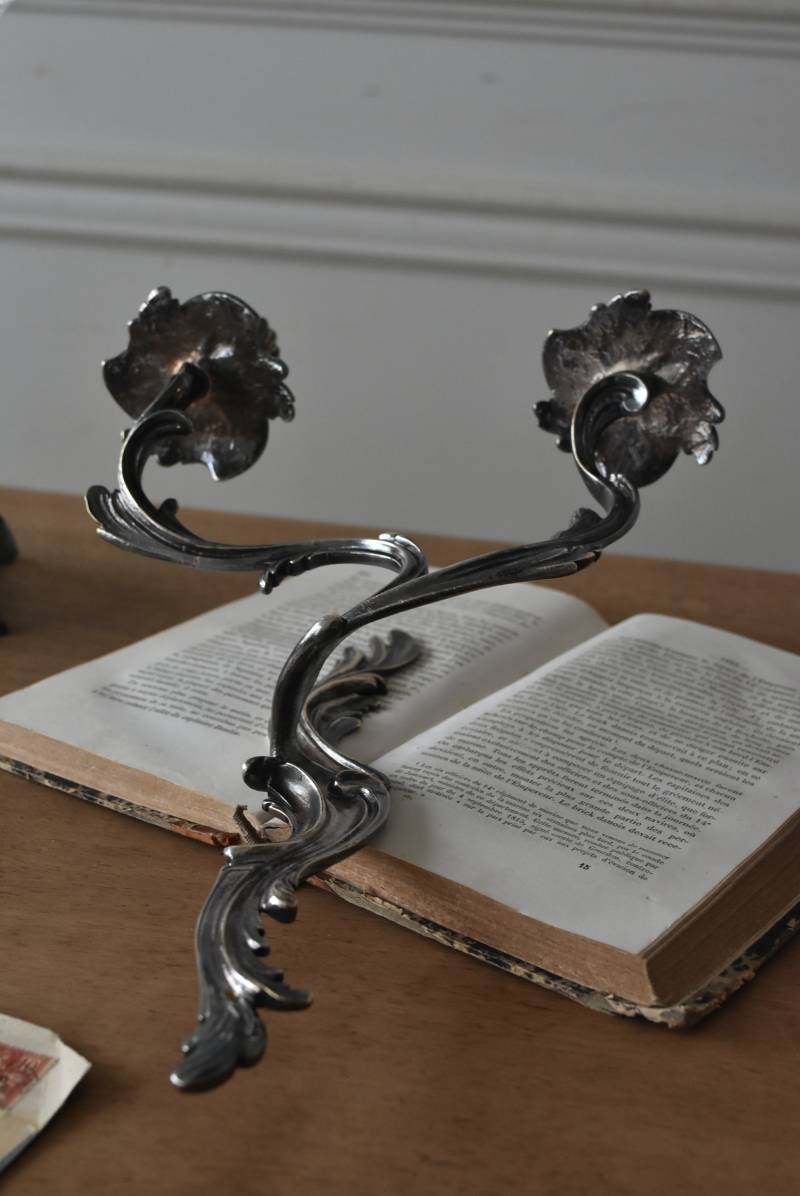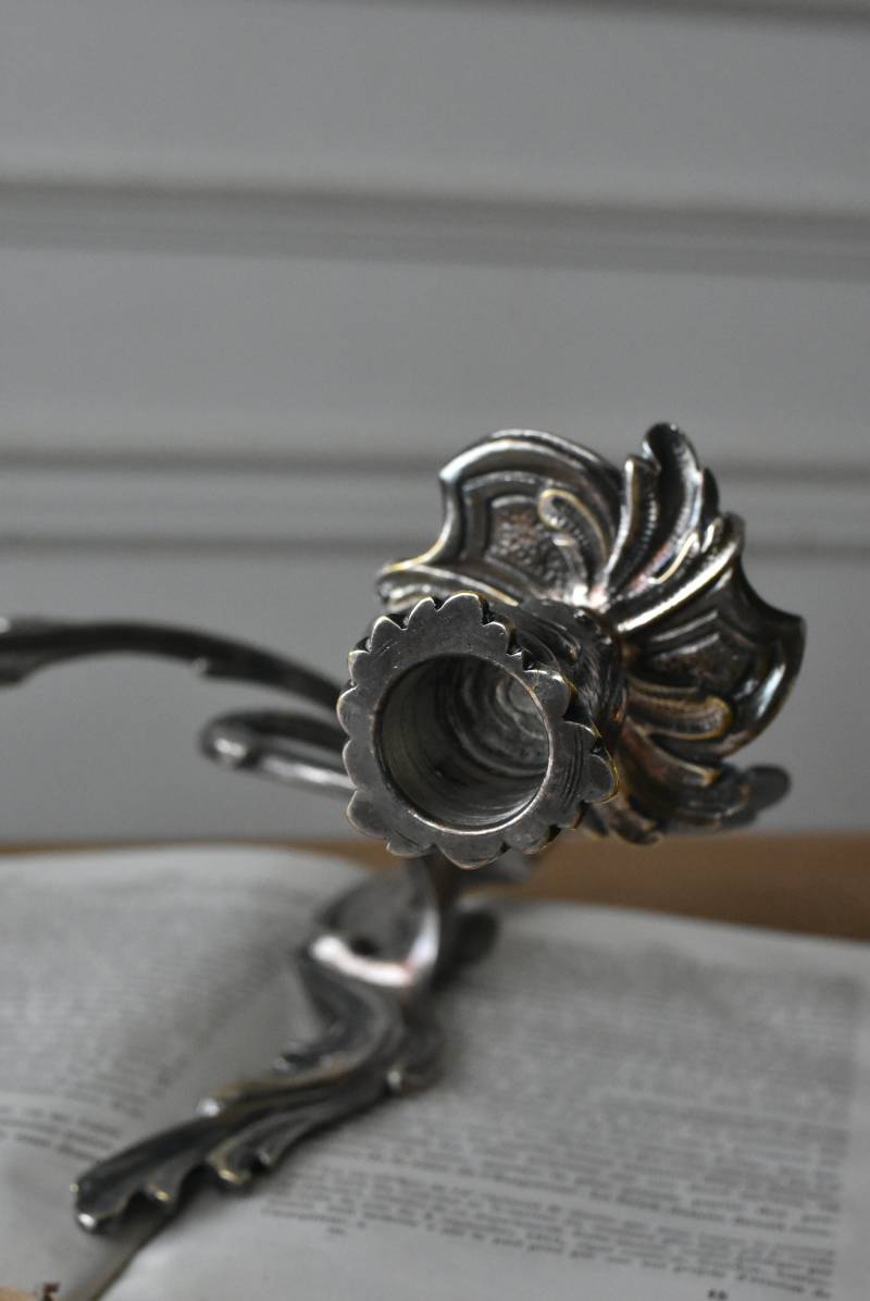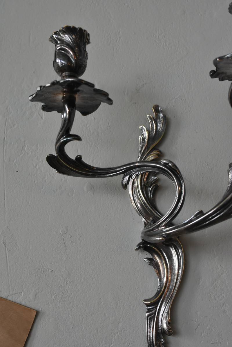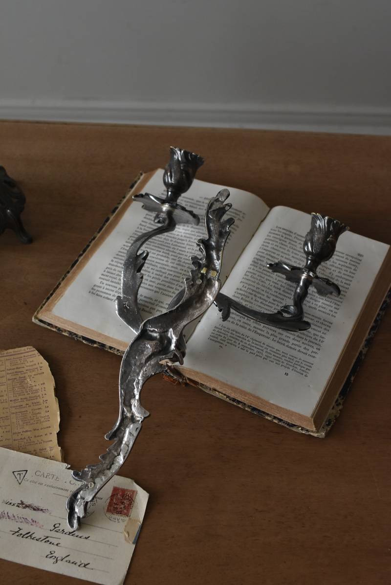 フランスの2灯キャンドルスタンド。 植物を模した繊細な曲線が織りなす優雅なシルエットが目を惹く魅力的な佇まい。凛とした涼やかさを漂わせてくれるシルバーカラーで、アカンサスの葉をモチーフとした表面装飾とアシンメトリーな作りが特徴的なロココ様式のデザインとなっています。ボディには固定用の穴が2箇所開けられており、壁に固定してクラシカルなウォールディスプレイを楽しめる逸品に。 左右が反転したようなデザインのキャンドルスタンドとシンメトリーに配置するのも雰囲気が出ておすすめです。 W 約21.5cm D 約14cm H 約35cm 口径 約2cm 重量 約0.8kg