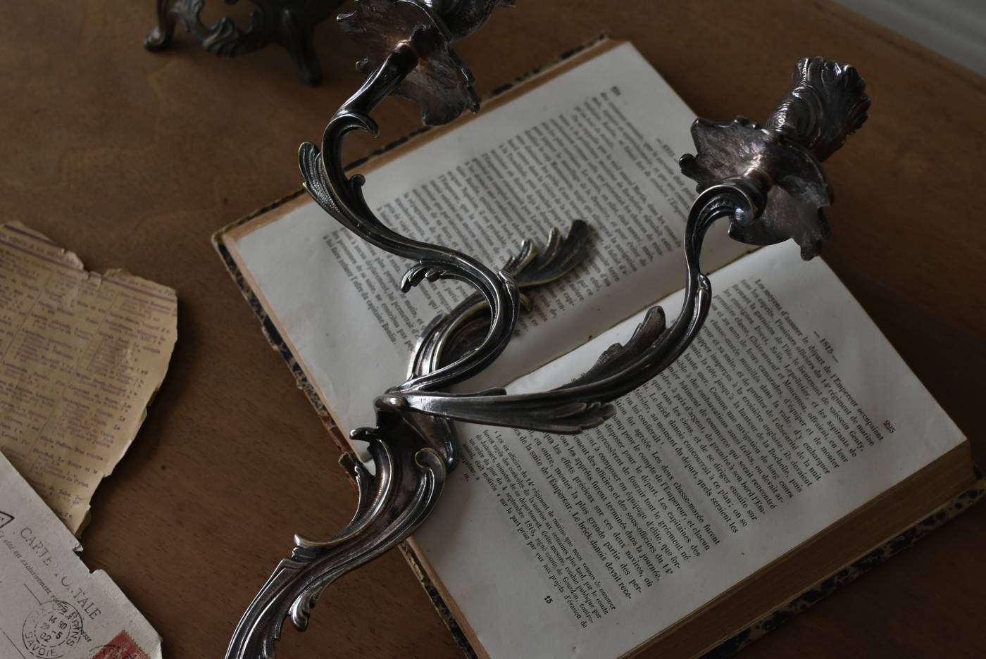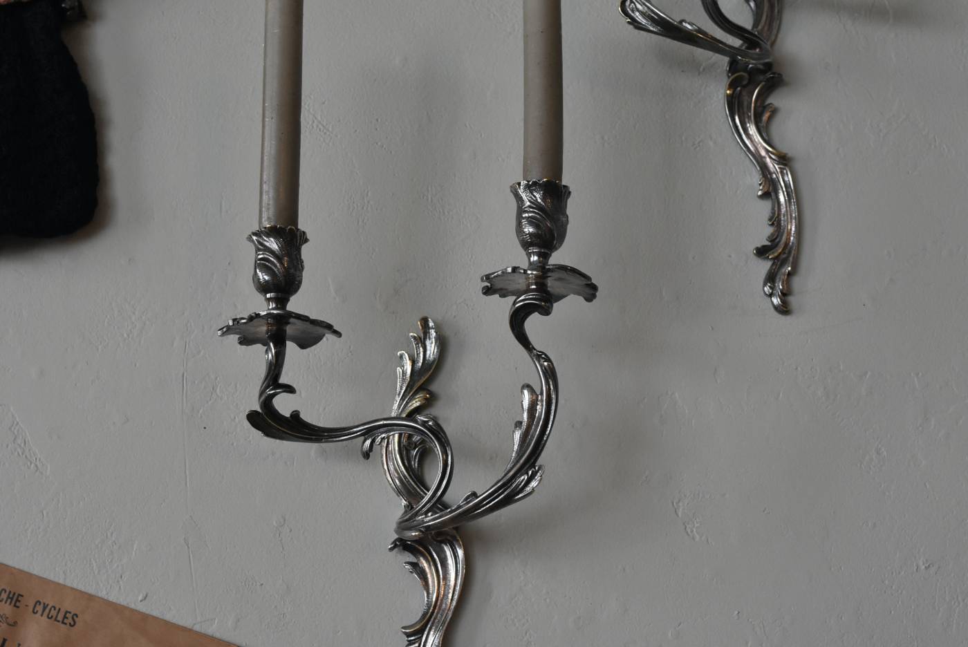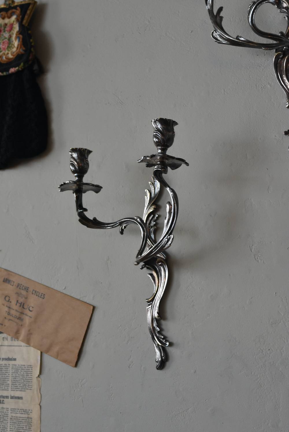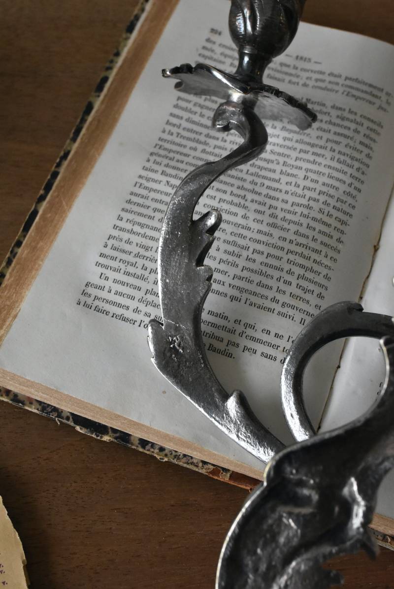 フランスの2灯キャンドルスタンド。 植物を模した繊細な曲線が織りなす優雅なシルエットが目を惹く魅力的な佇まい。凛とした涼やかさを漂わせてくれるシルバーカラーで、アカンサスの葉をモチーフとした表面装飾とアシンメトリーな作りが特徴的なロココ様式のデザインとなっています。ボディには固定用の穴が2箇所開けられており、壁に固定してクラシカルなウォールディスプレイを楽しめる逸品に。 左右が反転したようなデザインのキャンドルスタンドとシンメトリーに配置するのも雰囲気が出ておすすめです。 W 約21.5cm D 約14cm H 約35cm 口径 約2cm 重量 約0.8kg