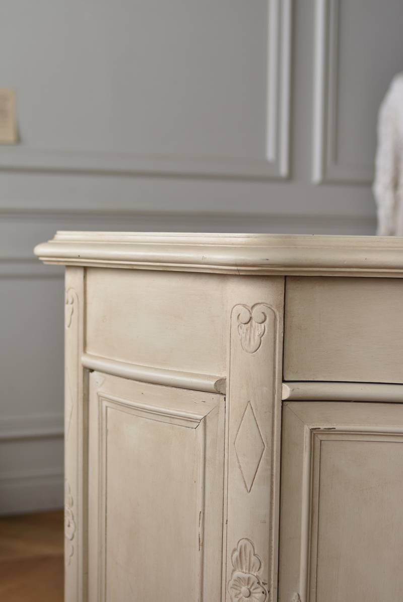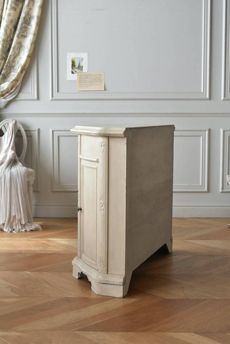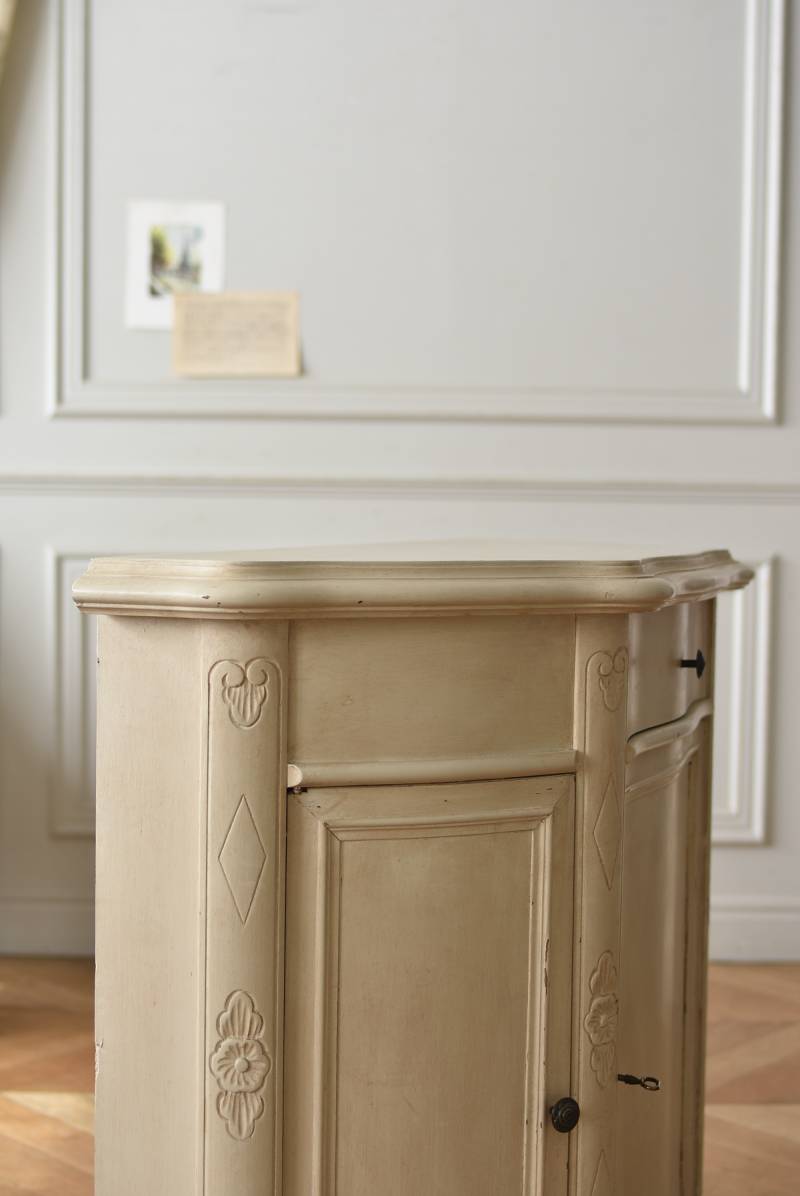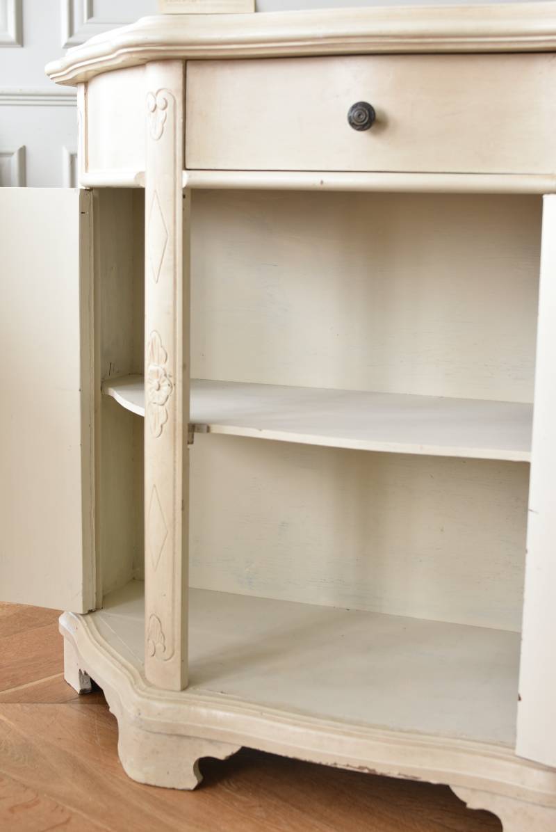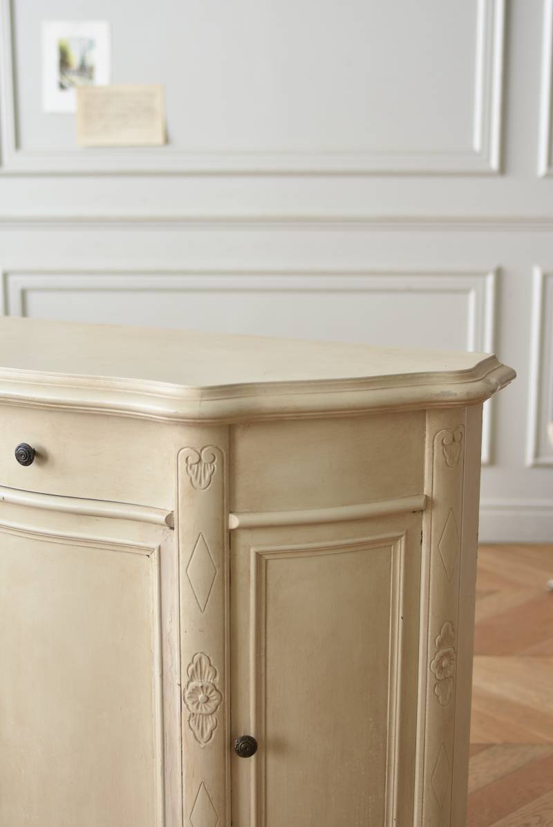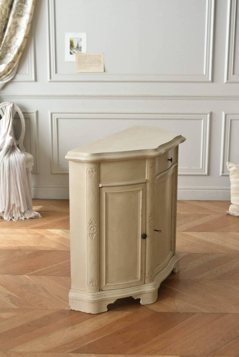 フランスのアンティークペイントキャビネット。 ほんのり黄みがかった柔らかな印象のアイボリーカラーにペイントされ、長く使い込まれたシャビーシックな表情が魅力的。緩やかな波打ちラインが美しい独創的なボディシルエットがパッと目を惹き、お気に入りのランプやミラーなどを飾って壁面空間をより素敵に演出できる雰囲気たっぷりなデザインです。正面に引き出しが一つ、3つの扉内には棚板のある収納スペースが設けられており、機能的にも優れた逸品に。 フロント部分にあしらわれたさりげない彫り模様と脚元のユニークな造形がアクセントになったフレンチシックな装いで、インテリアとしても絵になる上品な印象のアイテムです。 W 約103.5cm D 約41cm H 約86cm 棚板間隔(上から) 約26cm/約29.7cm 棚板面積 W約92cm×D約13~34cm 引き出し内寸 W約37.5cm×D約30~31.5cm×H約9.5cm 搬入経路について こちらの商品の配送について