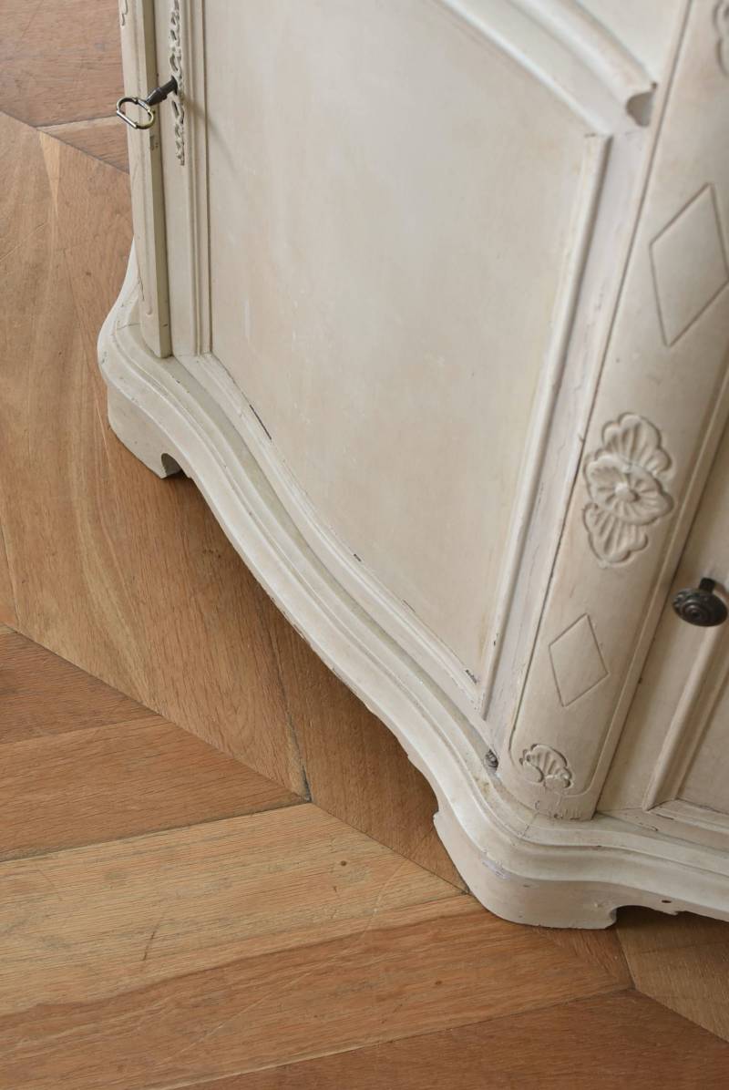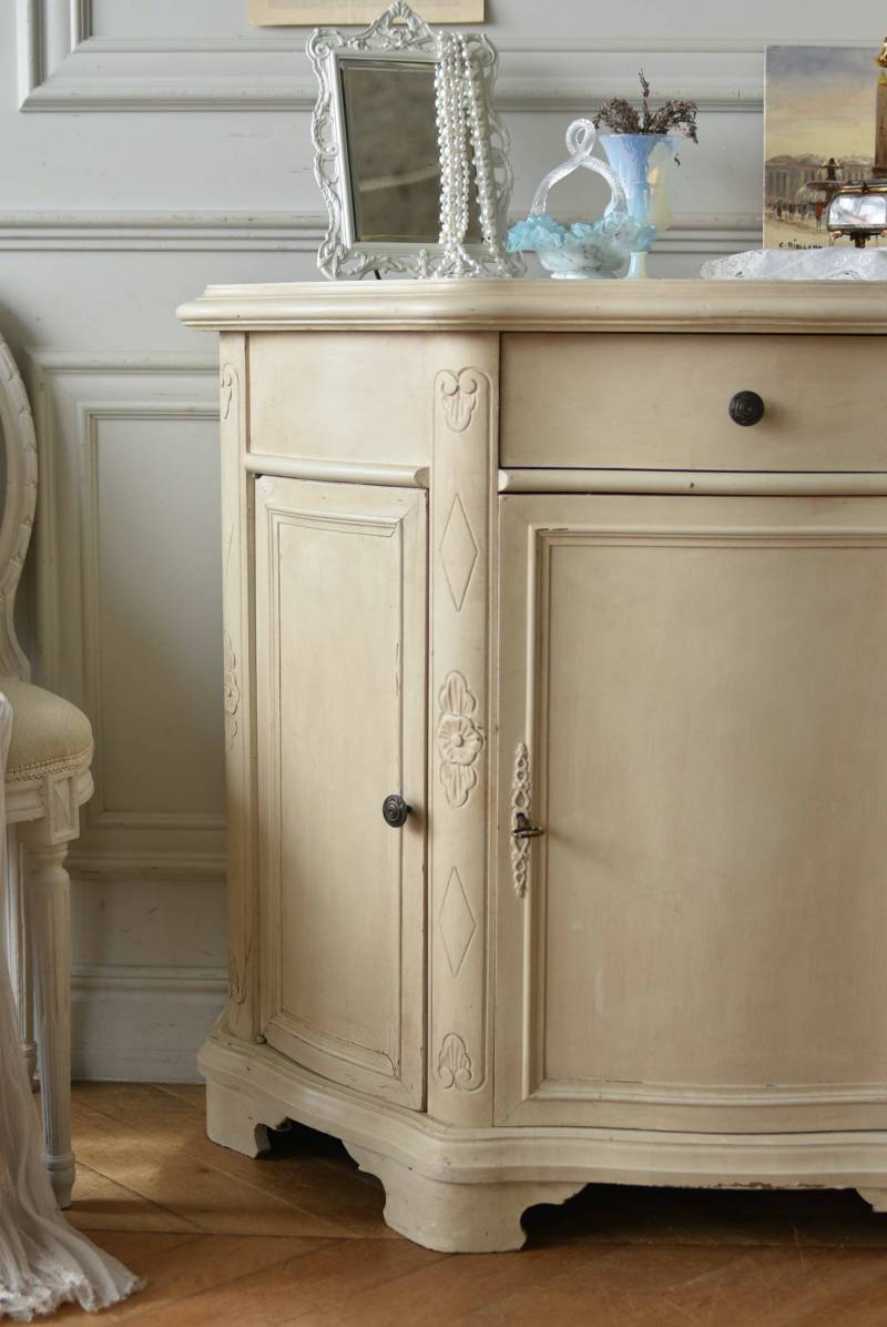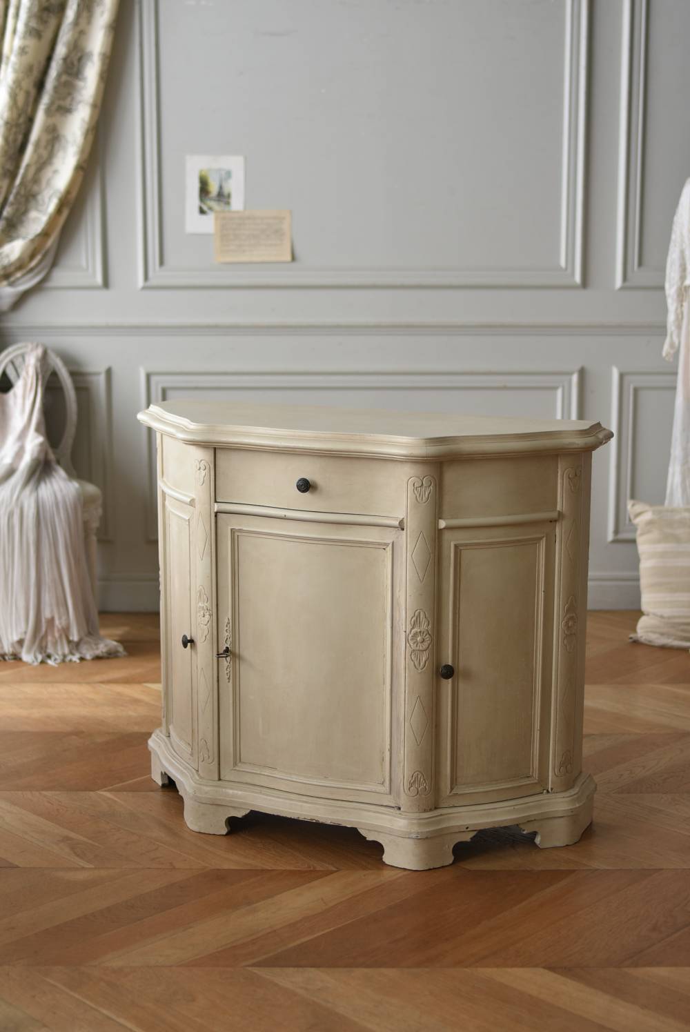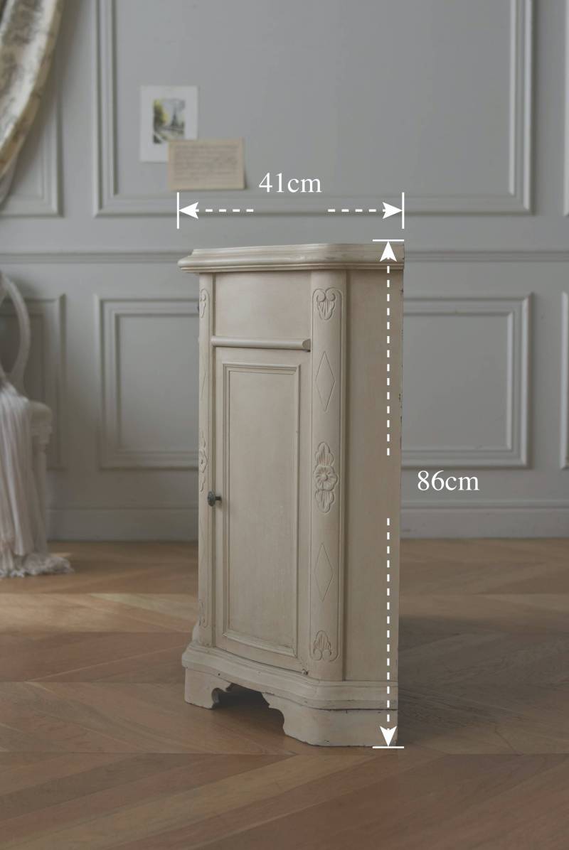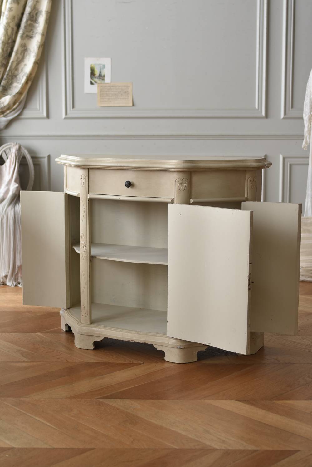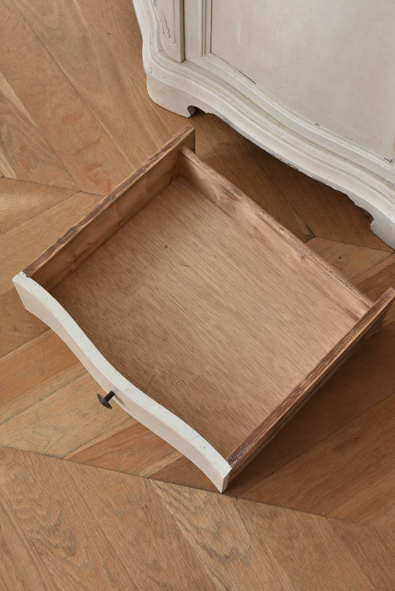 フランスのアンティークペイントキャビネット。 ほんのり黄みがかった柔らかな印象のアイボリーカラーにペイントされ、長く使い込まれたシャビーシックな表情が魅力的。緩やかな波打ちラインが美しい独創的なボディシルエットがパッと目を惹き、お気に入りのランプやミラーなどを飾って壁面空間をより素敵に演出できる雰囲気たっぷりなデザインです。正面に引き出しが一つ、3つの扉内には棚板のある収納スペースが設けられており、機能的にも優れた逸品に。 フロント部分にあしらわれたさりげない彫り模様と脚元のユニークな造形がアクセントになったフレンチシックな装いで、インテリアとしても絵になる上品な印象のアイテムです。 W 約103.5cm D 約41cm H 約86cm 棚板間隔(上から) 約26cm/約29.7cm 棚板面積 W約92cm×D約13~34cm 引き出し内寸 W約37.5cm×D約30~31.5cm×H約9.5cm 搬入経路について こちらの商品の配送について