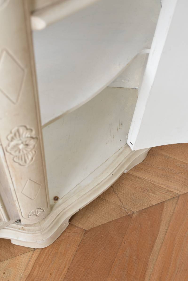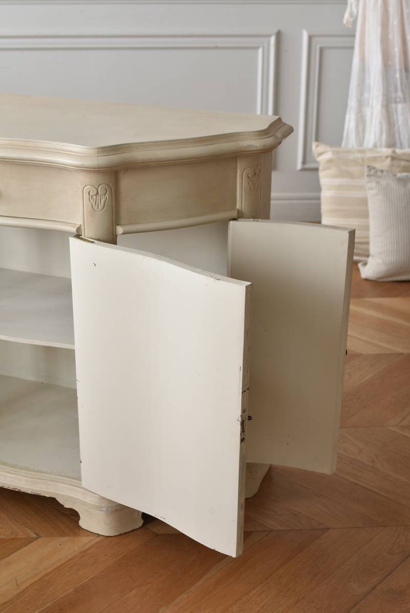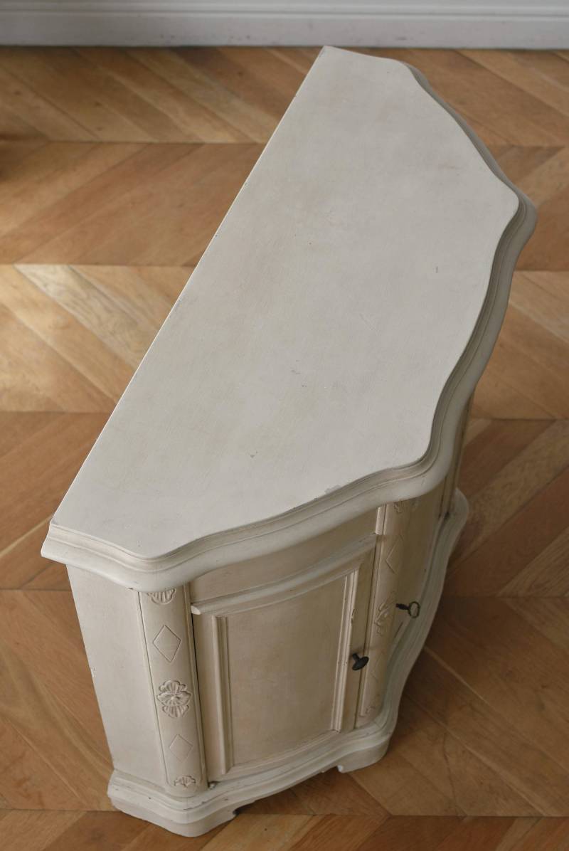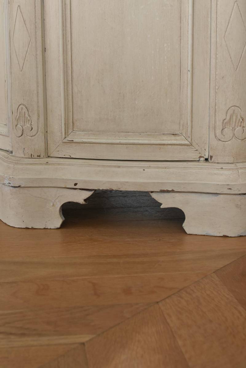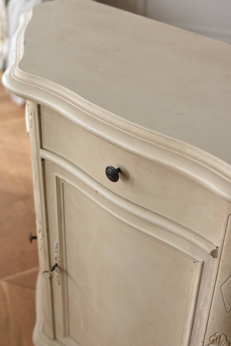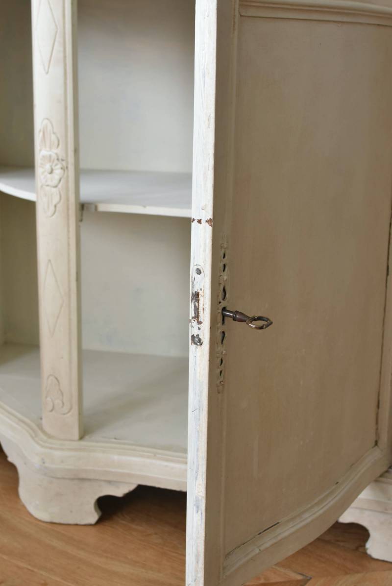 フランスのアンティークペイントキャビネット。 ほんのり黄みがかった柔らかな印象のアイボリーカラーにペイントされ、長く使い込まれたシャビーシックな表情が魅力的。緩やかな波打ちラインが美しい独創的なボディシルエットがパッと目を惹き、お気に入りのランプやミラーなどを飾って壁面空間をより素敵に演出できる雰囲気たっぷりなデザインです。正面に引き出しが一つ、3つの扉内には棚板のある収納スペースが設けられており、機能的にも優れた逸品に。 フロント部分にあしらわれたさりげない彫り模様と脚元のユニークな造形がアクセントになったフレンチシックな装いで、インテリアとしても絵になる上品な印象のアイテムです。 W 約103.5cm D 約41cm H 約86cm 棚板間隔(上から) 約26cm/約29.7cm 棚板面積 W約92cm×D約13~34cm 引き出し内寸 W約37.5cm×D約30~31.5cm×H約9.5cm 搬入経路について こちらの商品の配送について