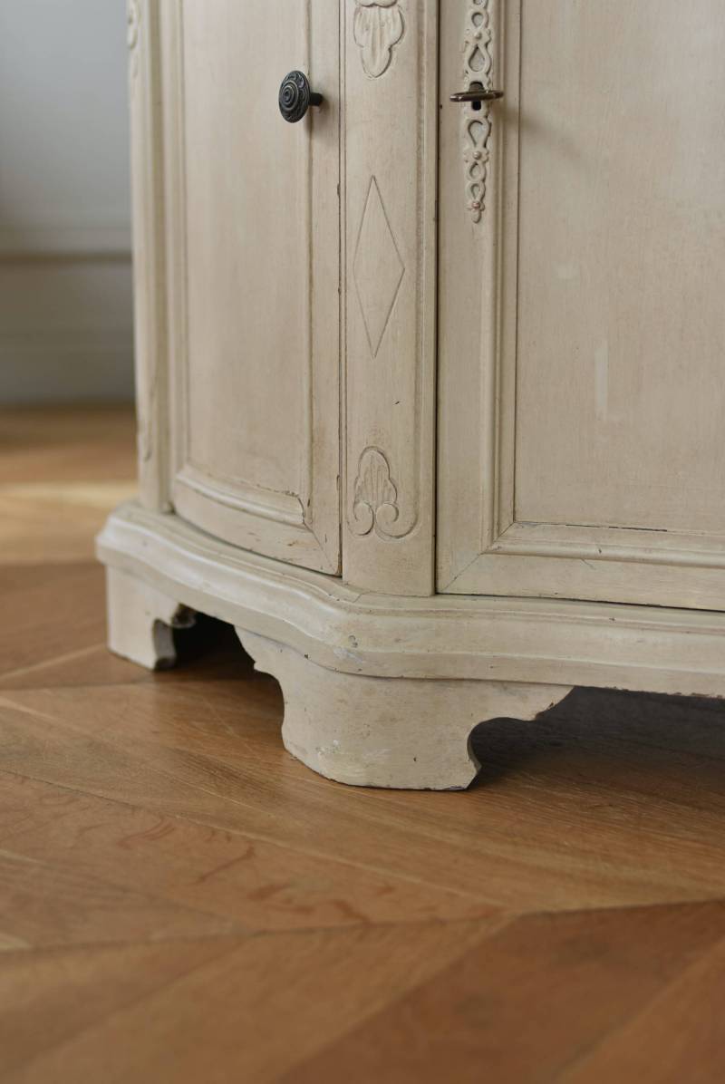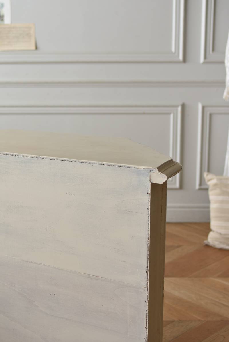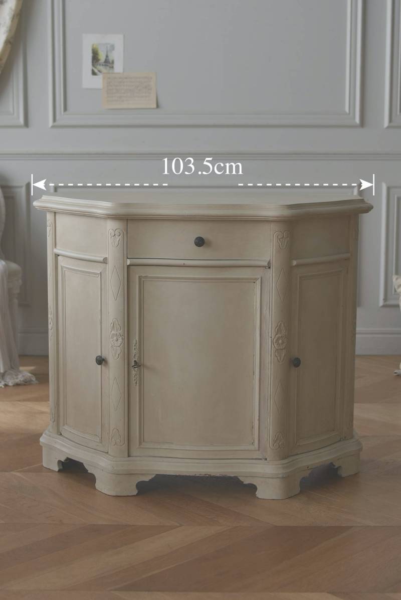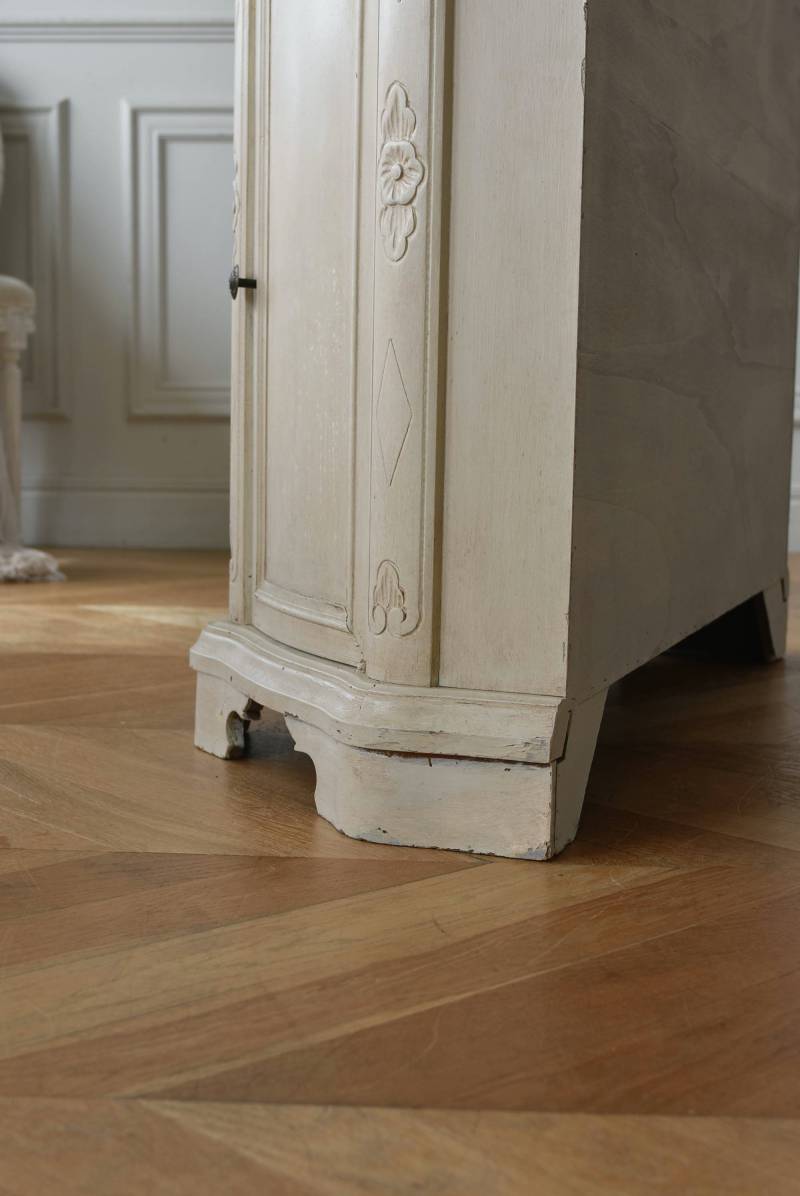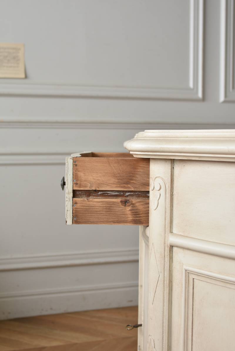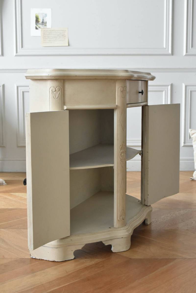 フランスのアンティークペイントキャビネット。 ほんのり黄みがかった柔らかな印象のアイボリーカラーにペイントされ、長く使い込まれたシャビーシックな表情が魅力的。緩やかな波打ちラインが美しい独創的なボディシルエットがパッと目を惹き、お気に入りのランプやミラーなどを飾って壁面空間をより素敵に演出できる雰囲気たっぷりなデザインです。正面に引き出しが一つ、3つの扉内には棚板のある収納スペースが設けられており、機能的にも優れた逸品に。 フロント部分にあしらわれたさりげない彫り模様と脚元のユニークな造形がアクセントになったフレンチシックな装いで、インテリアとしても絵になる上品な印象のアイテムです。 W 約103.5cm D 約41cm H 約86cm 棚板間隔(上から) 約26cm/約29.7cm 棚板面積 W約92cm×D約13~34cm 引き出し内寸 W約37.5cm×D約30~31.5cm×H約9.5cm 搬入経路について こちらの商品の配送について