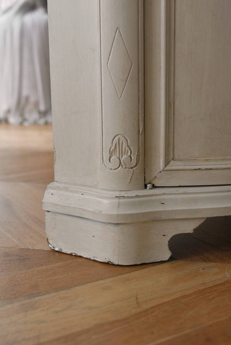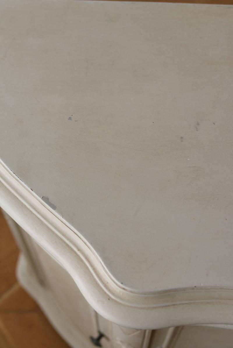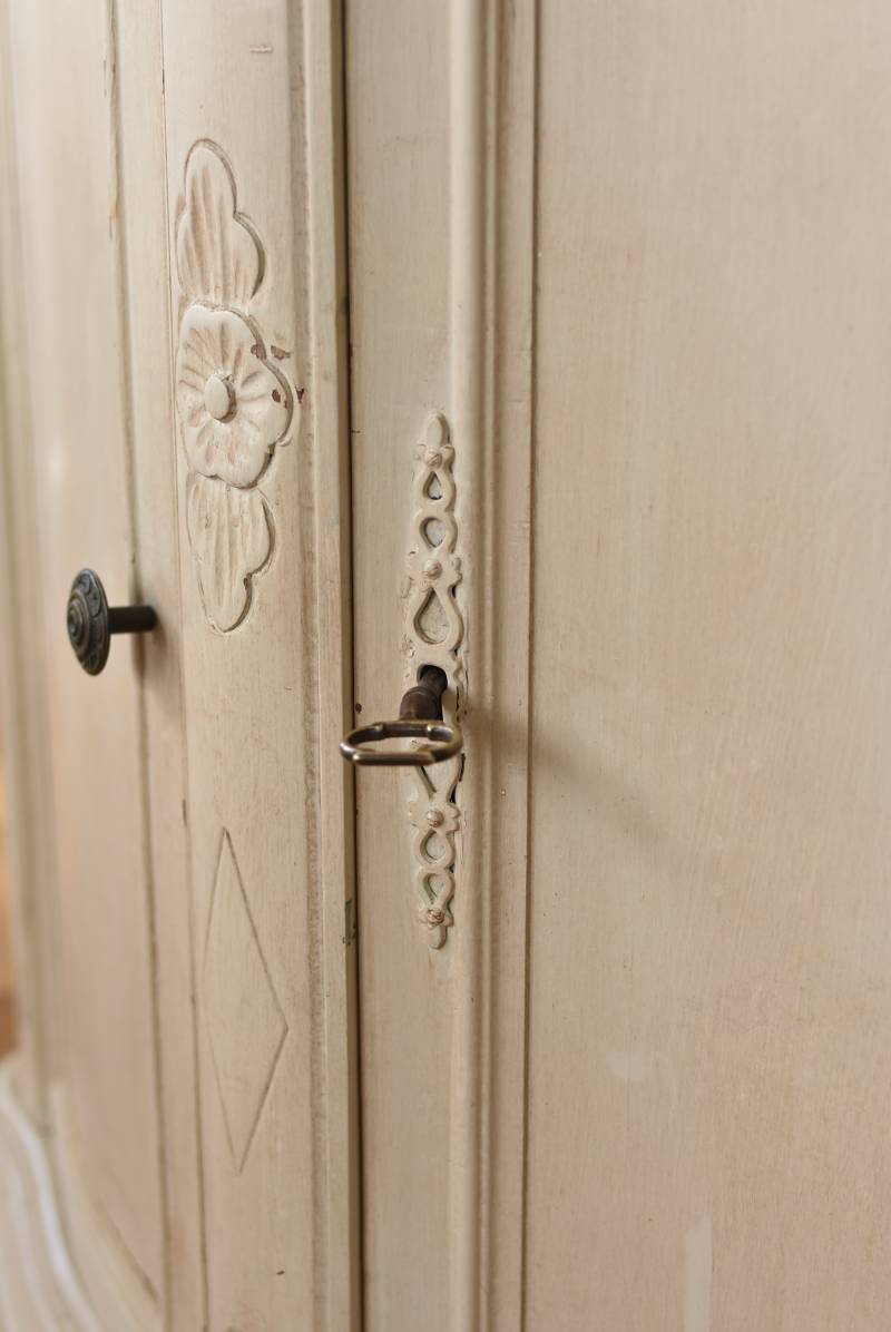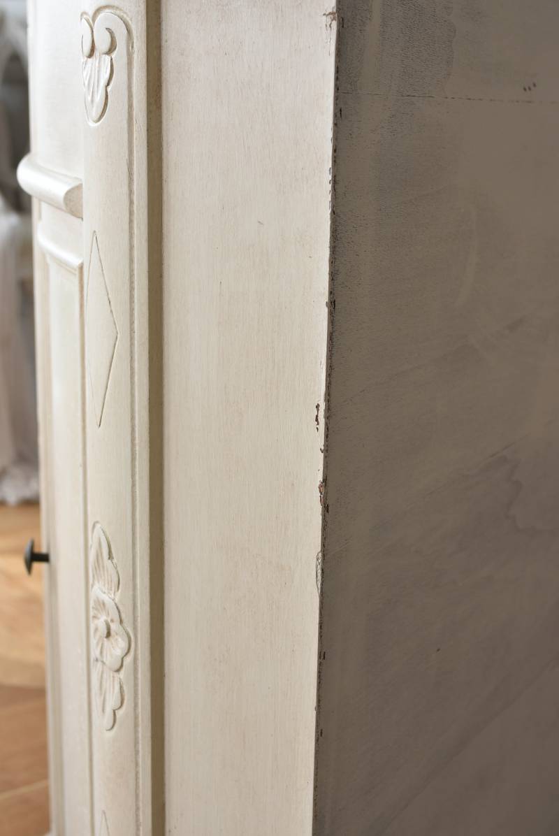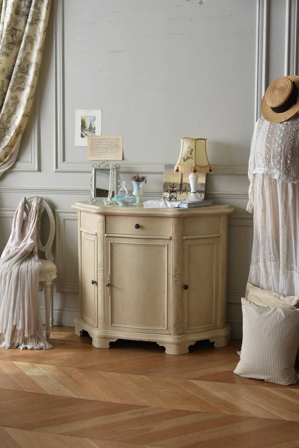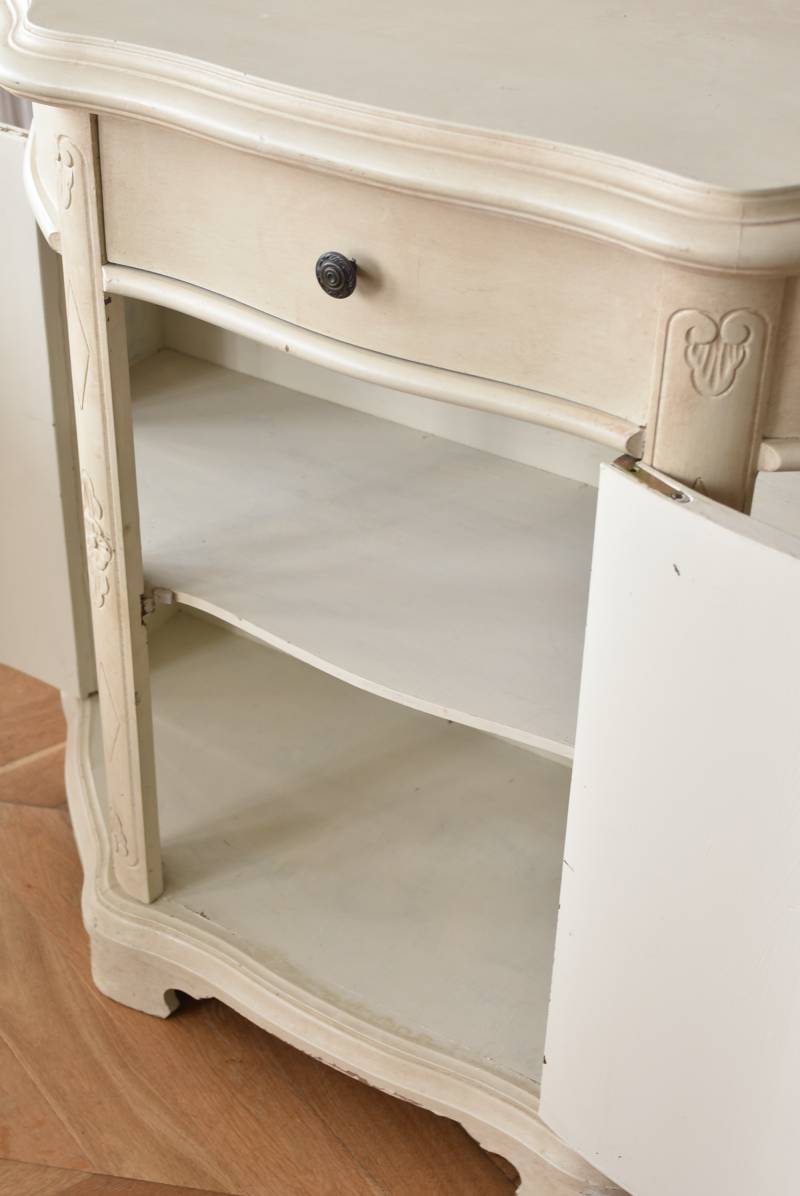 フランスのアンティークペイントキャビネット。 ほんのり黄みがかった柔らかな印象のアイボリーカラーにペイントされ、長く使い込まれたシャビーシックな表情が魅力的。緩やかな波打ちラインが美しい独創的なボディシルエットがパッと目を惹き、お気に入りのランプやミラーなどを飾って壁面空間をより素敵に演出できる雰囲気たっぷりなデザインです。正面に引き出しが一つ、3つの扉内には棚板のある収納スペースが設けられており、機能的にも優れた逸品に。 フロント部分にあしらわれたさりげない彫り模様と脚元のユニークな造形がアクセントになったフレンチシックな装いで、インテリアとしても絵になる上品な印象のアイテムです。 W 約103.5cm D 約41cm H 約86cm 棚板間隔(上から) 約26cm/約29.7cm 棚板面積 W約92cm×D約13~34cm 引き出し内寸 W約37.5cm×D約30~31.5cm×H約9.5cm 搬入経路について こちらの商品の配送について