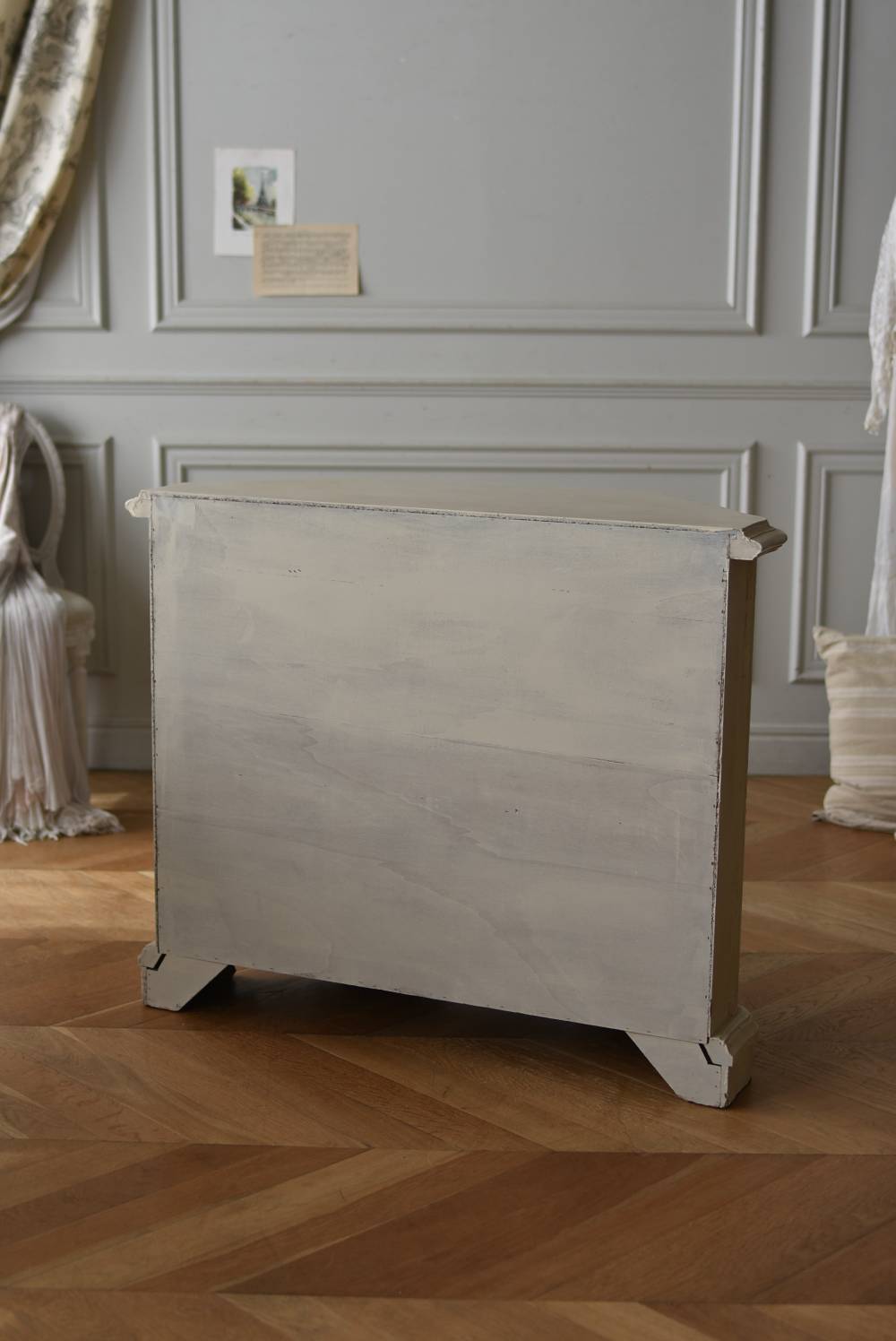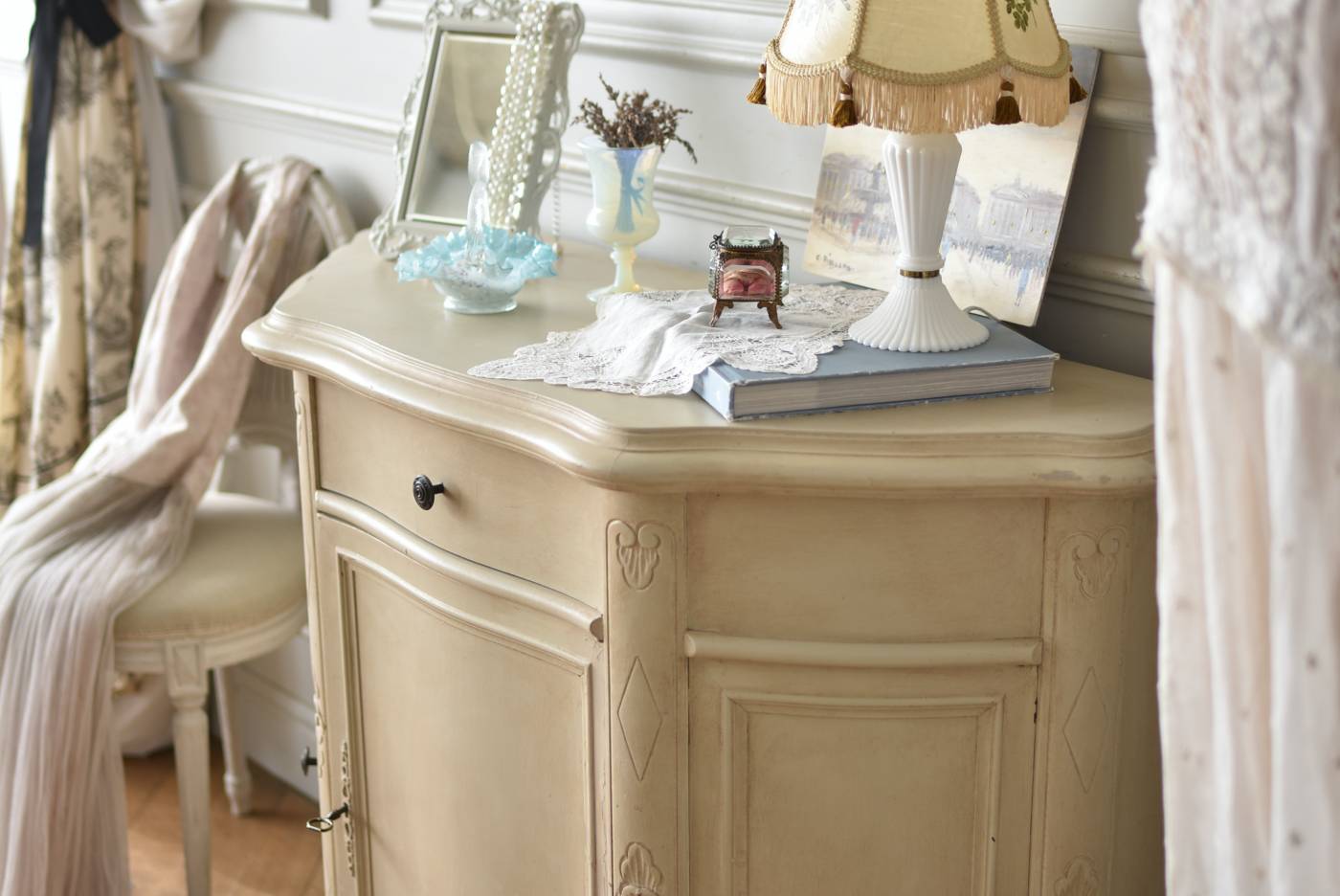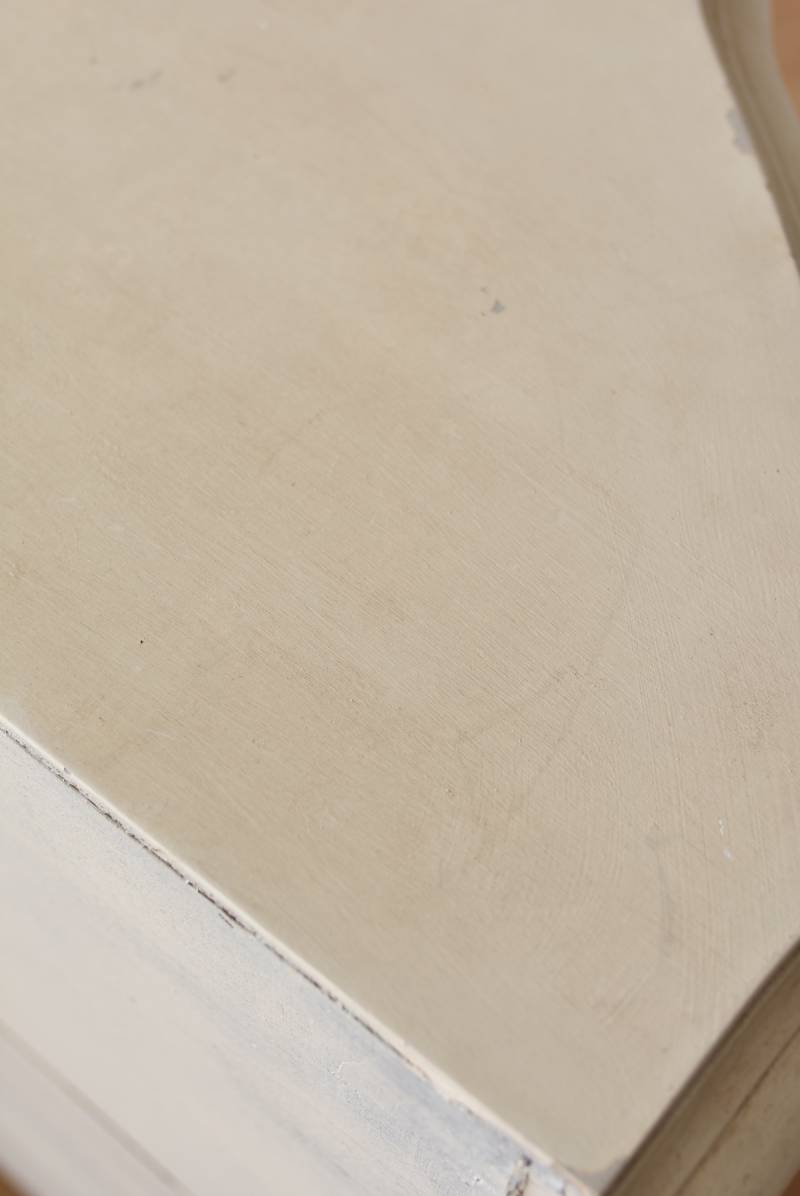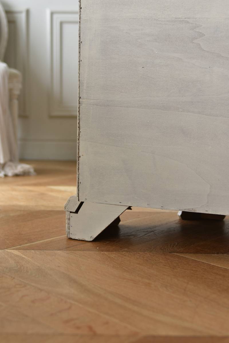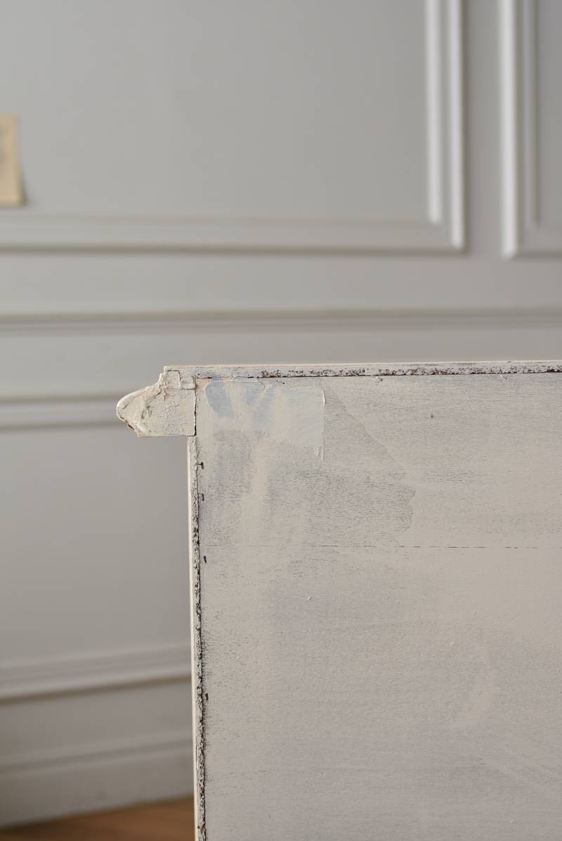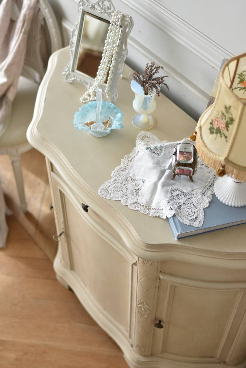 フランスのアンティークペイントキャビネット。 ほんのり黄みがかった柔らかな印象のアイボリーカラーにペイントされ、長く使い込まれたシャビーシックな表情が魅力的。緩やかな波打ちラインが美しい独創的なボディシルエットがパッと目を惹き、お気に入りのランプやミラーなどを飾って壁面空間をより素敵に演出できる雰囲気たっぷりなデザインです。正面に引き出しが一つ、3つの扉内には棚板のある収納スペースが設けられており、機能的にも優れた逸品に。 フロント部分にあしらわれたさりげない彫り模様と脚元のユニークな造形がアクセントになったフレンチシックな装いで、インテリアとしても絵になる上品な印象のアイテムです。 W 約103.5cm D 約41cm H 約86cm 棚板間隔(上から) 約26cm/約29.7cm 棚板面積 W約92cm×D約13~34cm 引き出し内寸 W約37.5cm×D約30~31.5cm×H約9.5cm 搬入経路について こちらの商品の配送について